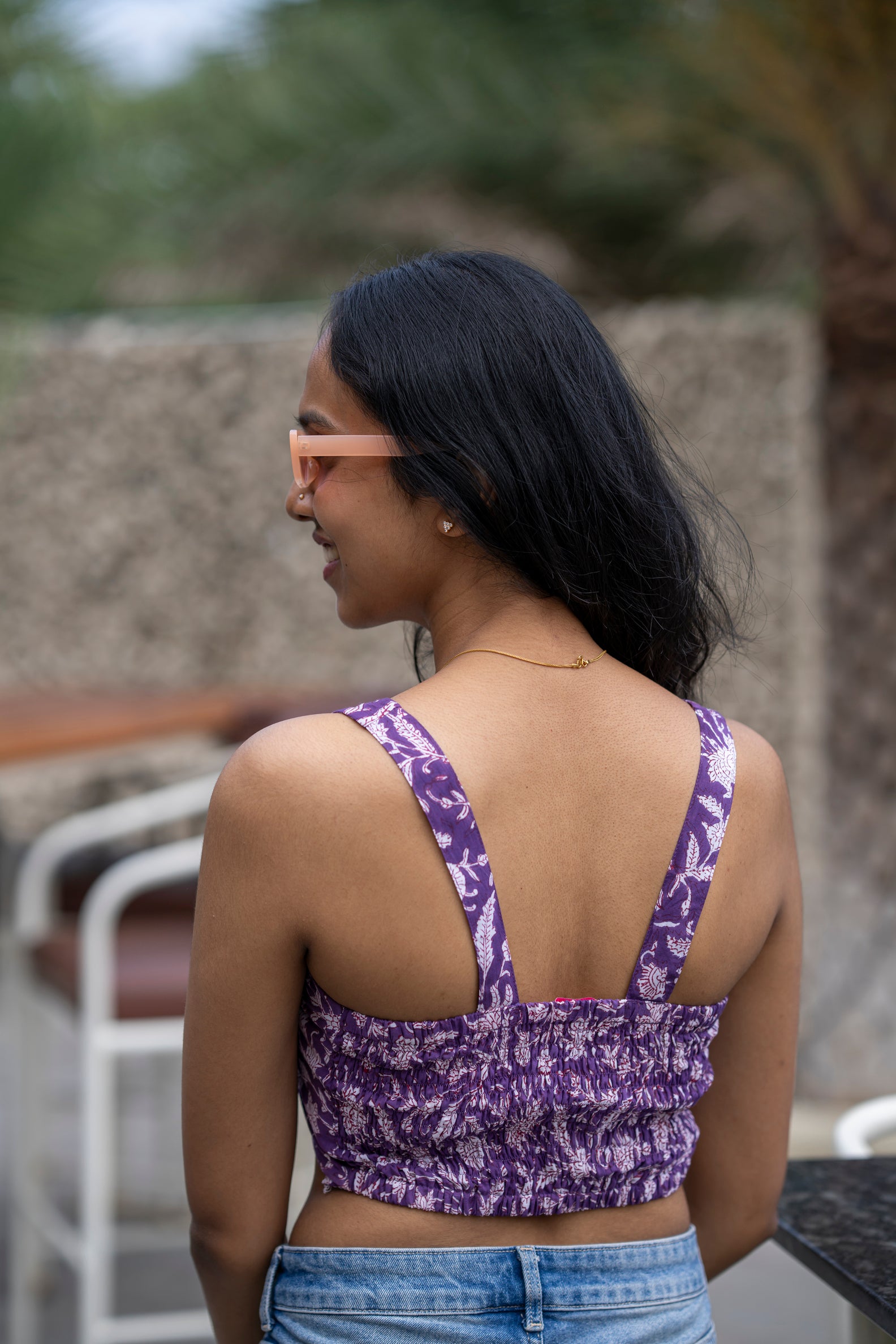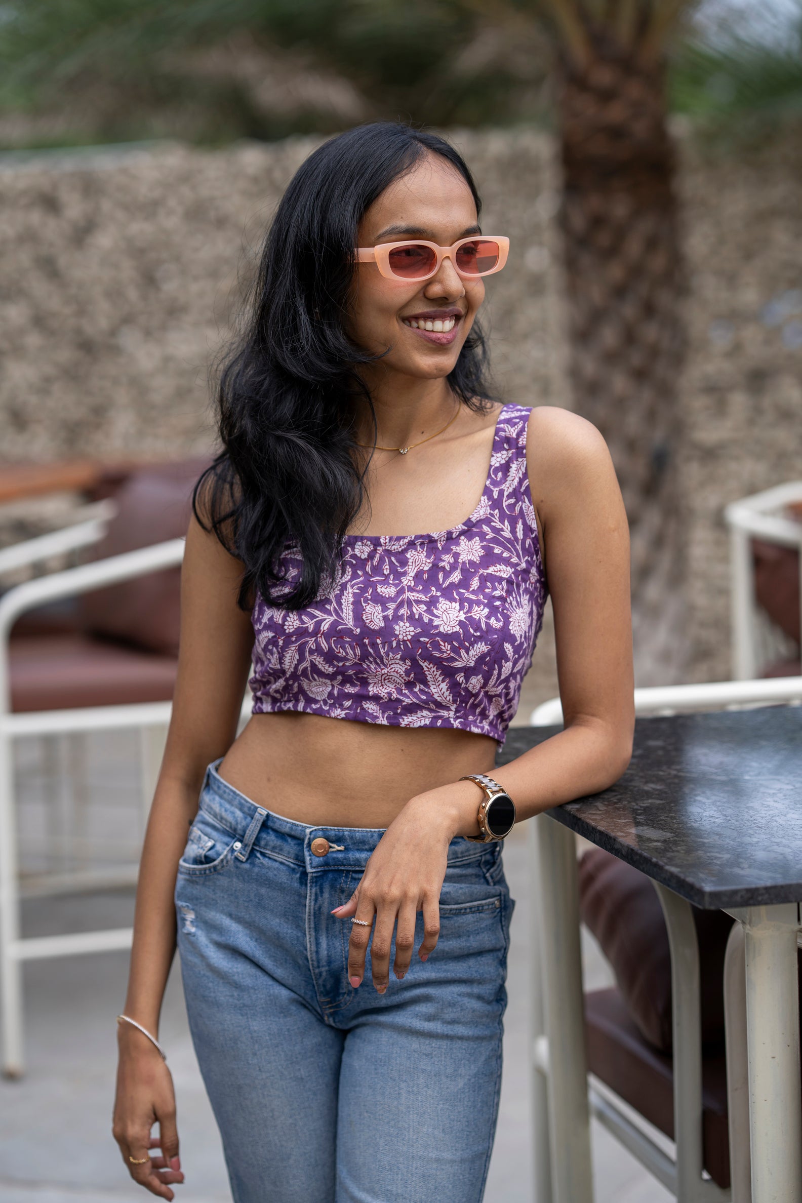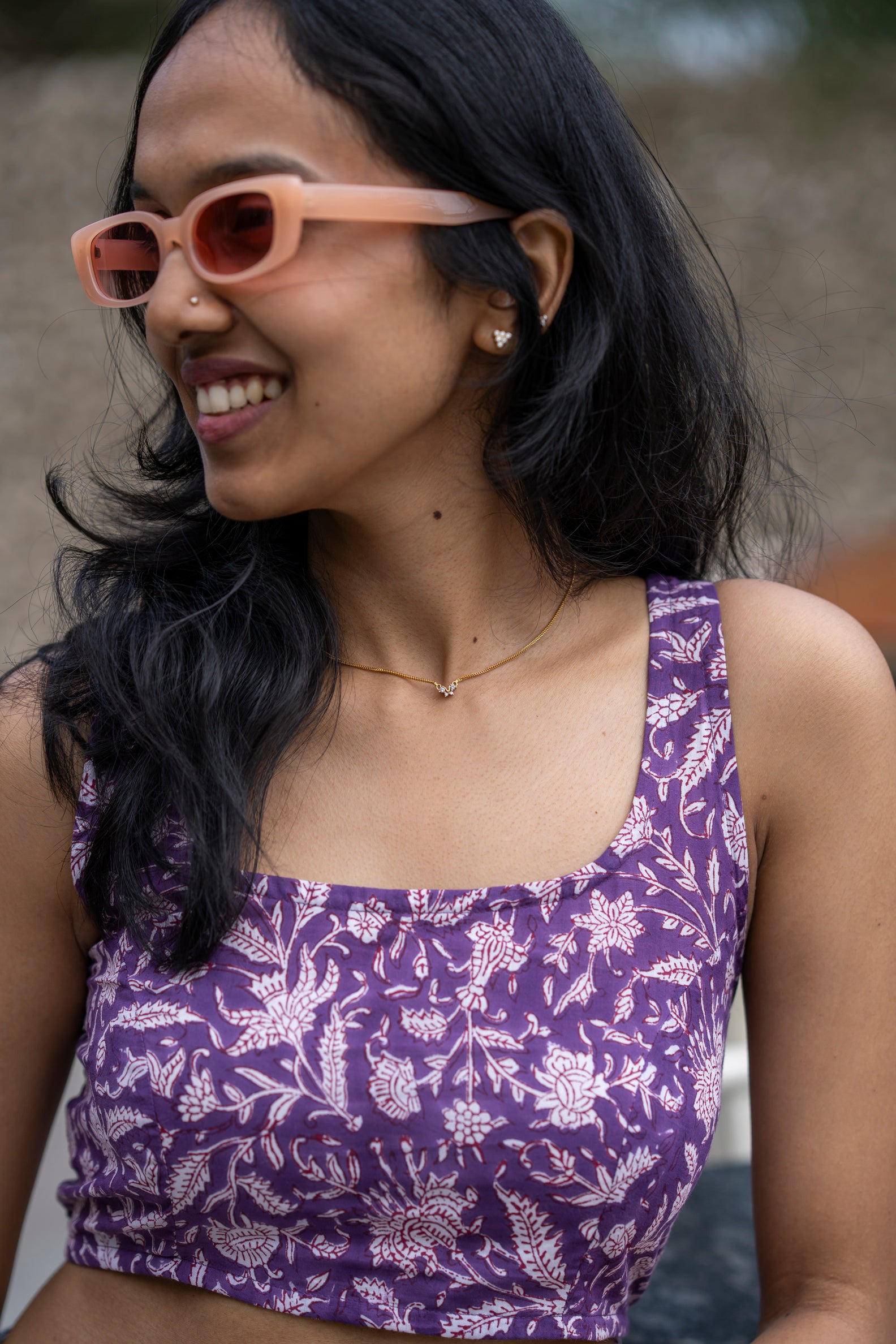 After Hours is the purple floral handblock crop top that gives you that snatched-but-sweet brunch glow instantly.