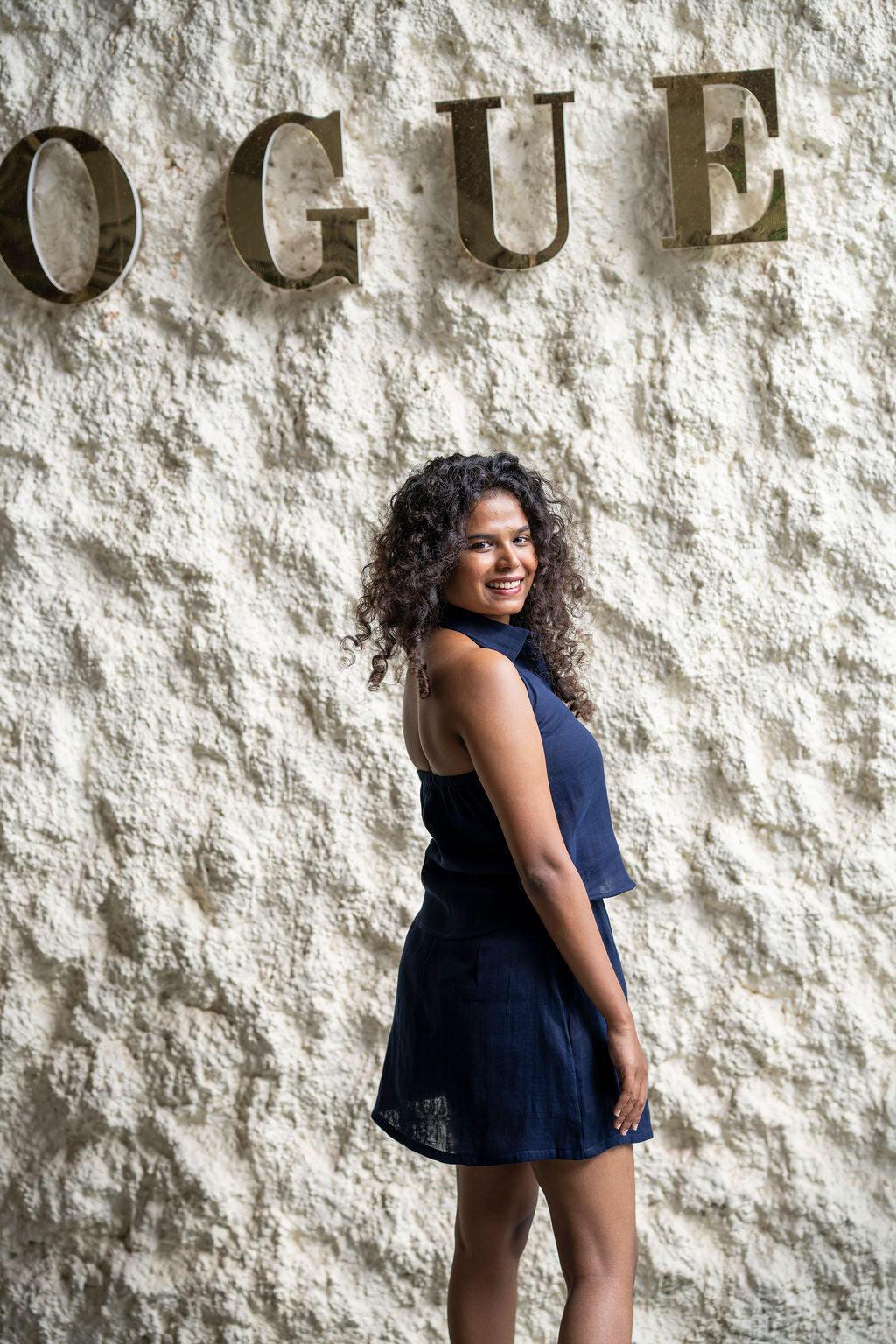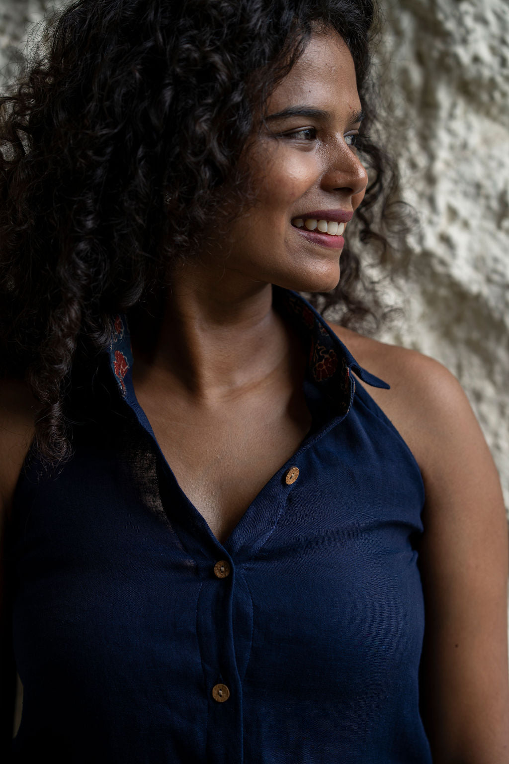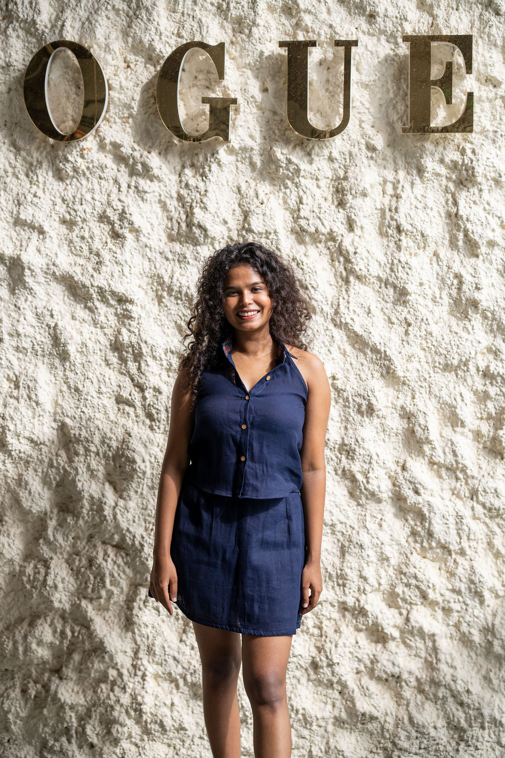 This navy blue skort and halterneck button-up top combo gives you that sleek, cinched, ready-to-win-the-night energy without even trying.