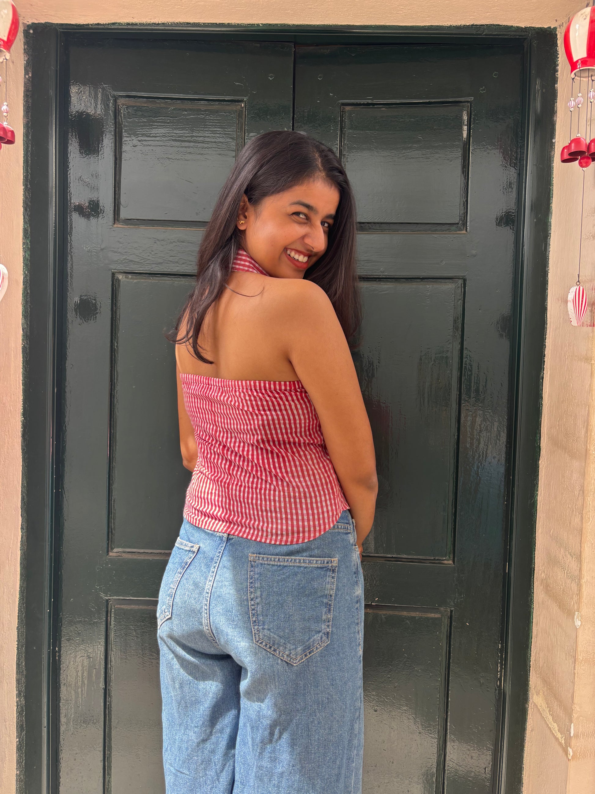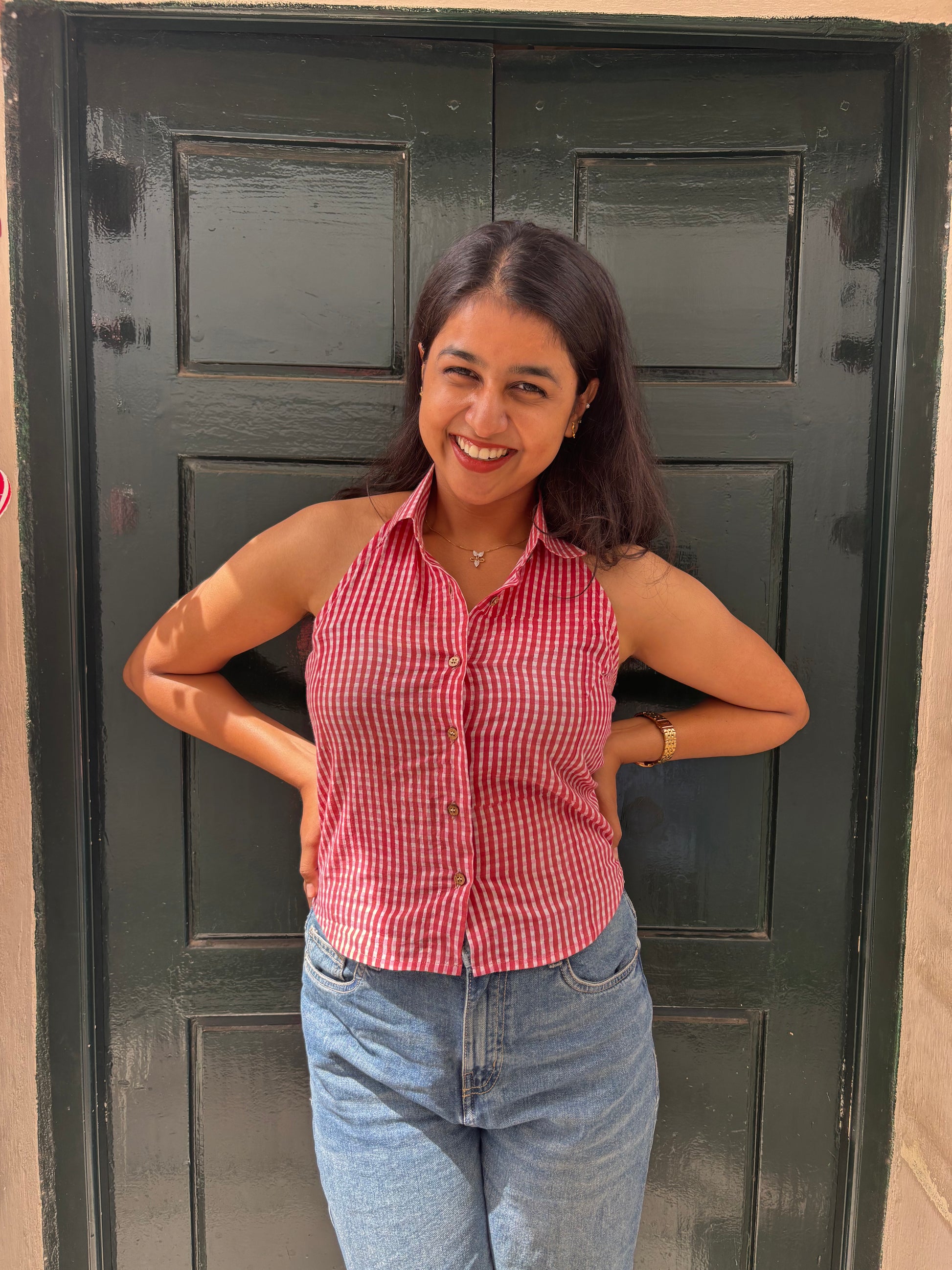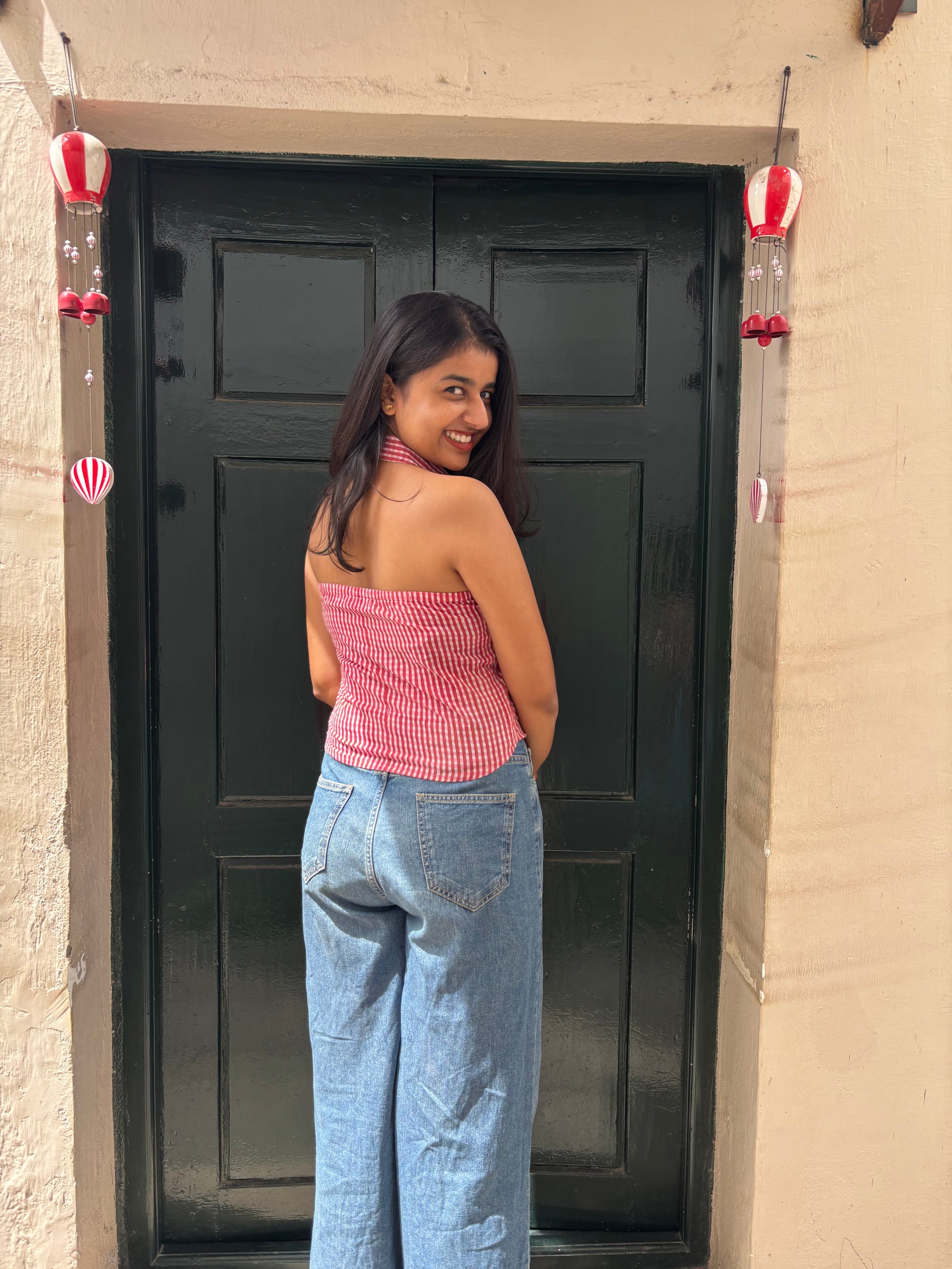 This red checked halter neck top from our Khatta Meetha collection is your ultimate style dare. With a sharp collar, button-down front, and an open elasticated back that brings the drama, Center Shock is all things playful, punchy, and packed with attitude. It’s got that sweet vintage vibe with a tangy twist — just like the chewing gum that shocked an entire generation (in the best way).