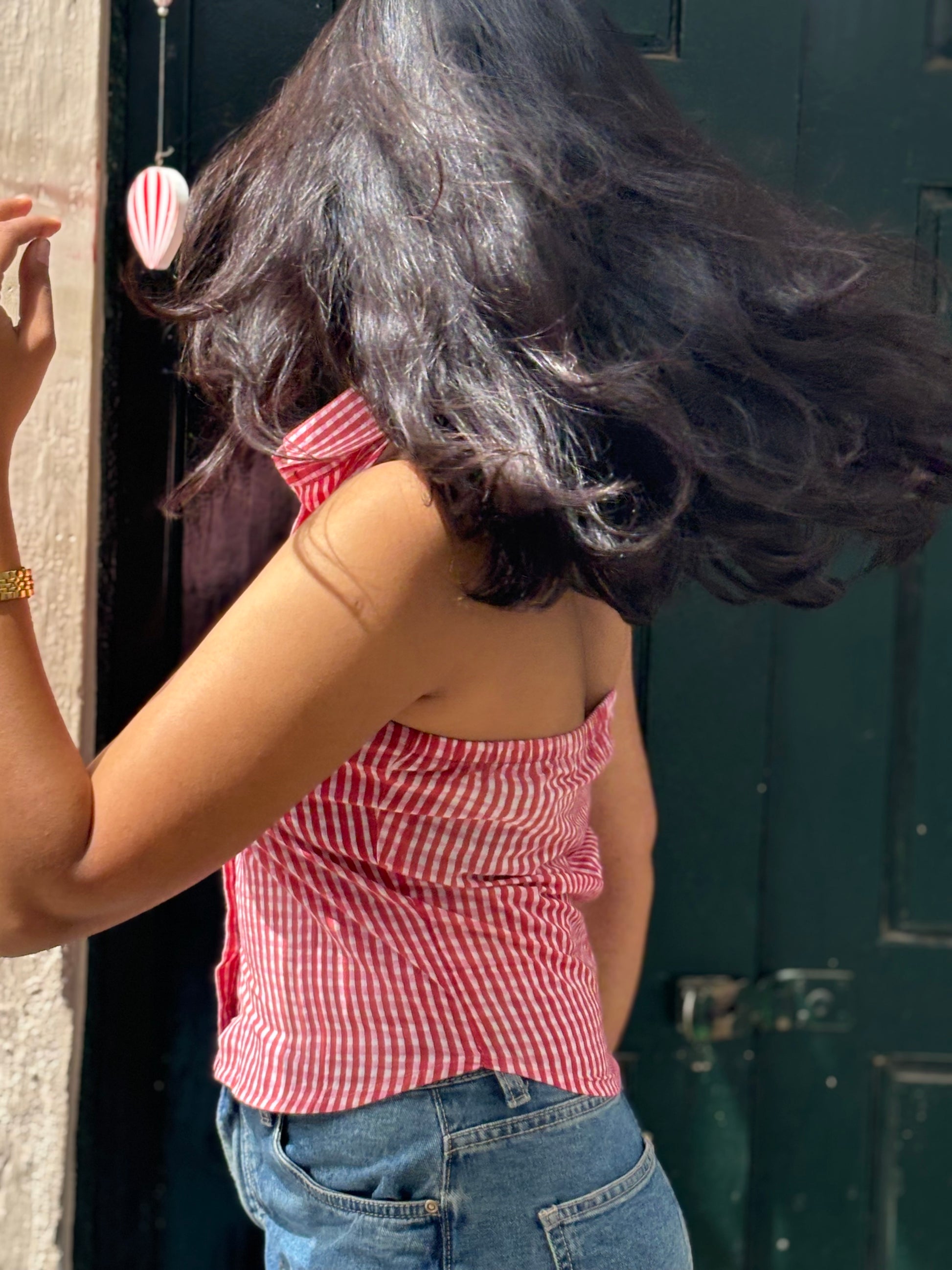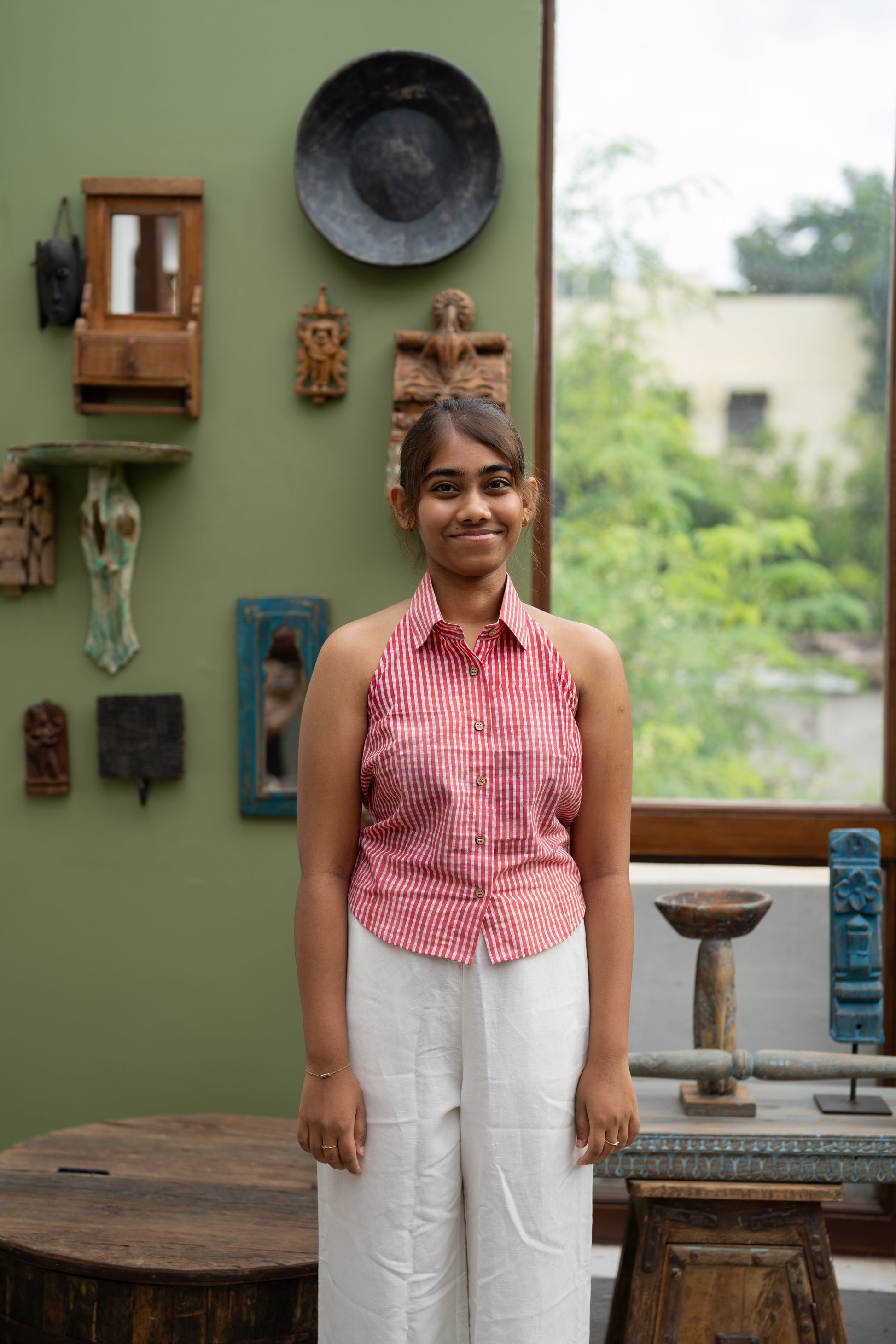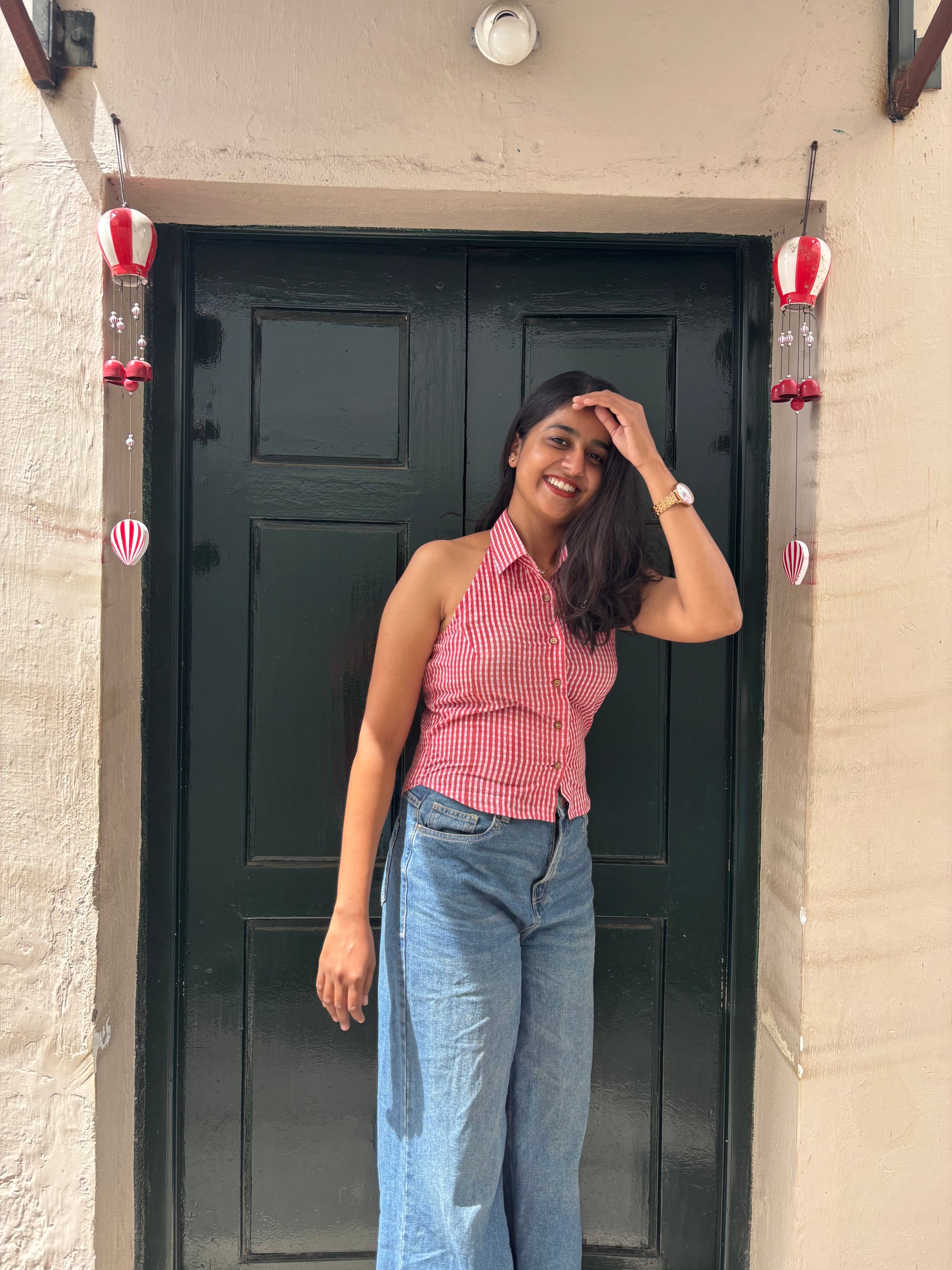 This red checked halter neck top from our Khatta Meetha collection is your ultimate style dare. With a sharp collar, button-down front, and an open elasticated back that brings the drama, Center Shock is all things playful, punchy, and packed with attitude. It’s got that sweet vintage vibe with a tangy twist — just like the chewing gum that shocked an entire generation (in the best way).