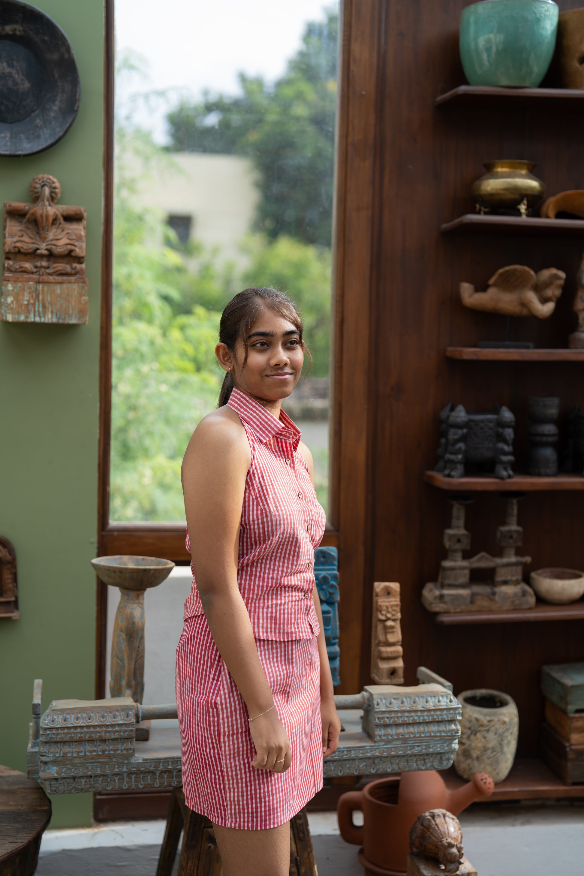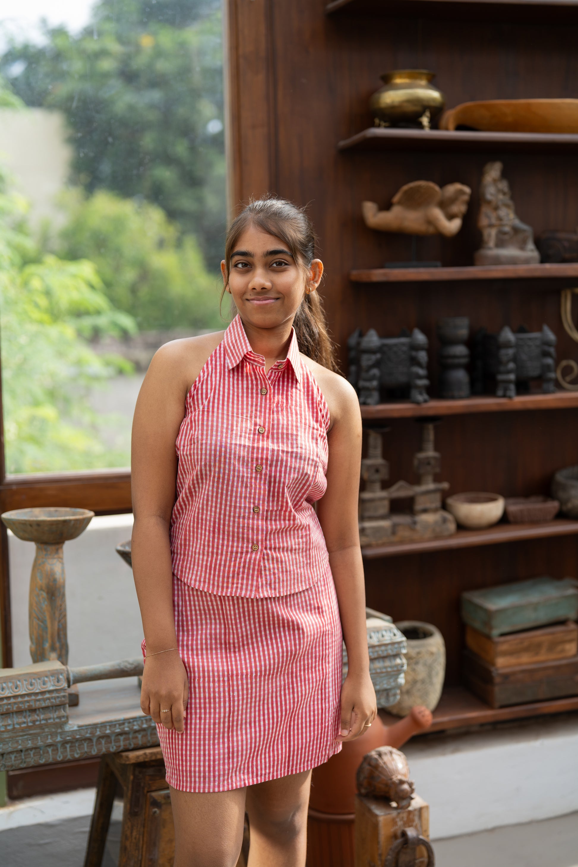 This red checked co-ord set from our Khatta Meetha collection is your ultimate jaw-drop moment. The mini skirt comes with a cheeky little slit on the side, while the halter neck crop top stuns with an open back and an elasticated fit that hugs just right. It’s playful, punchy, and full of surprise — a total throwback to that tangy chewing gum that had us all hooked (and slightly traumatised, in the best way).