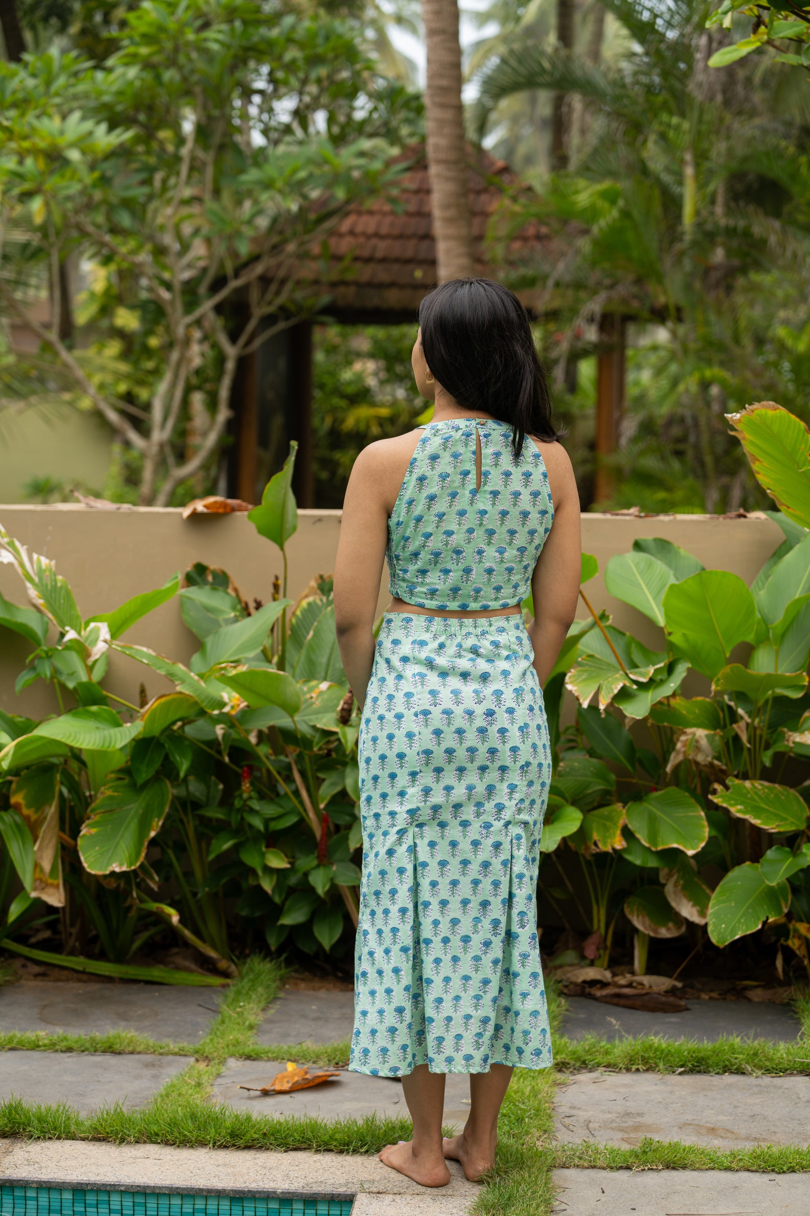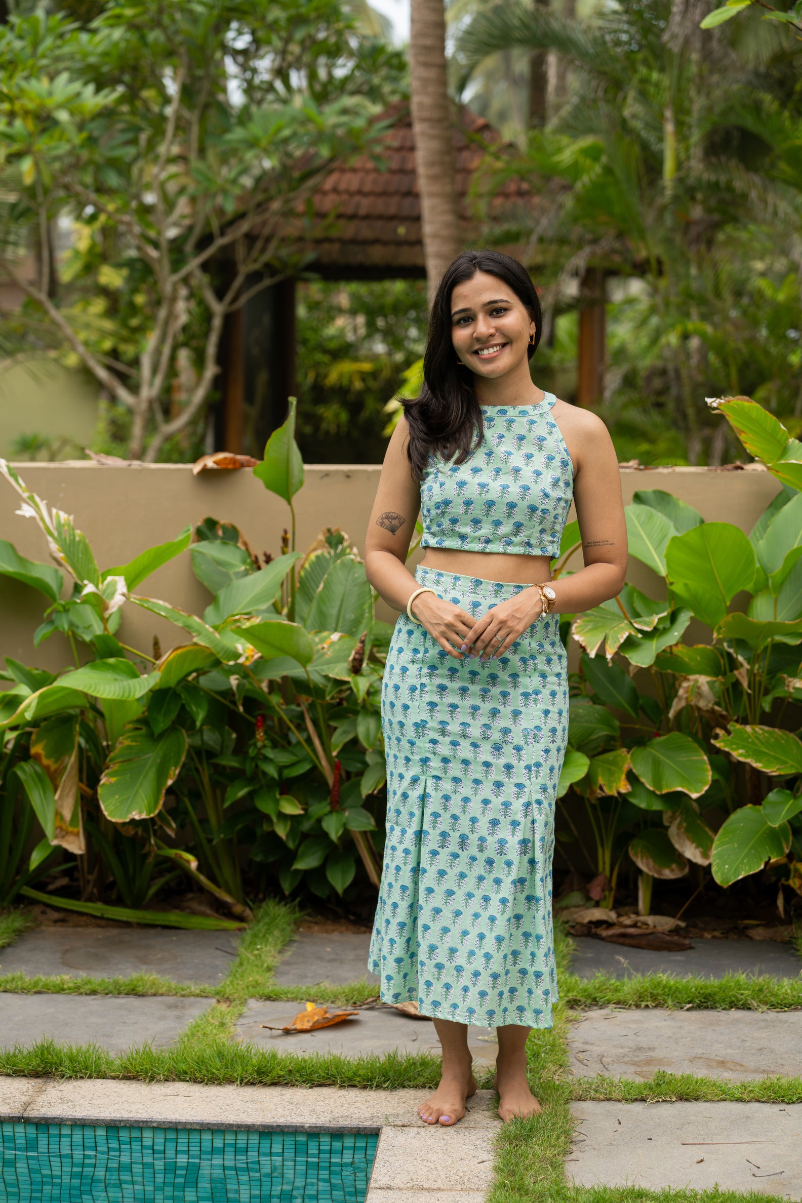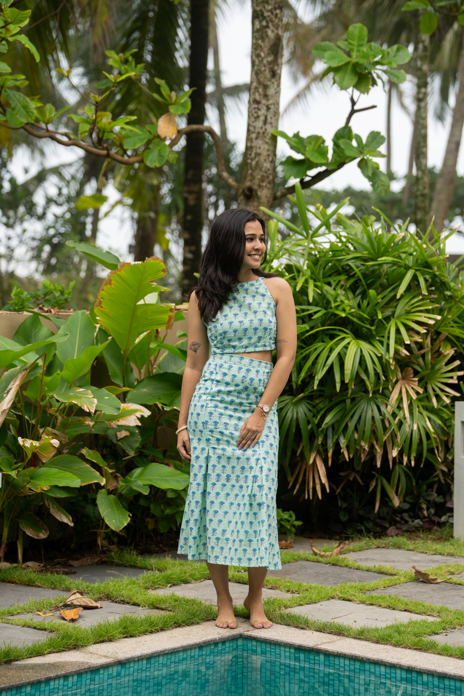 Here's Elani Co-ord Set, the blue hand block printed mermaid skirt and halter neck crop top co-ord set that’s as fresh and fun as a tender coconut by the sea! this set will make you feel like you’re dancing under the sun and the stars in a tropical paradise. 🥥🌅