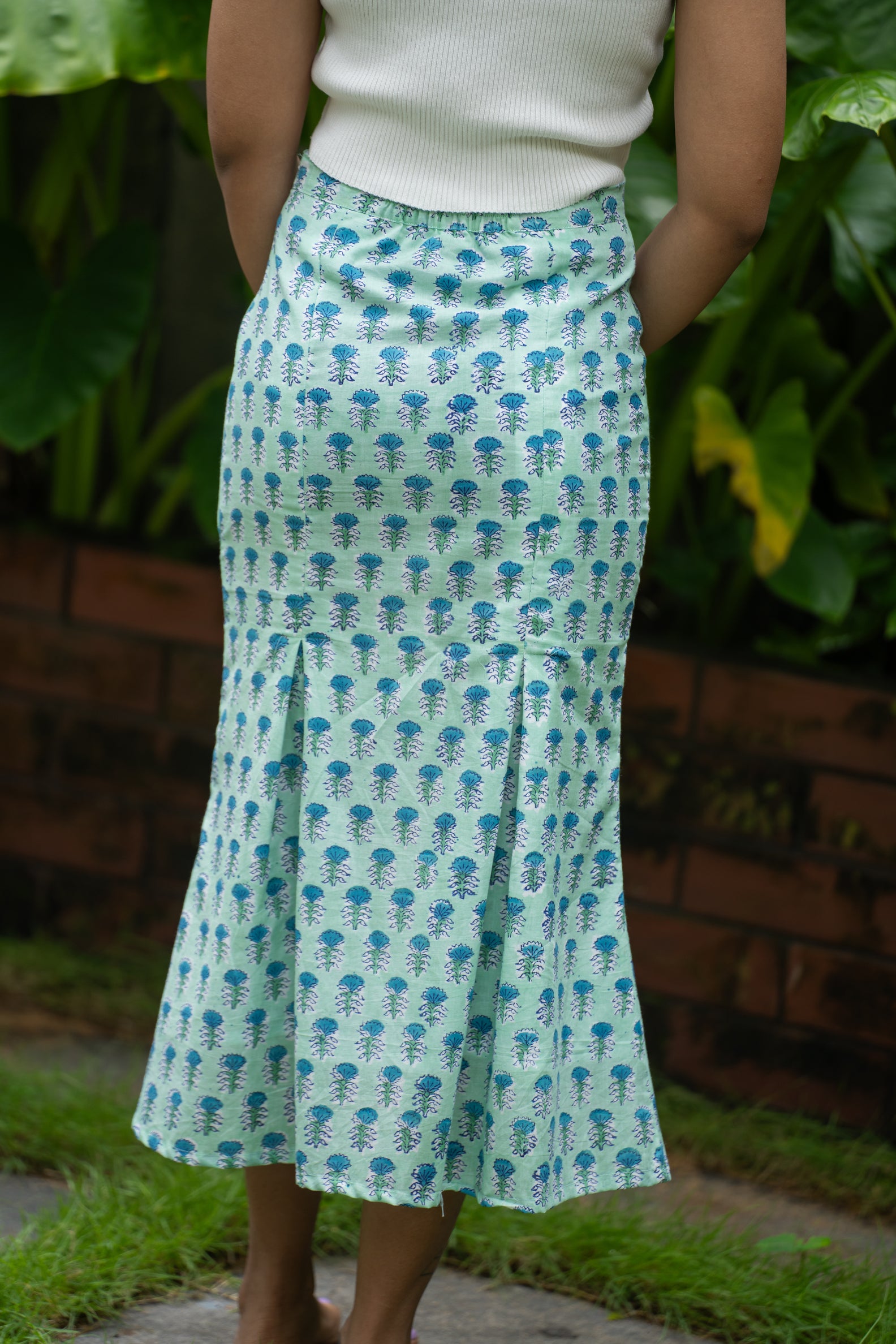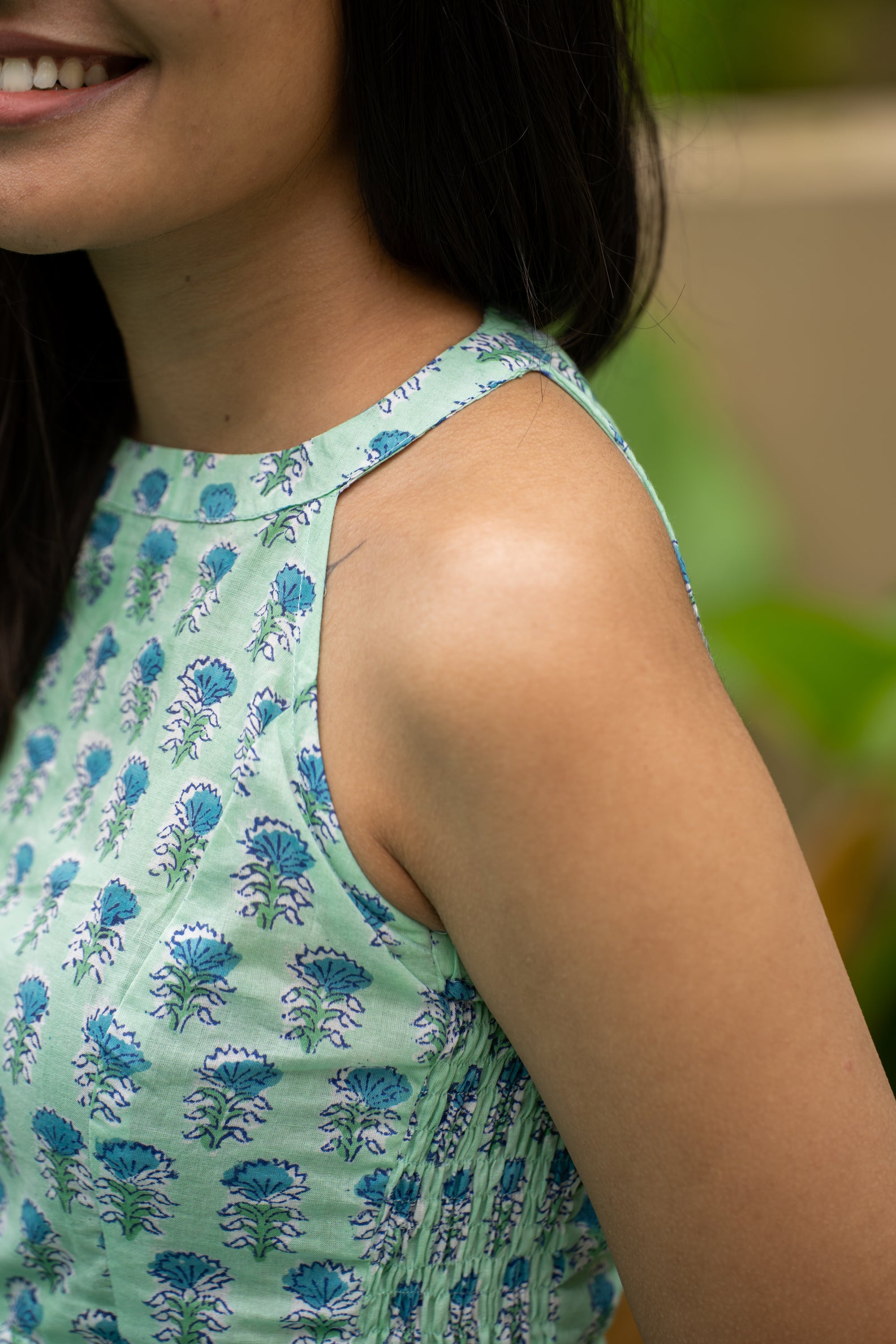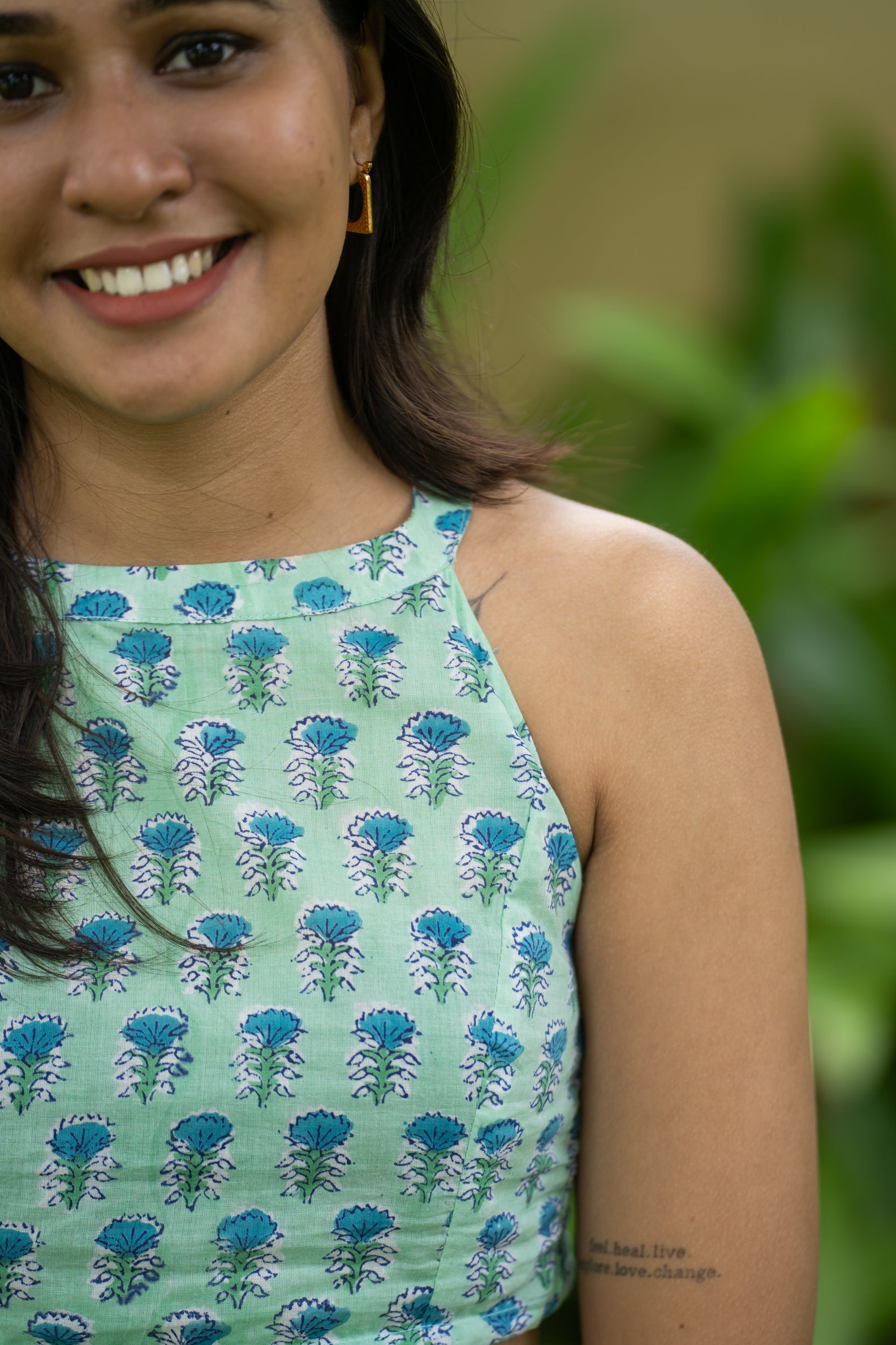 Here's Elani Co-ord Set, the blue hand block printed mermaid skirt and halter neck crop top co-ord set that’s as fresh and fun as a tender coconut by the sea! this set will make you feel like you’re dancing under the sun and the stars in a tropical paradise. 🥥🌅