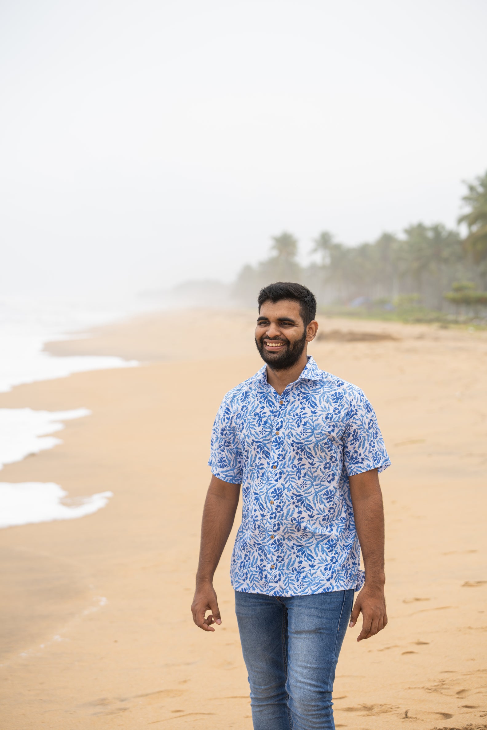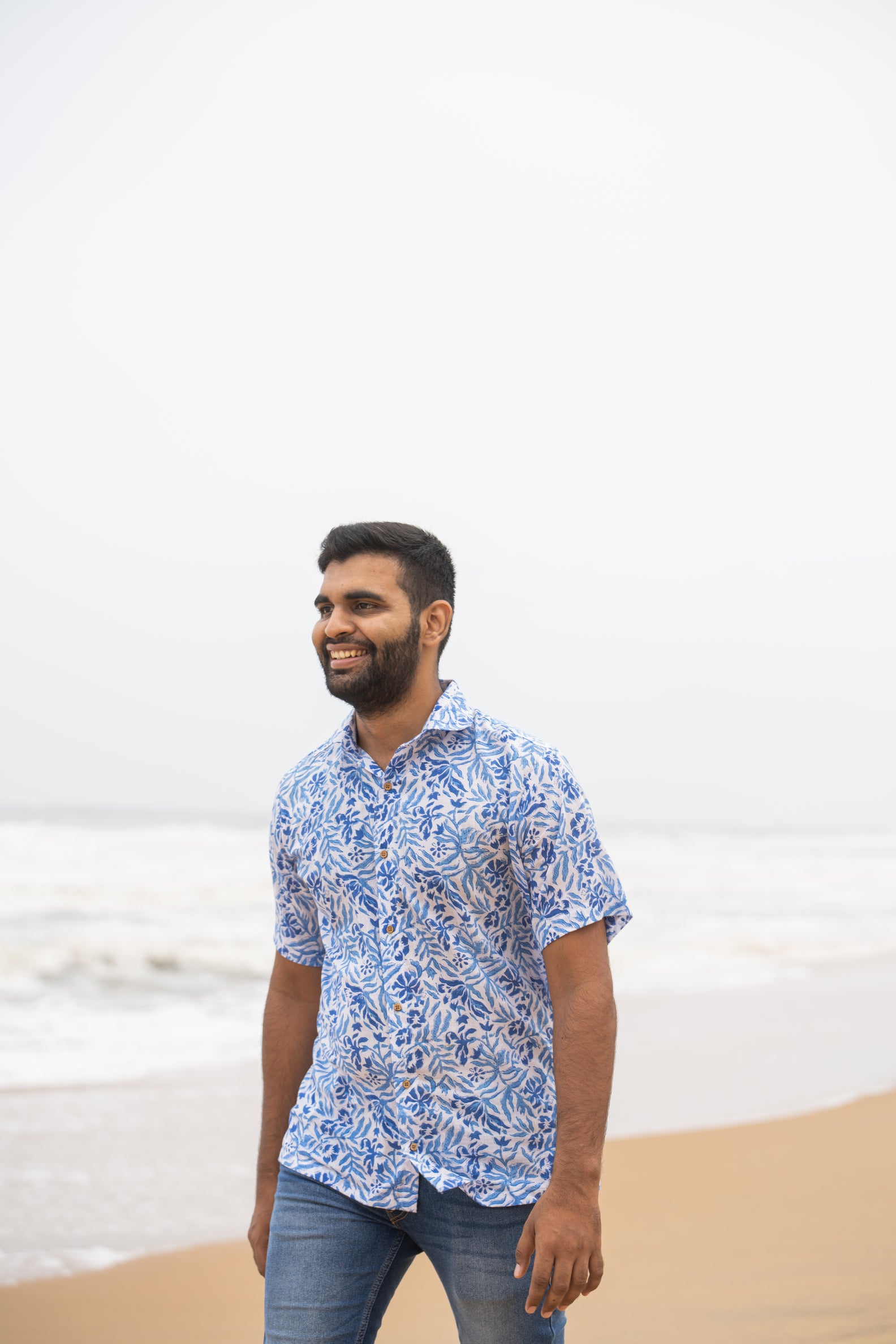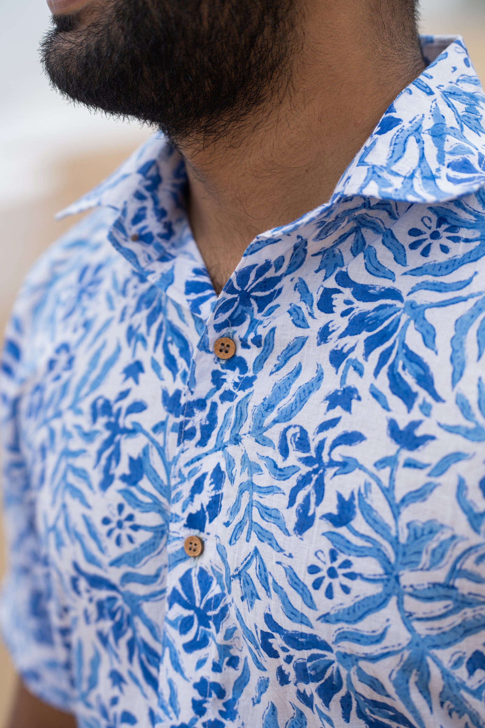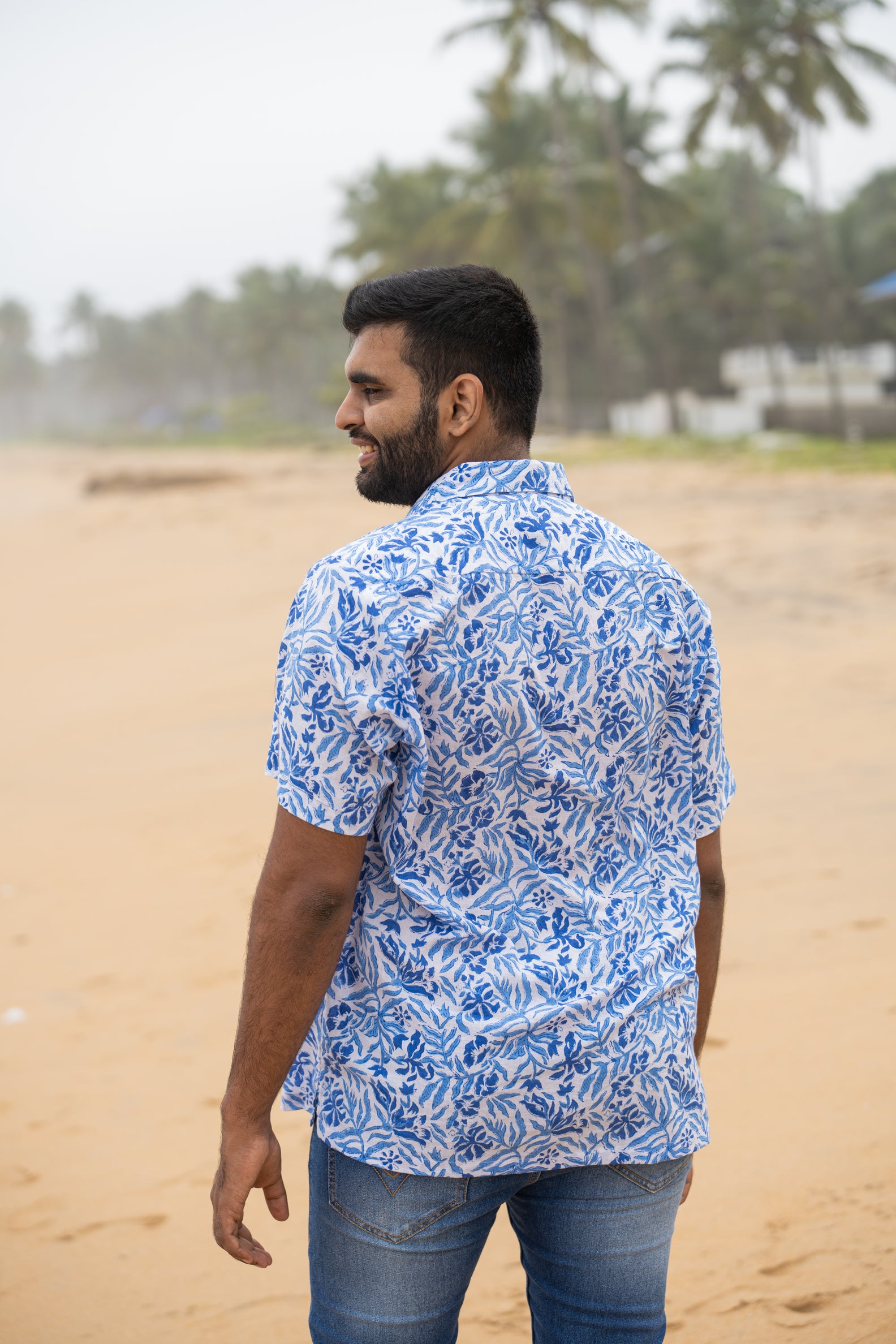 "Hawaii," a cool and breezy blue and white floral handblock printed men's shirt that captures the essence of a tropical paradise. This shirt is perfect for bringing a touch of island flair to your beach wardrobe, making you feel like you're on a permanent vacation. 🌴🌺