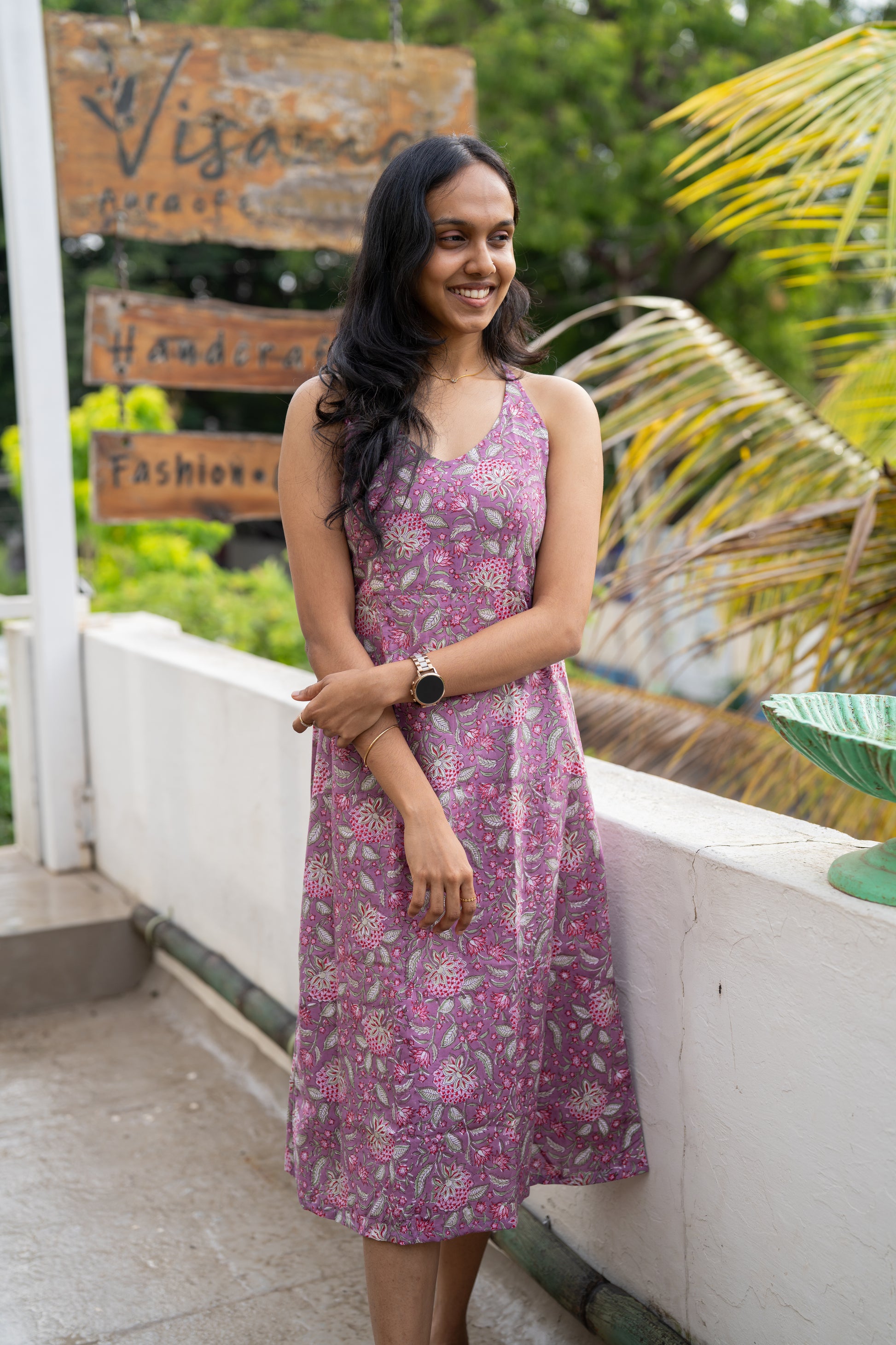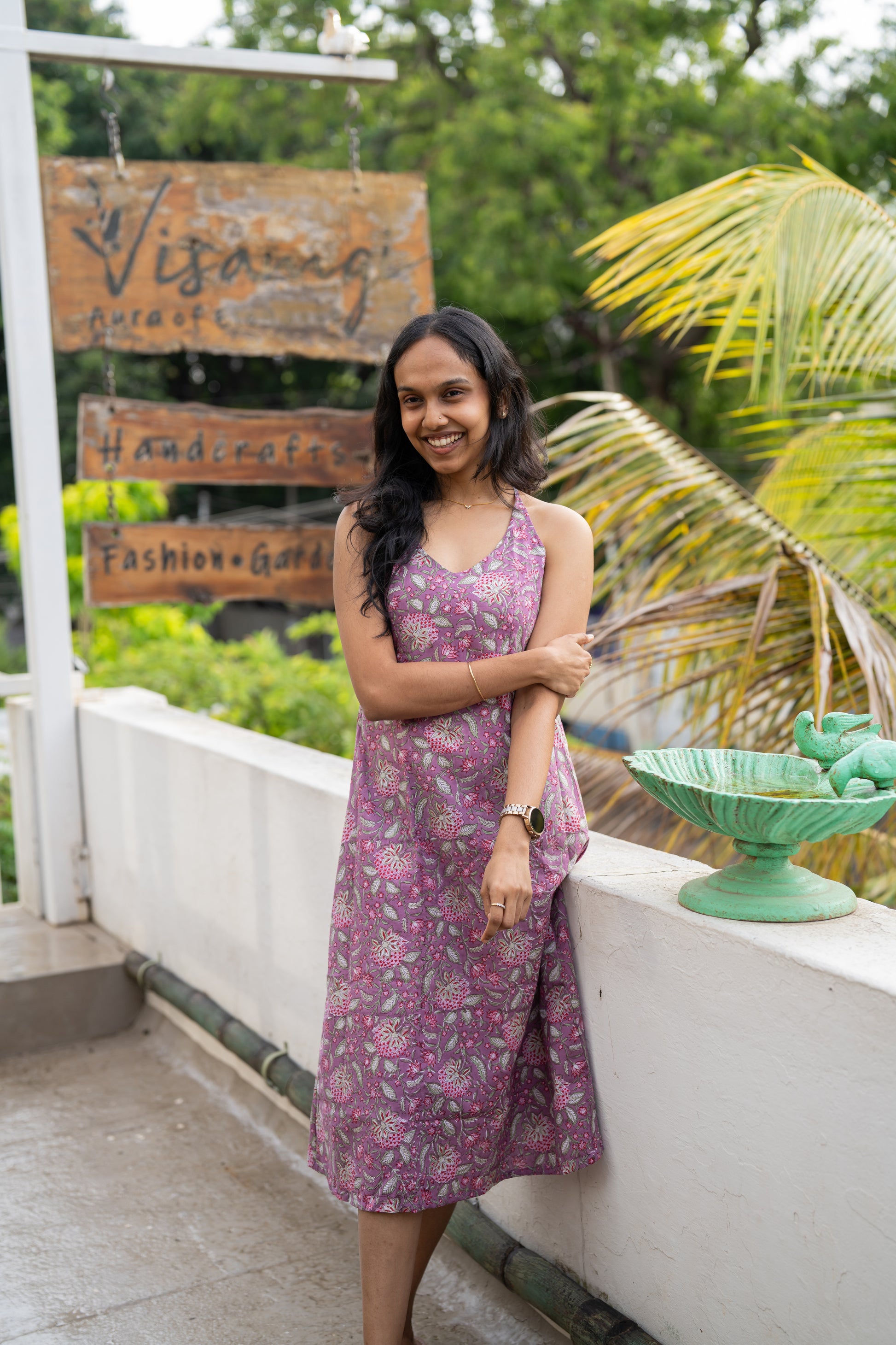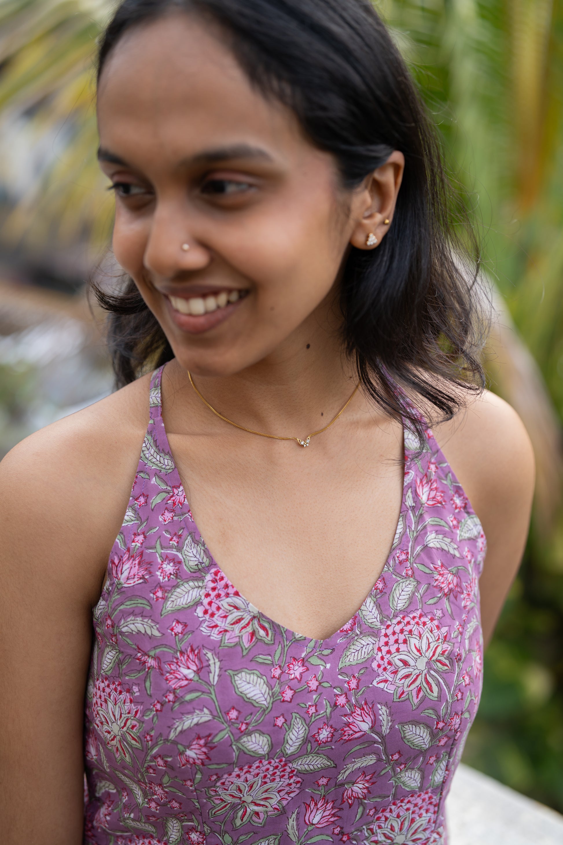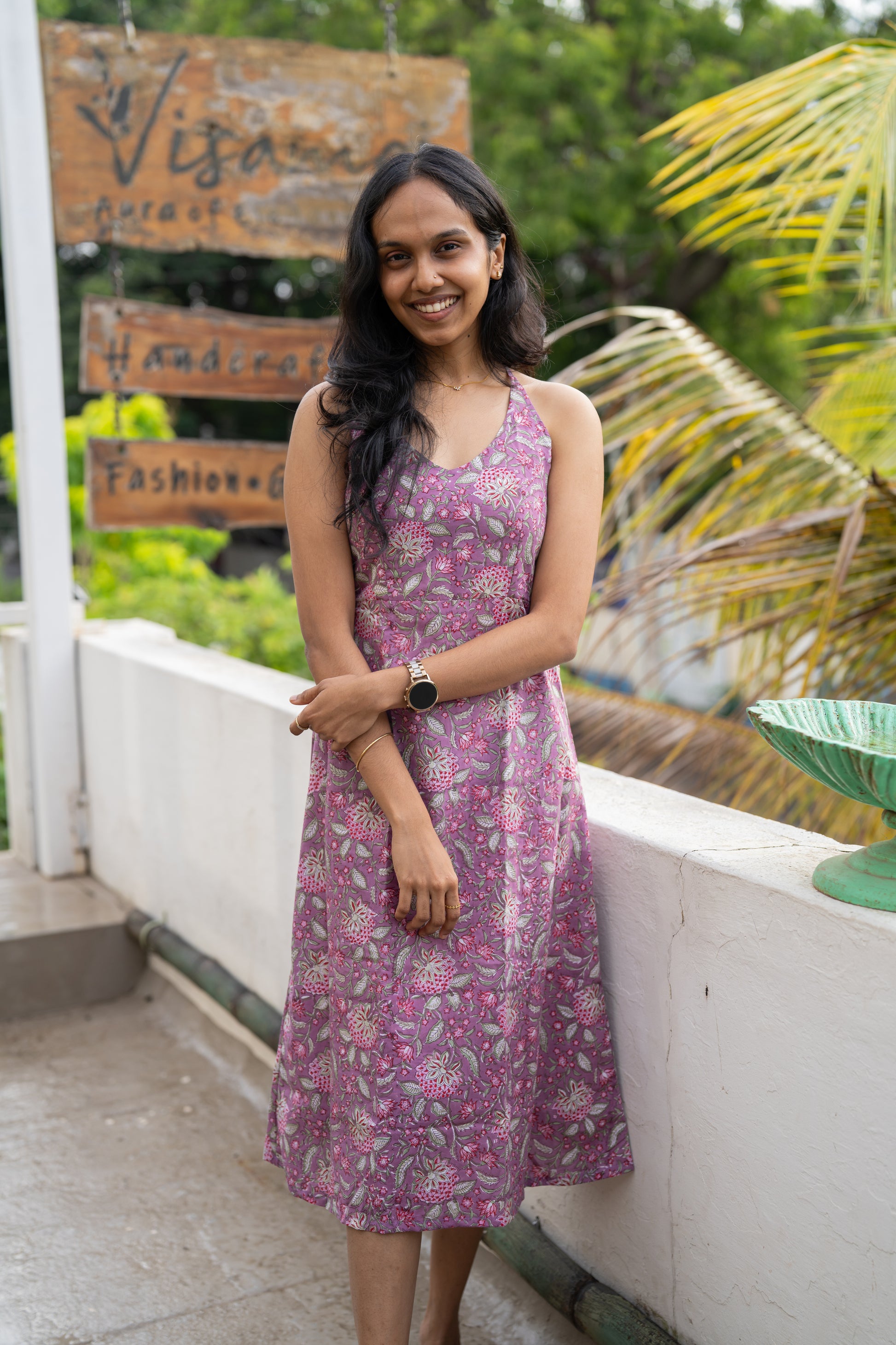 This purple floral handblock printed halter neck dress comes with an adjustable back strap so you can wear it as chill or as cheeky as you like. Light, breathable, and bursting with flavour, Jaljeera is your summer-time showstopper from our Khatta Meetha menu.