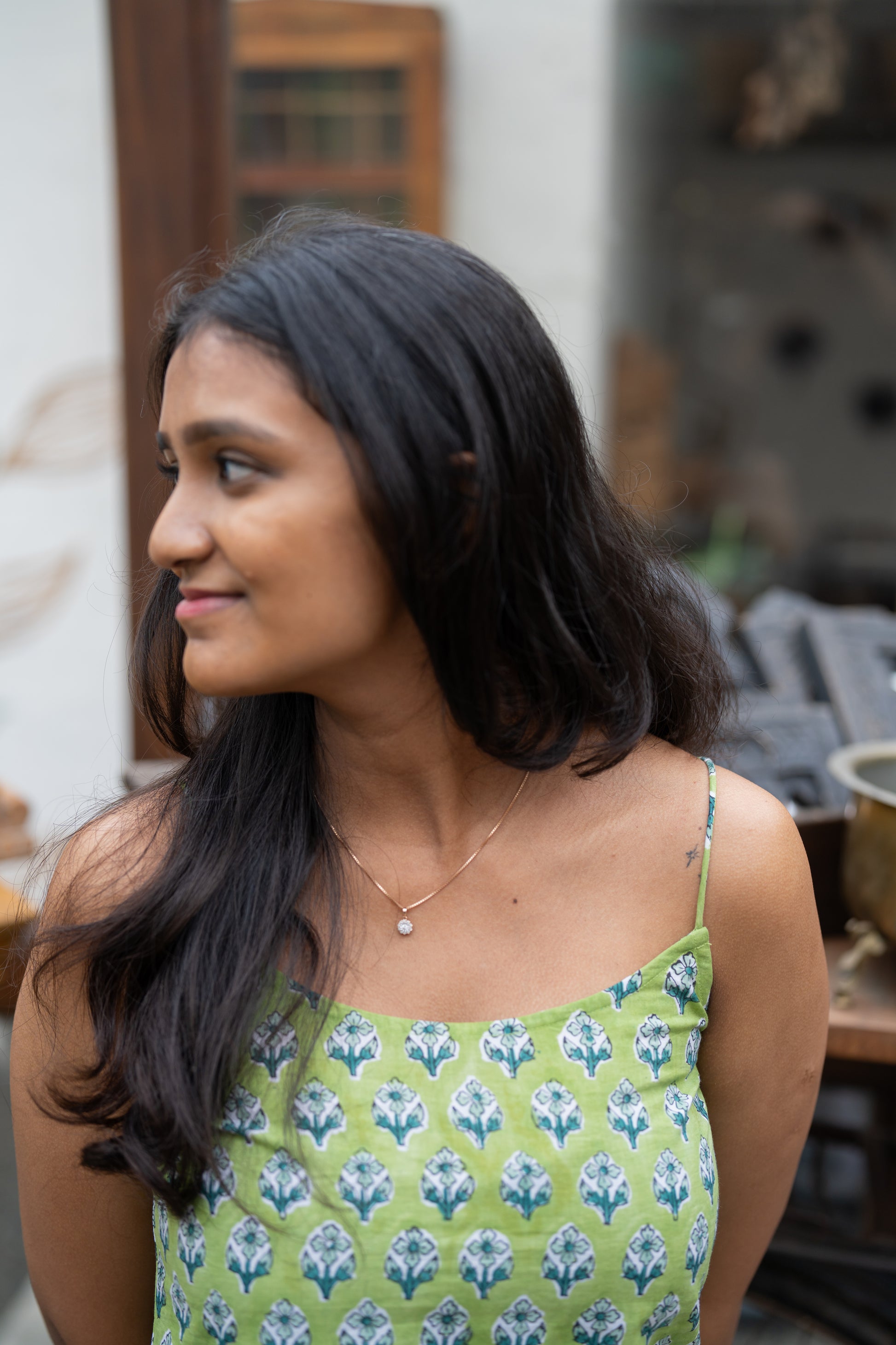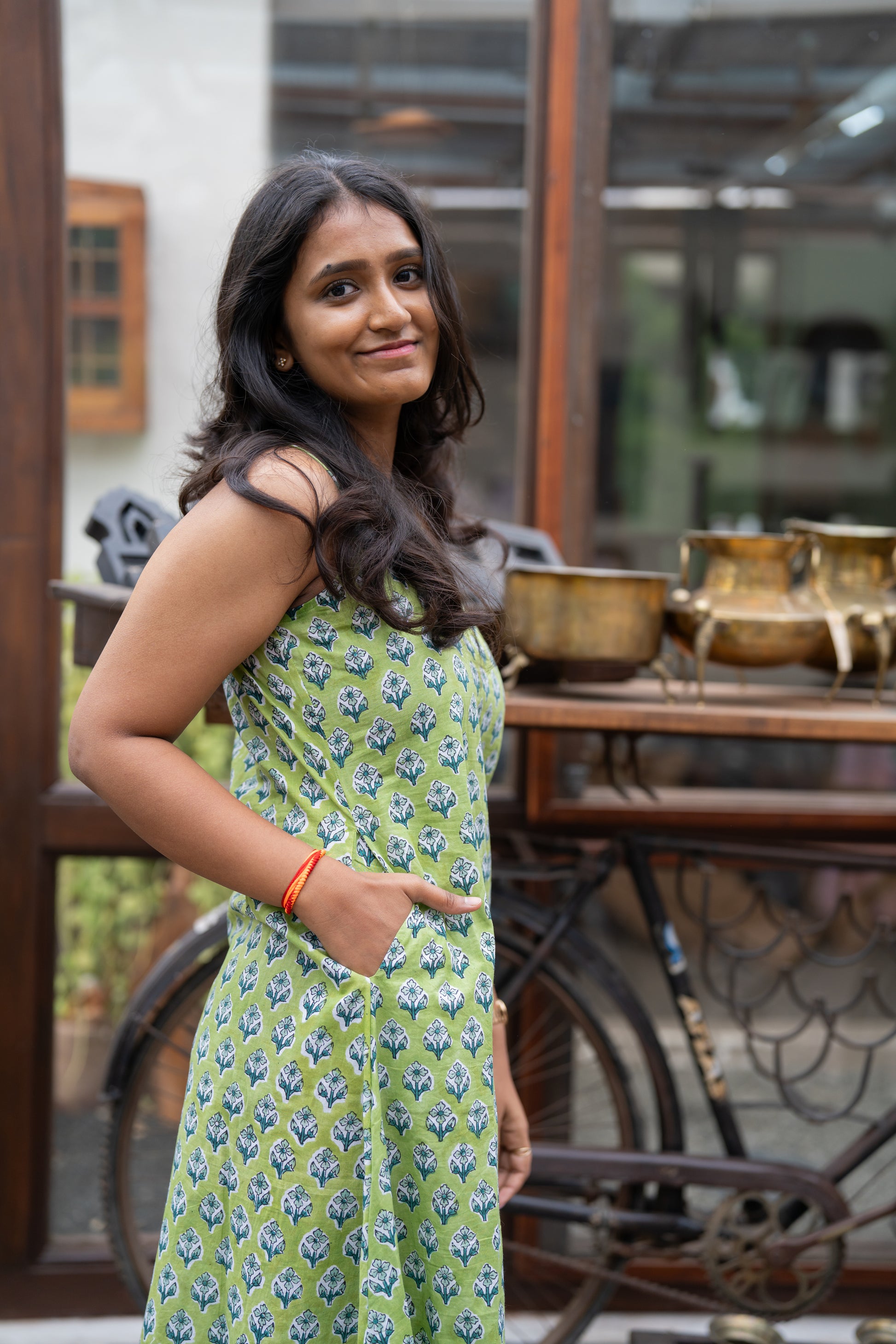 This green floral handblock printed A-line dress with delicate noodle straps is your Khatta Meetha mood in motion. Breezy, bright, and packed with punch, with a twirl-friendly silhouette and desi nostalgia stitched into every seam, this one’s a total summer scene-stealer.