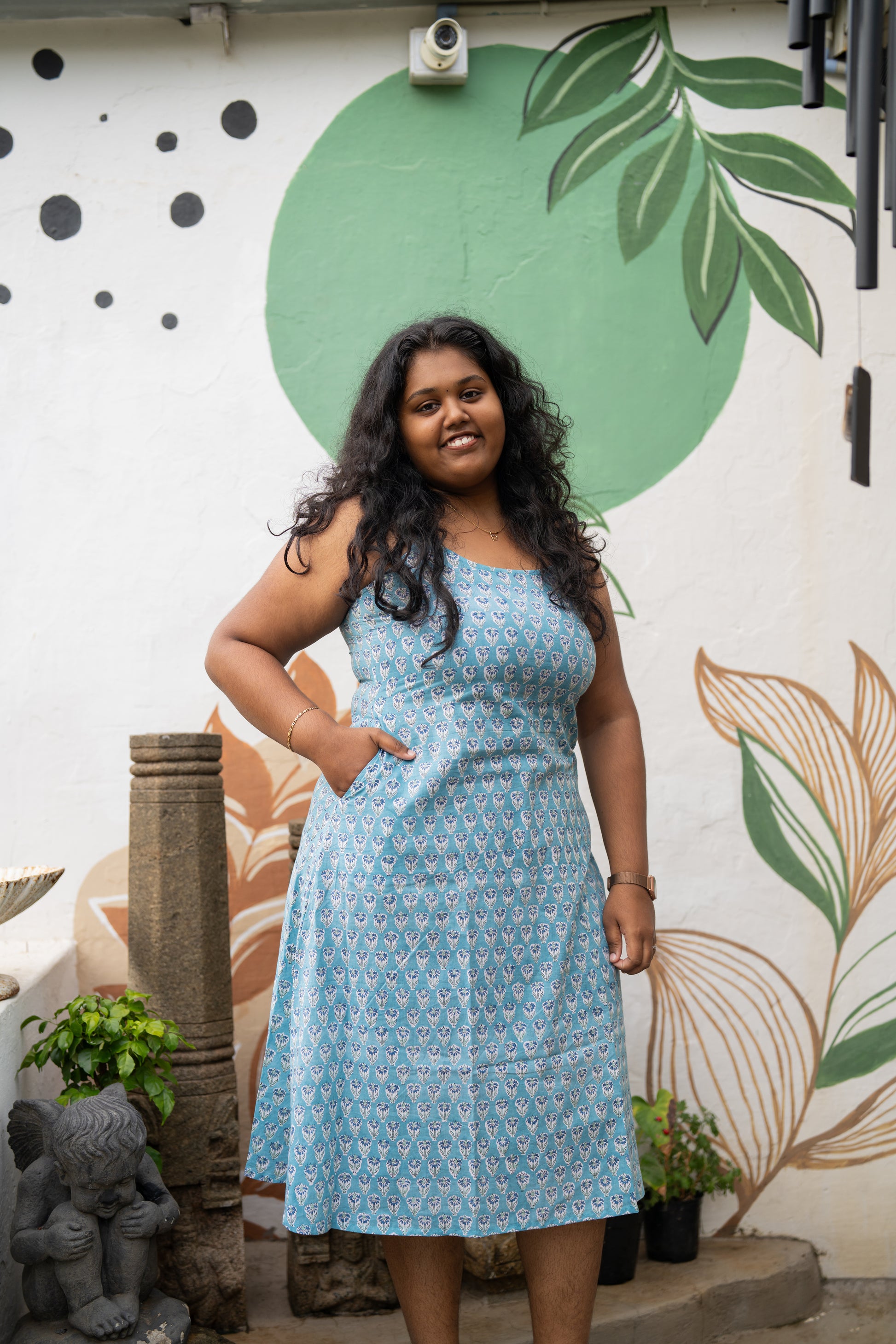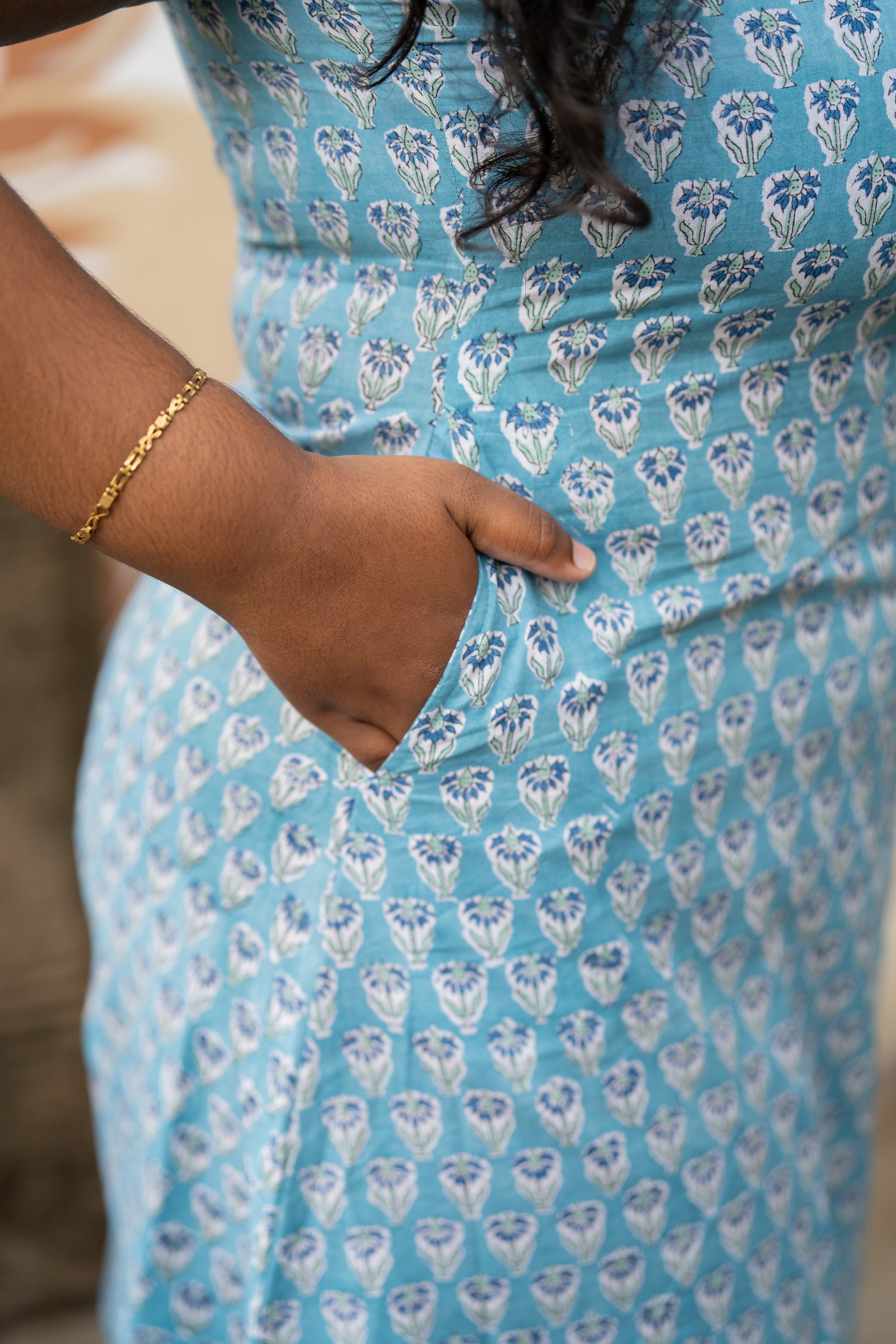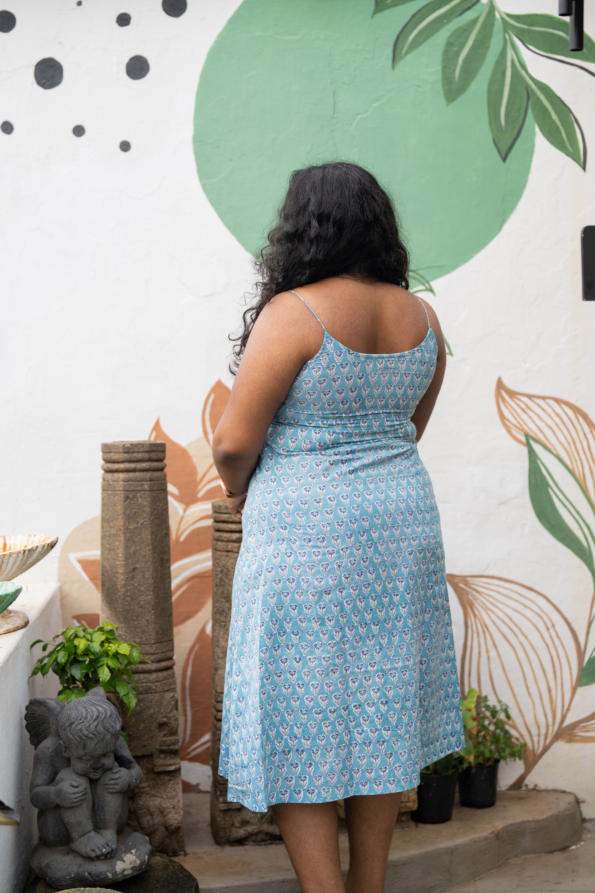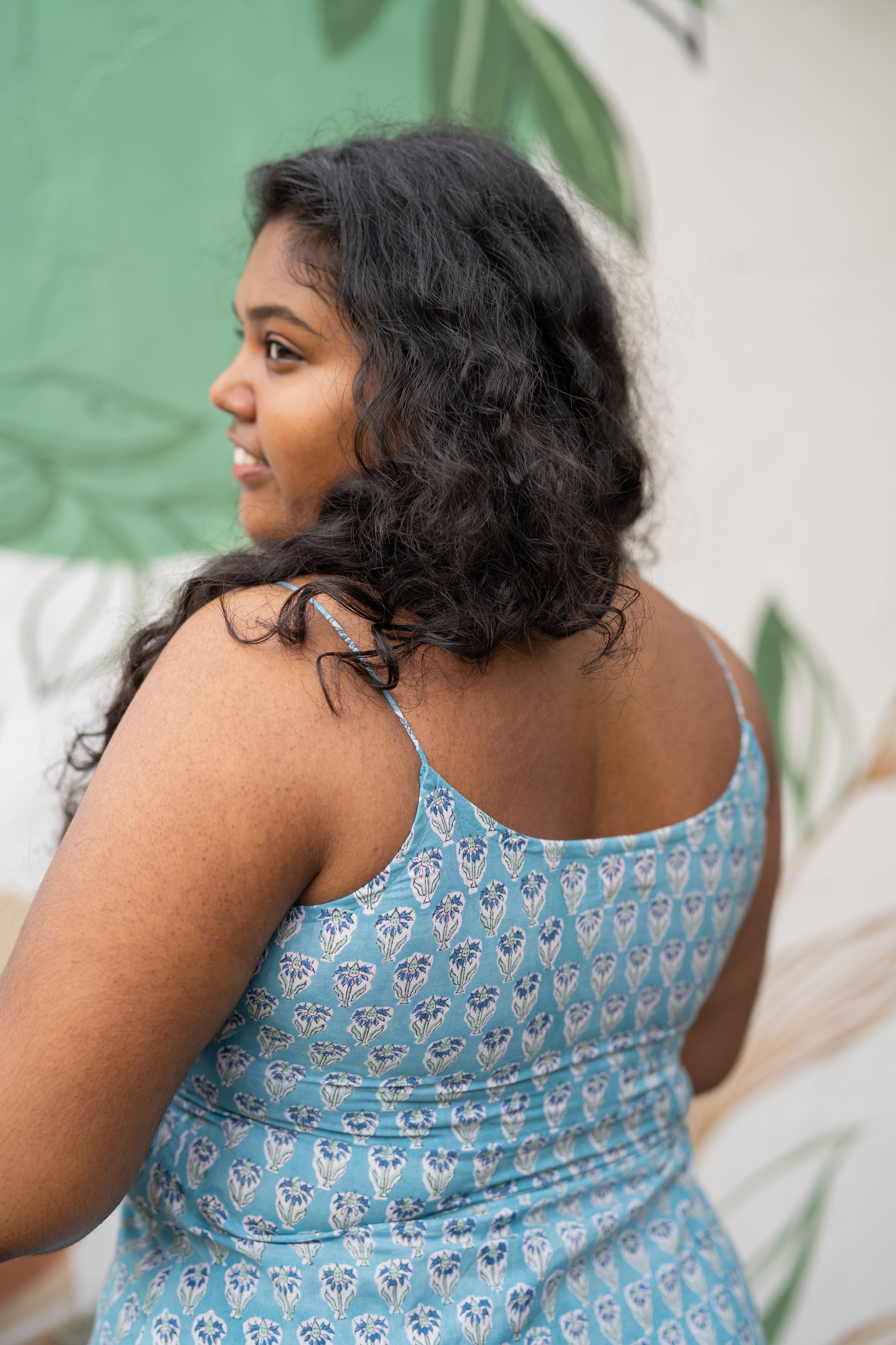 This blue floral handblock printed A-line dress with cute noodle straps is your wardrobe’s version of comfort food. With a silhouette that’s light and twirl-happy and a print that’s as satisfying as the first bite of a hot kachori, this dress is made for spontaneous plans, loud laughter, and chai breaks that turn into photoshoots.