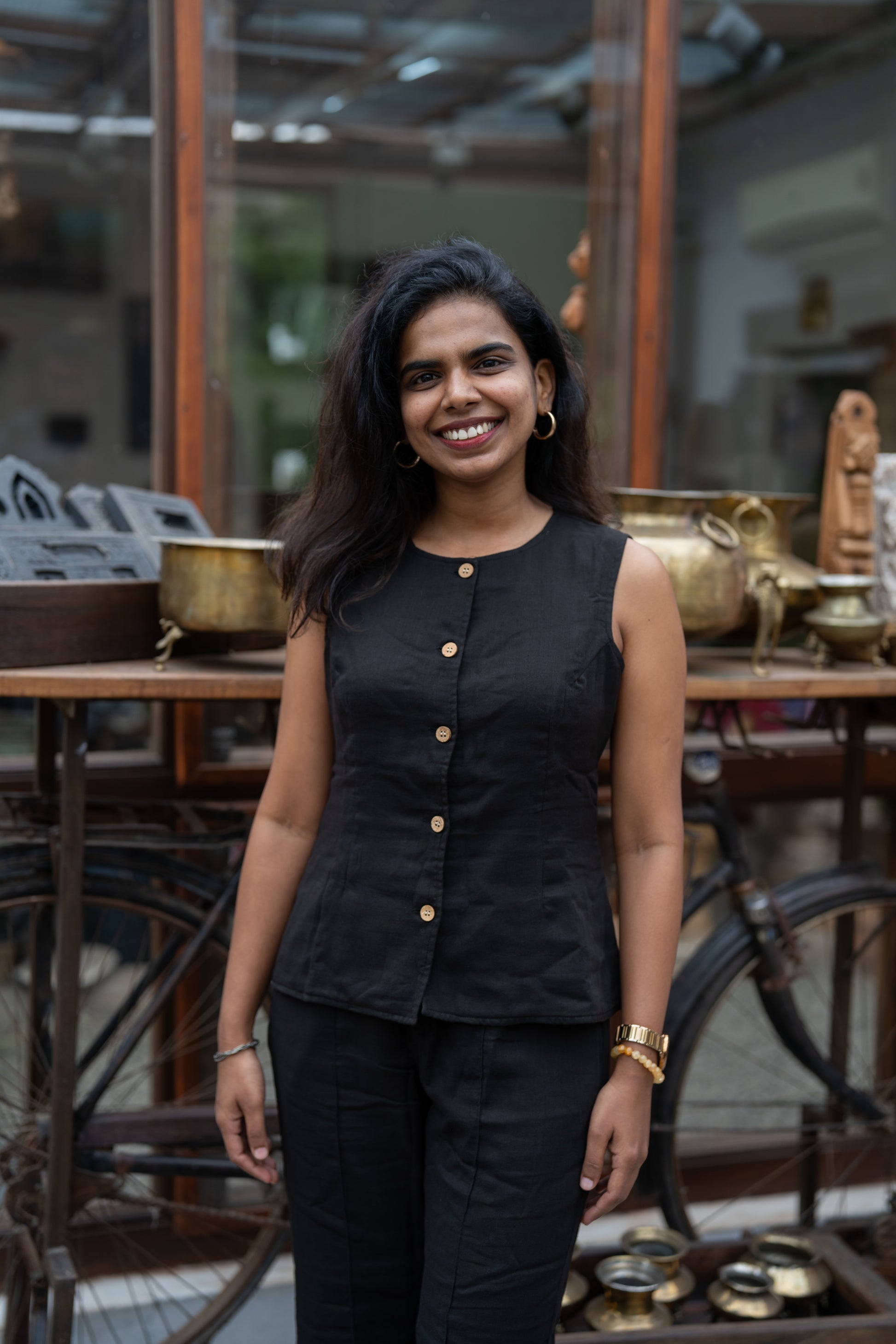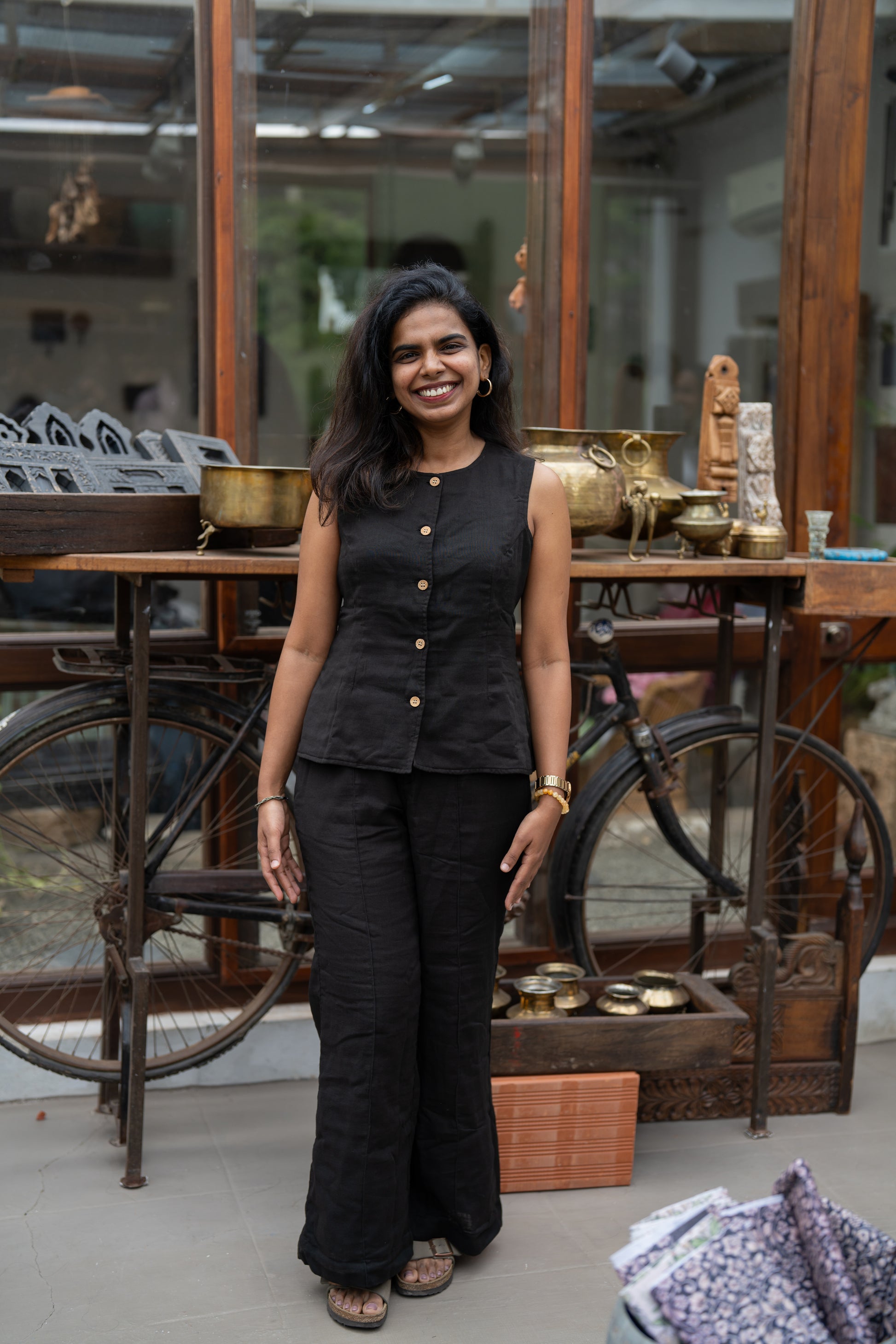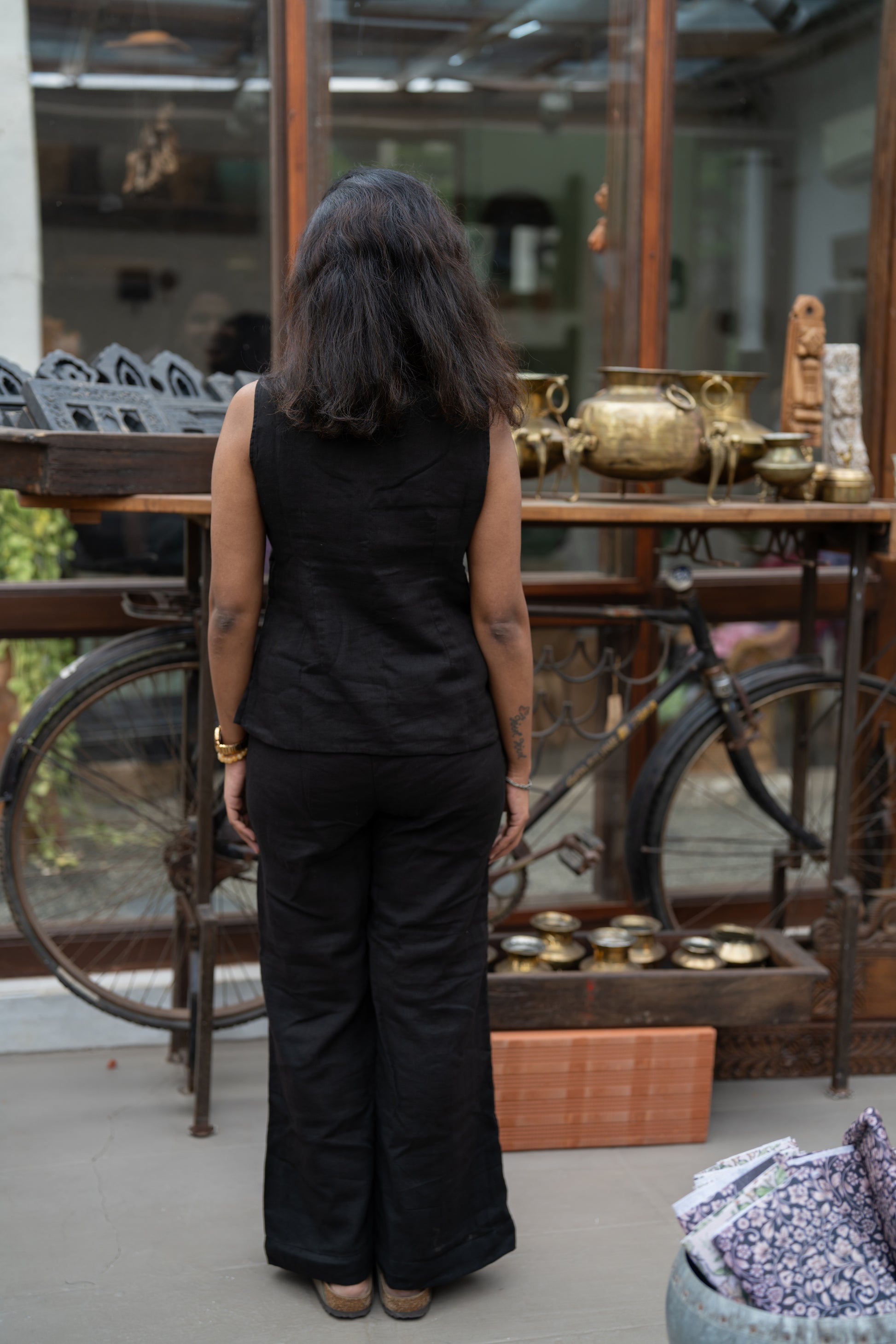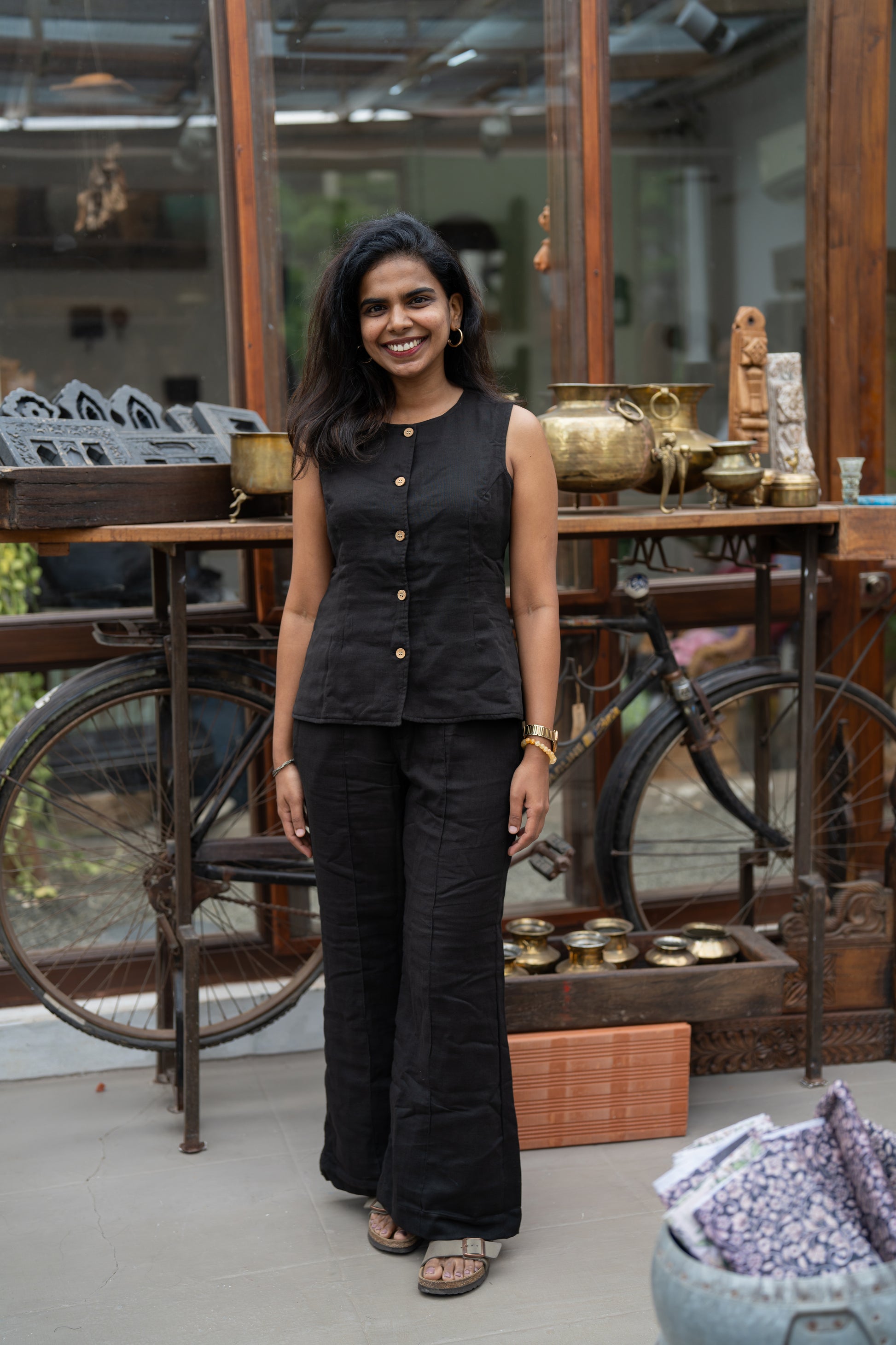 This black muslin button-down top and flared pant co-ord set from our Khatta Meetha collection is all things fierce, flattering, and fabulously chatpata. The top is tailored to snatch you in just right (hello, waist goals!), while the pants flow into a subtle flare for that effortless strut. Whether you're making power moves or stealing the limelight at a late-night chai meet, Kala Khatta serves that icy-cool style with a spicy twist.