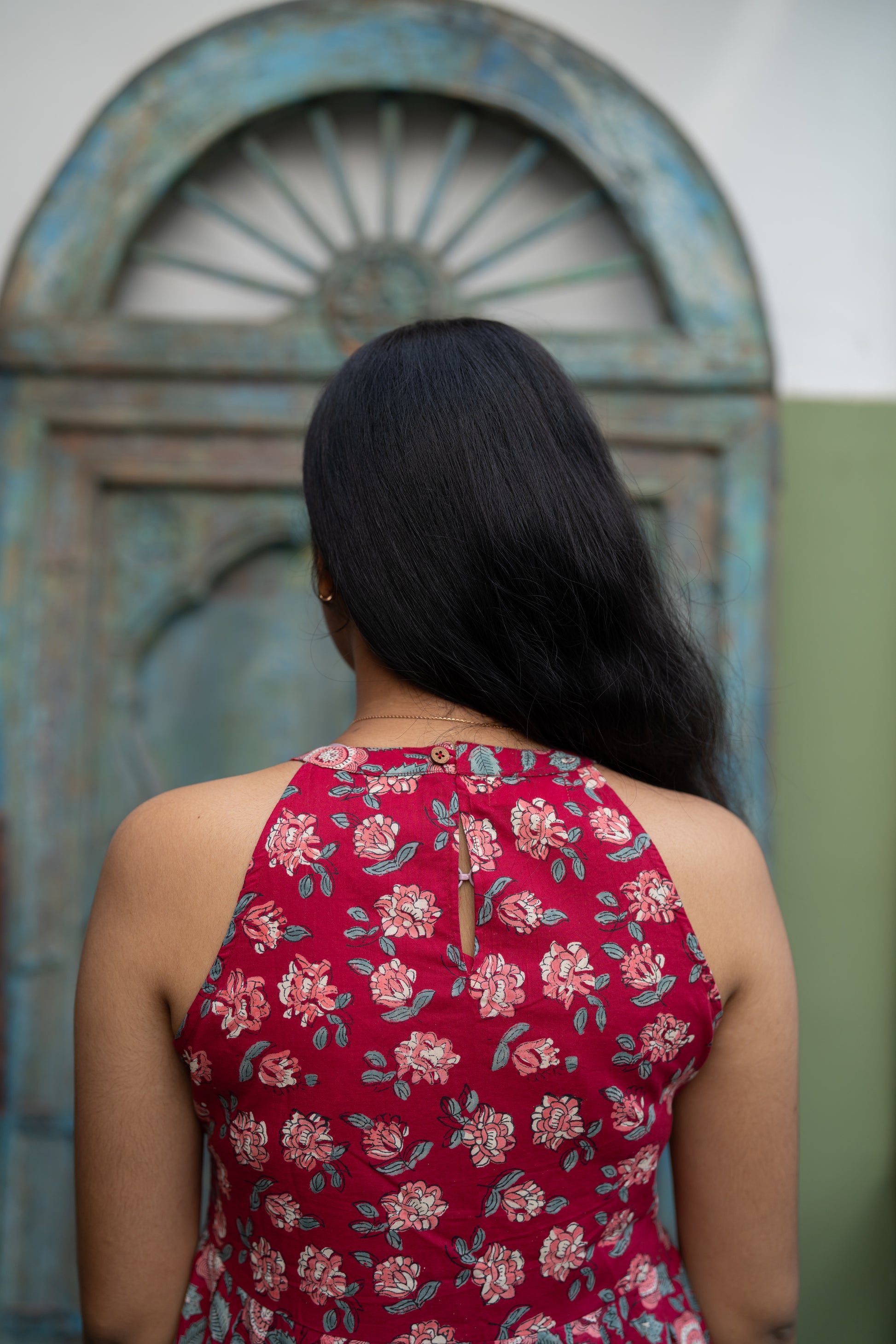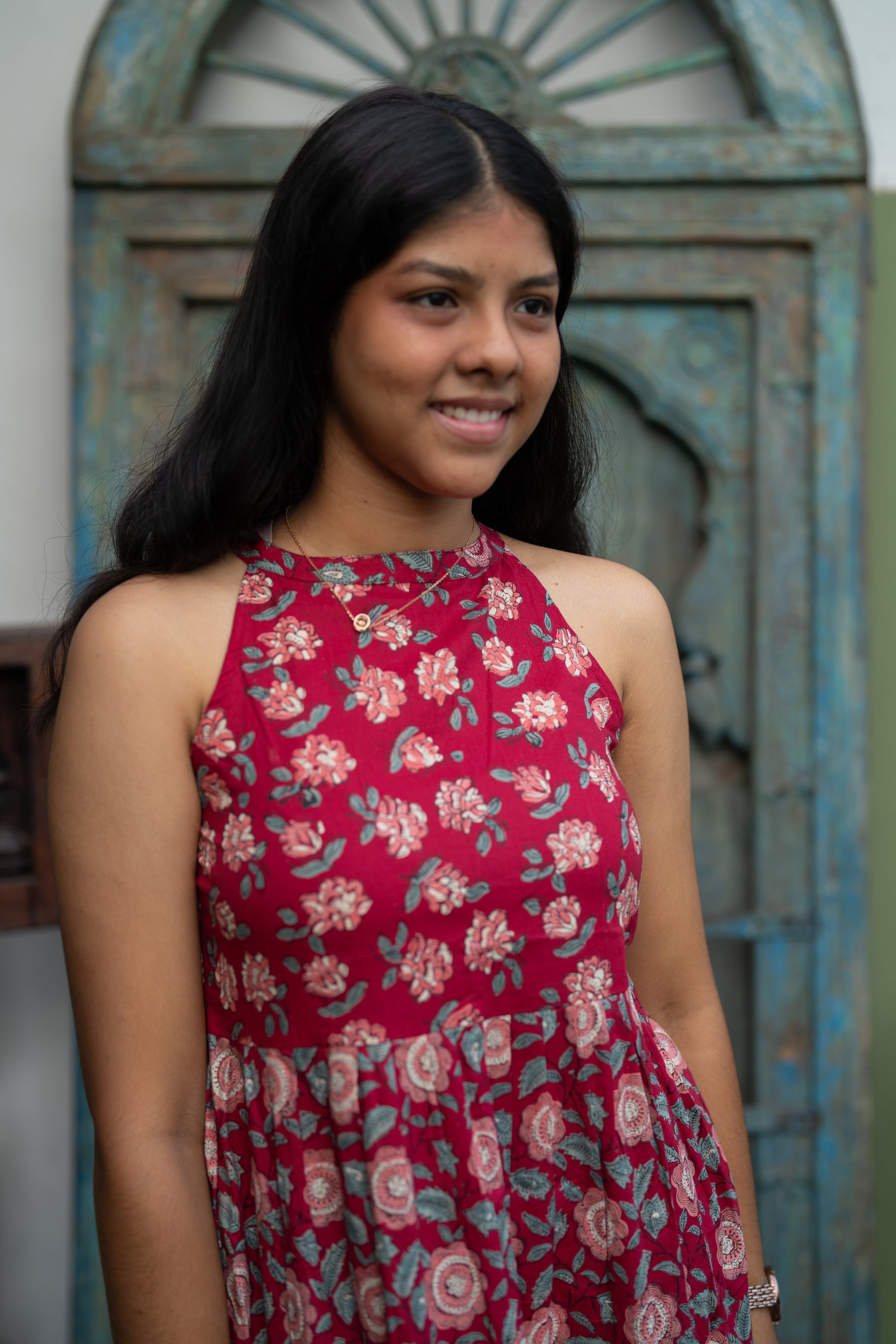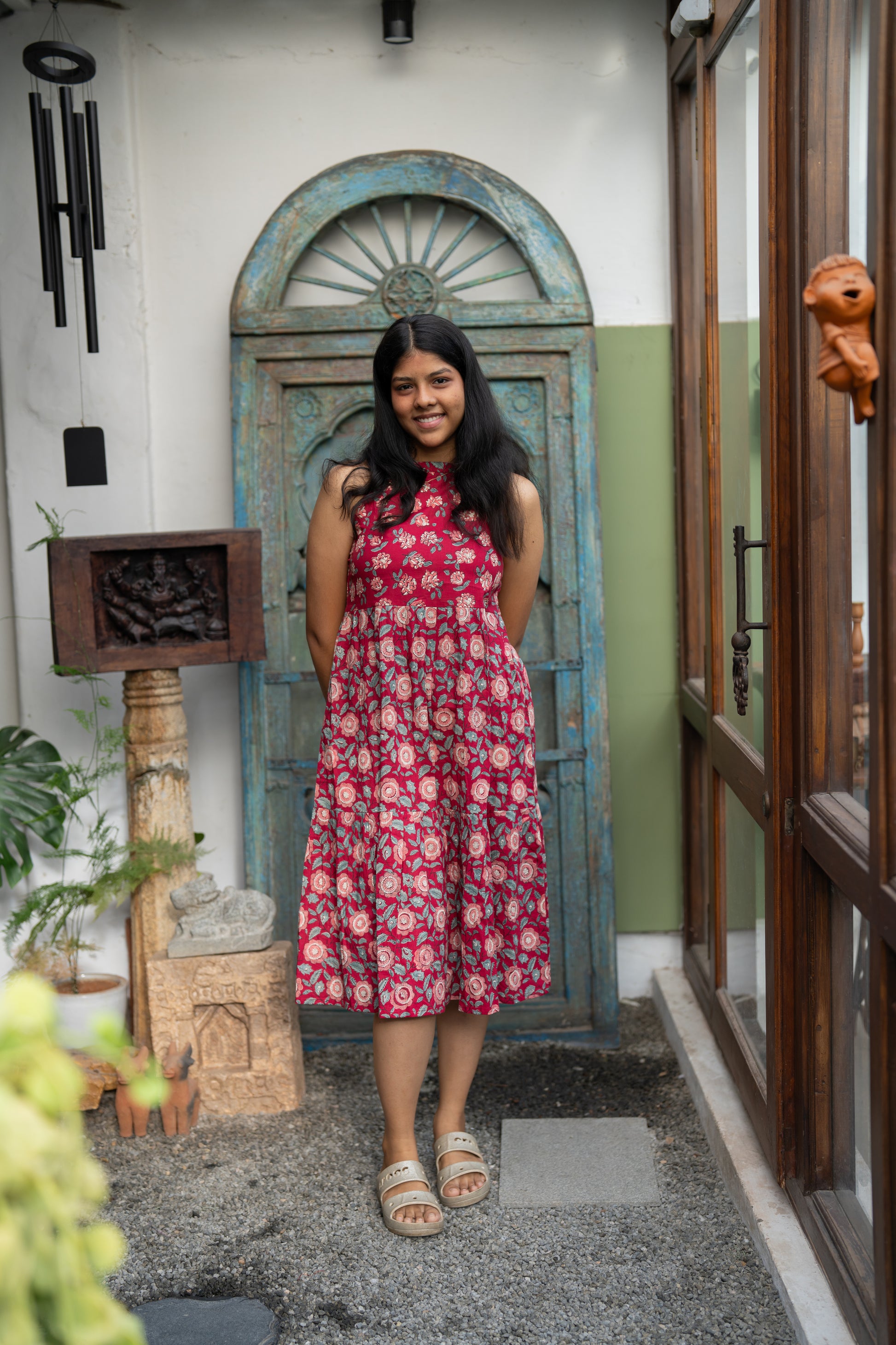 This red floral handblock printed halter neck dress is the ultimate chatpata mood — bold, beautiful, and bursting with flavour. With its layered bottom that sways like a summer breeze and a neckline that adds just the right dash of drama, Kara Pori is our ode to the masaledar moments of growing up desi.