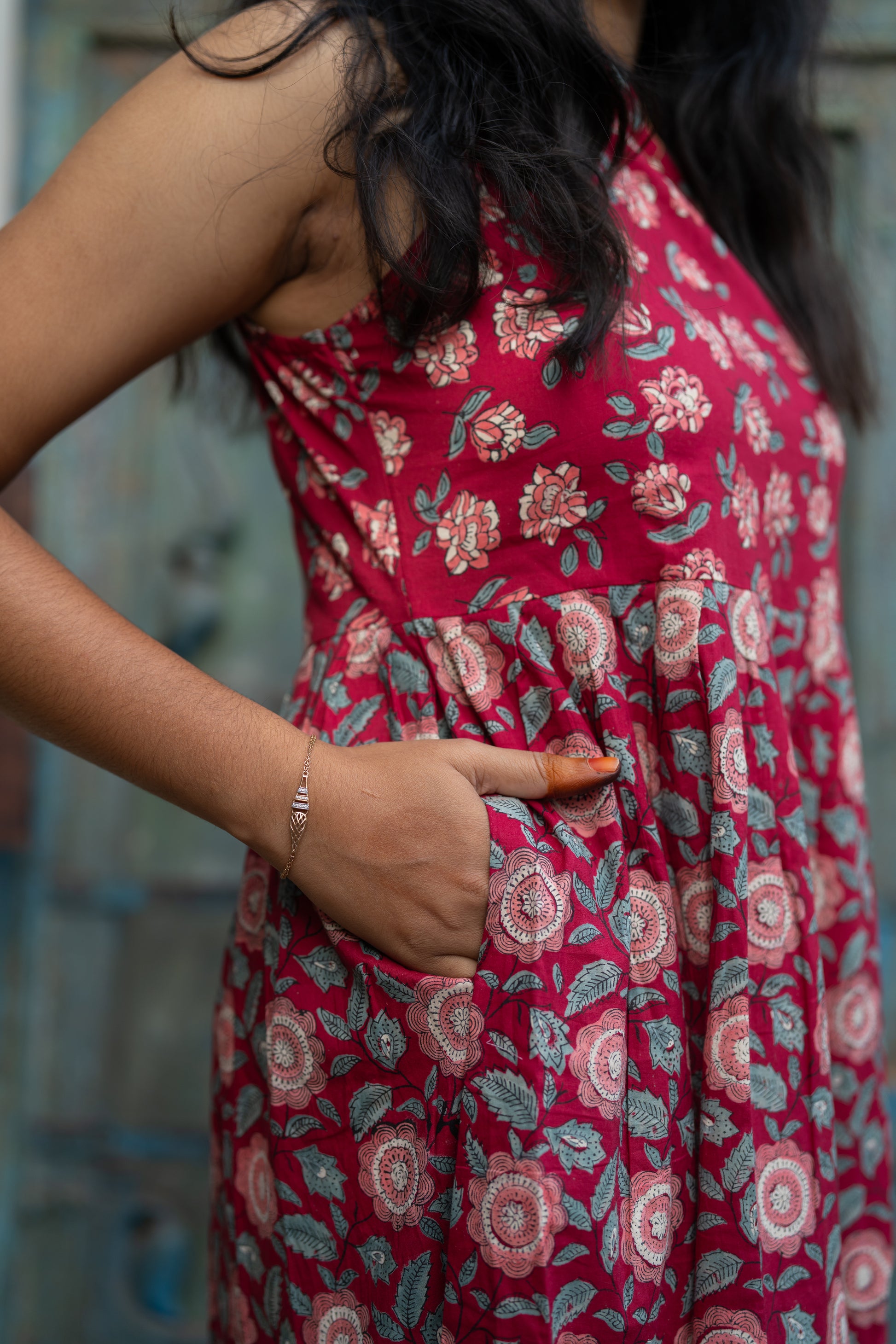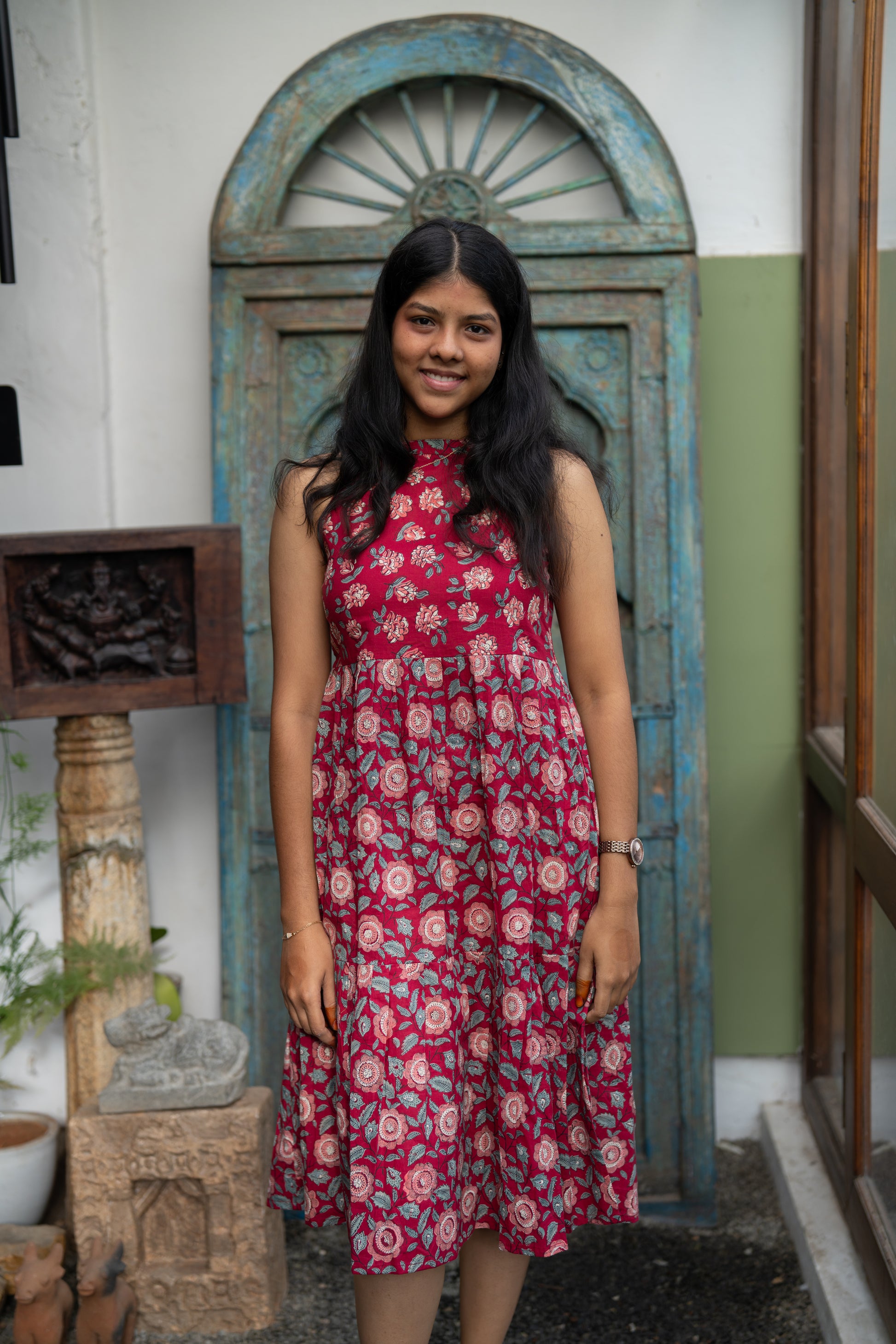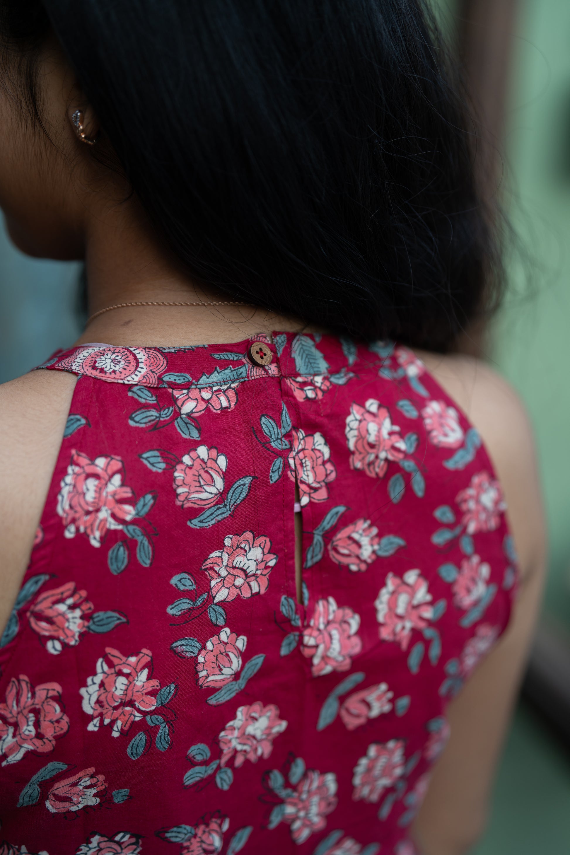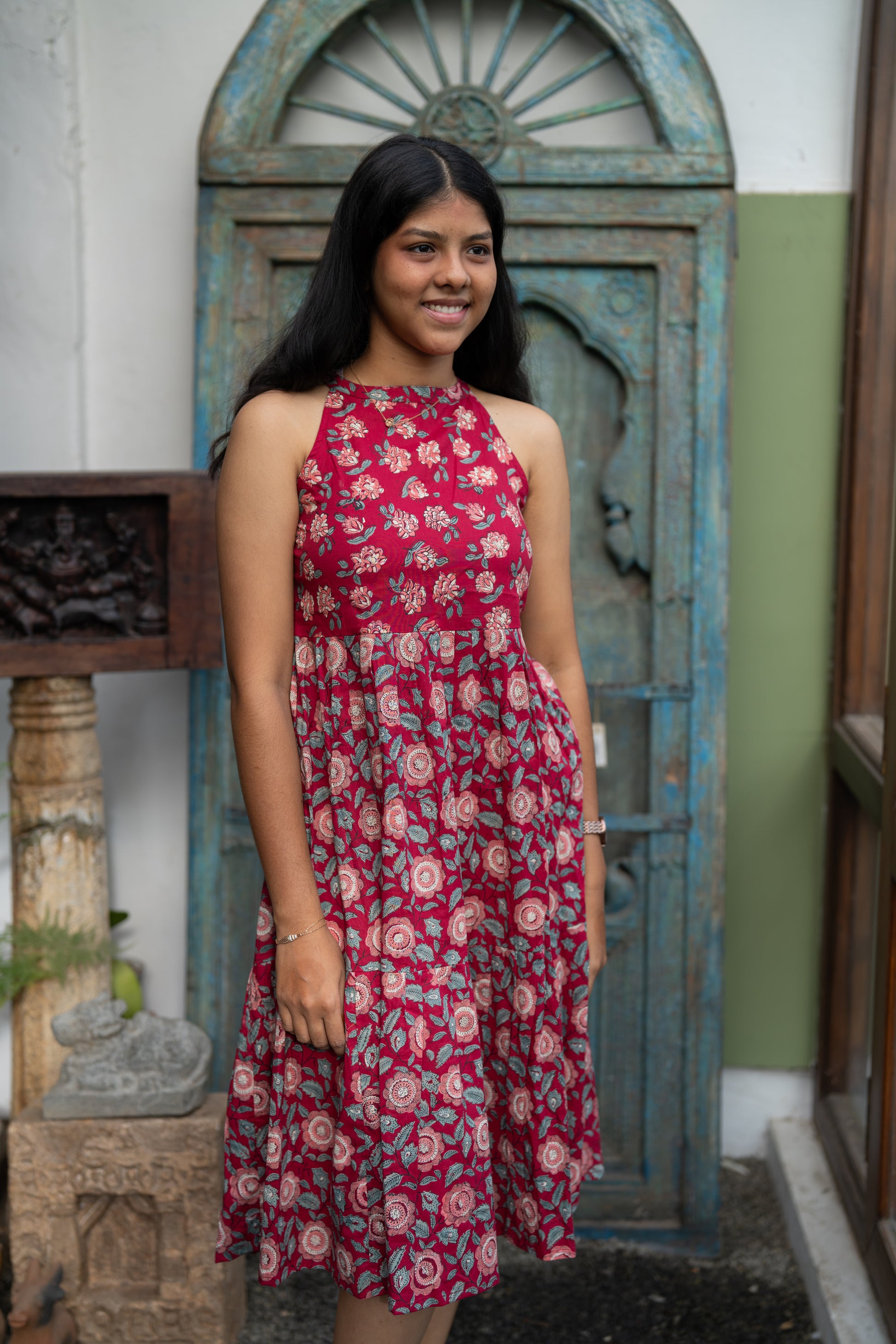 This red floral handblock printed halter neck dress is the ultimate chatpata mood — bold, beautiful, and bursting with flavour. With its layered bottom that sways like a summer breeze and a neckline that adds just the right dash of drama, Kara Pori is our ode to the masaledar moments of growing up desi.