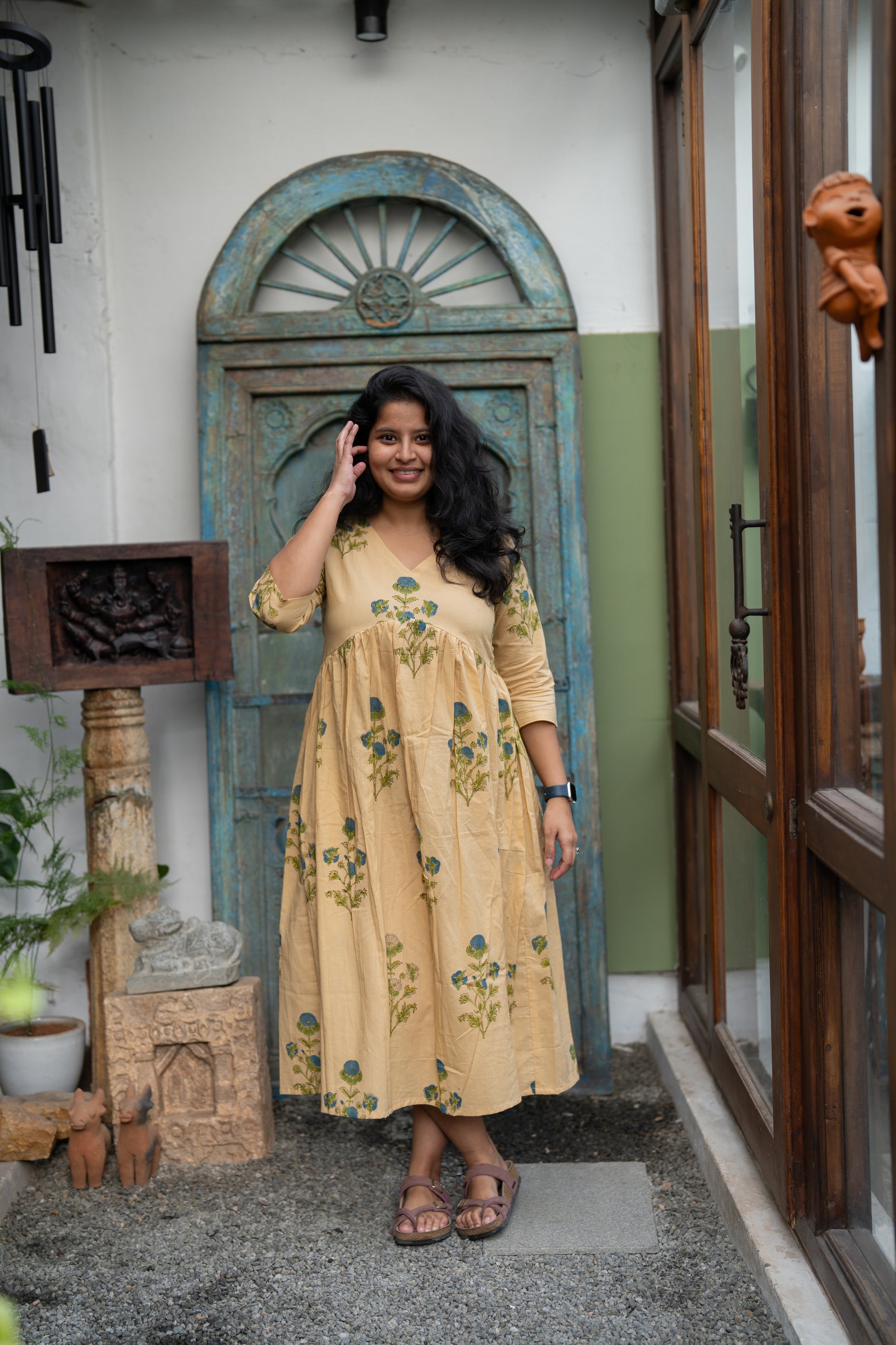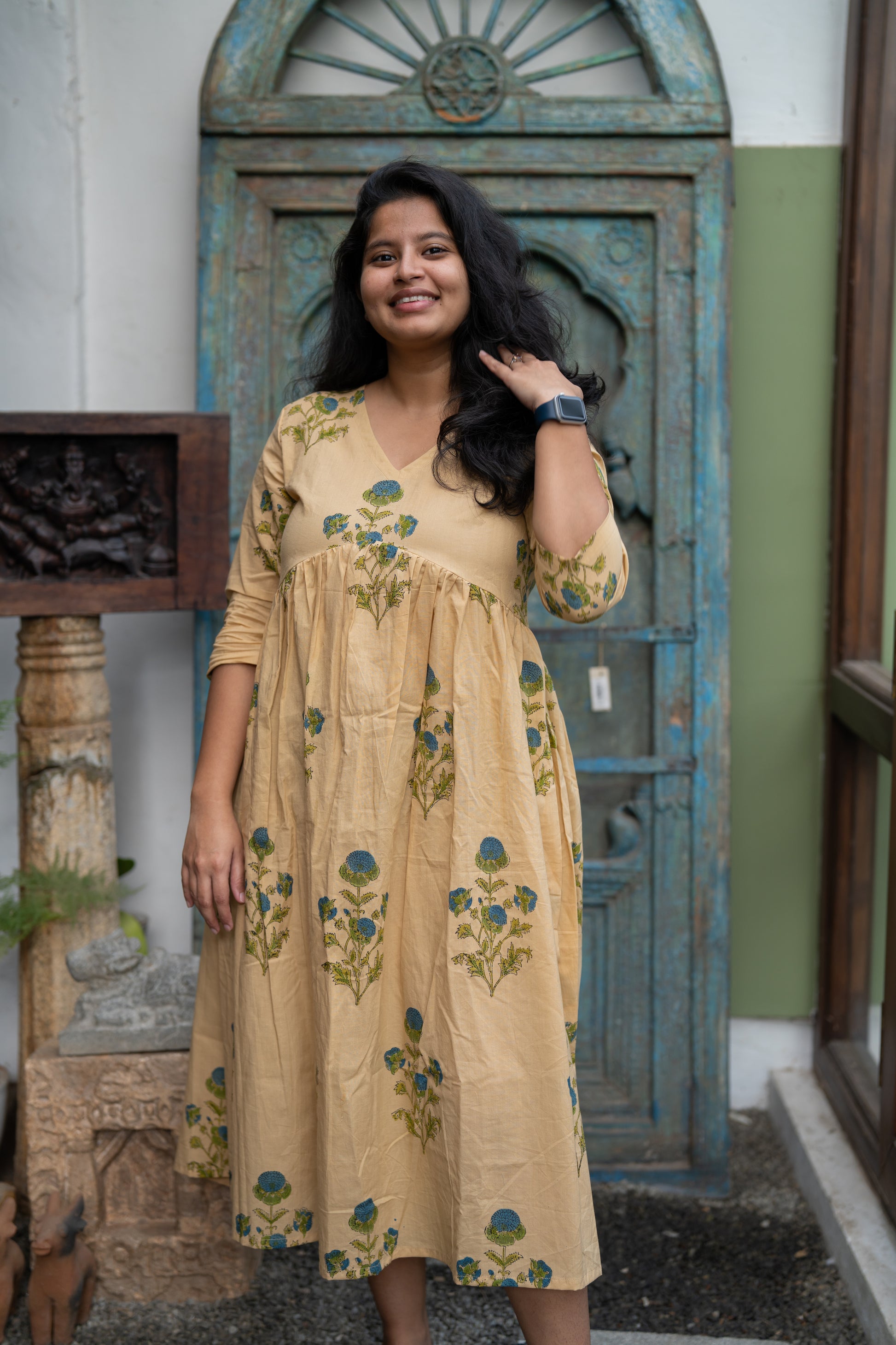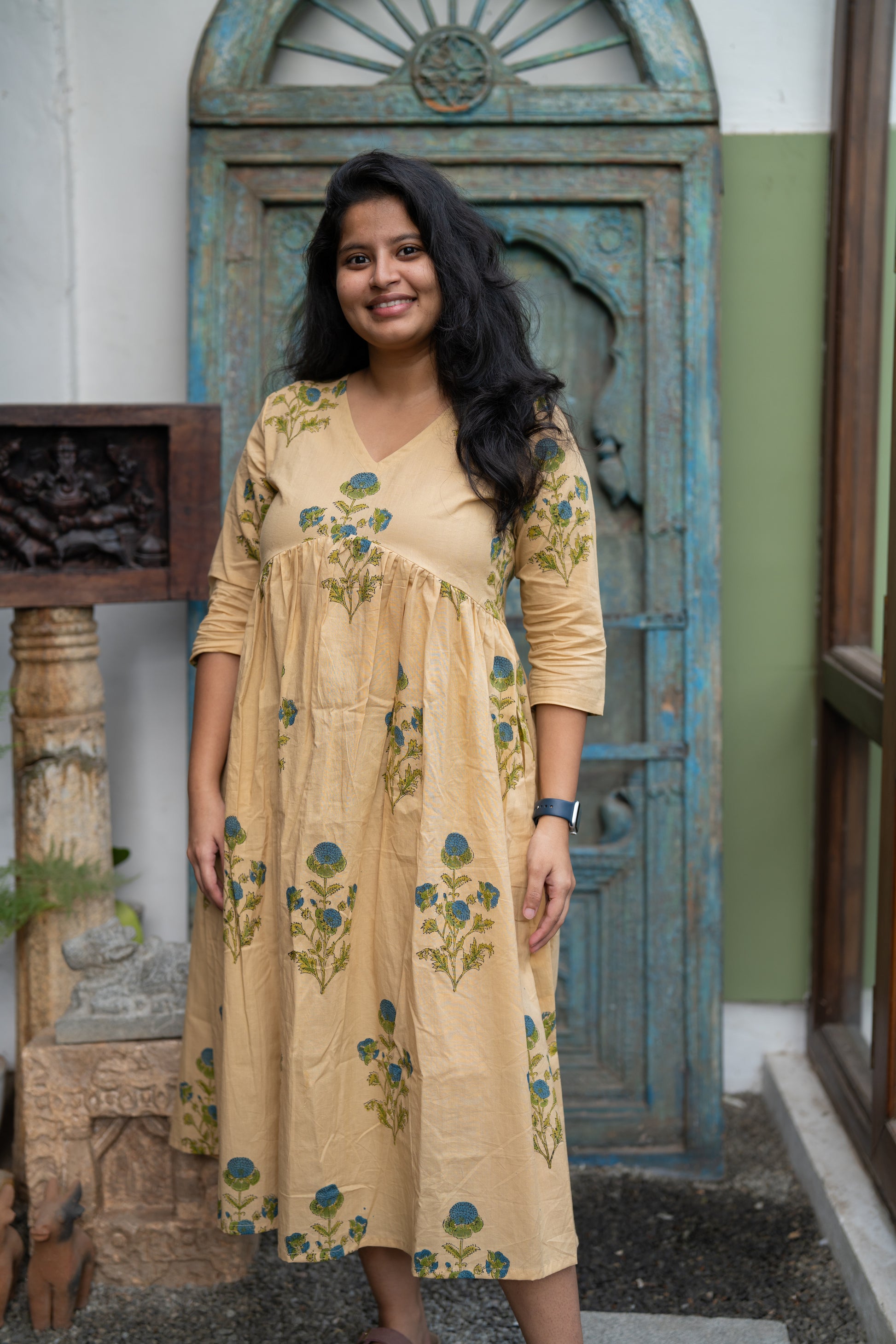 This tan floral handblock printed midi dress with gentle gathers and 3/4th sleeves is a slow summer afternoon stitched into fabric.