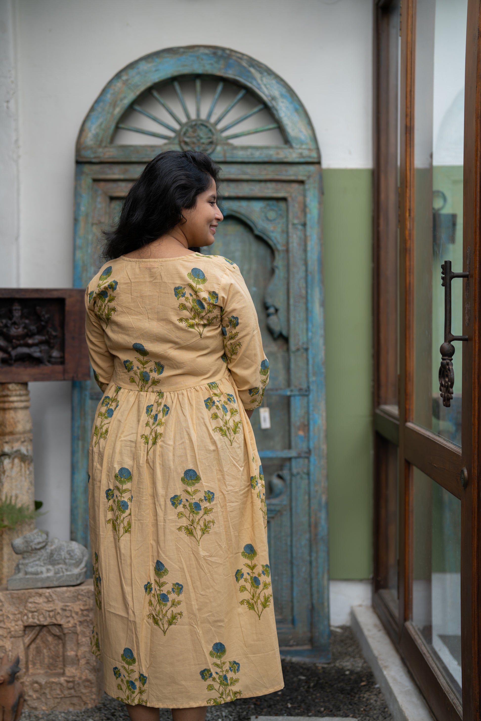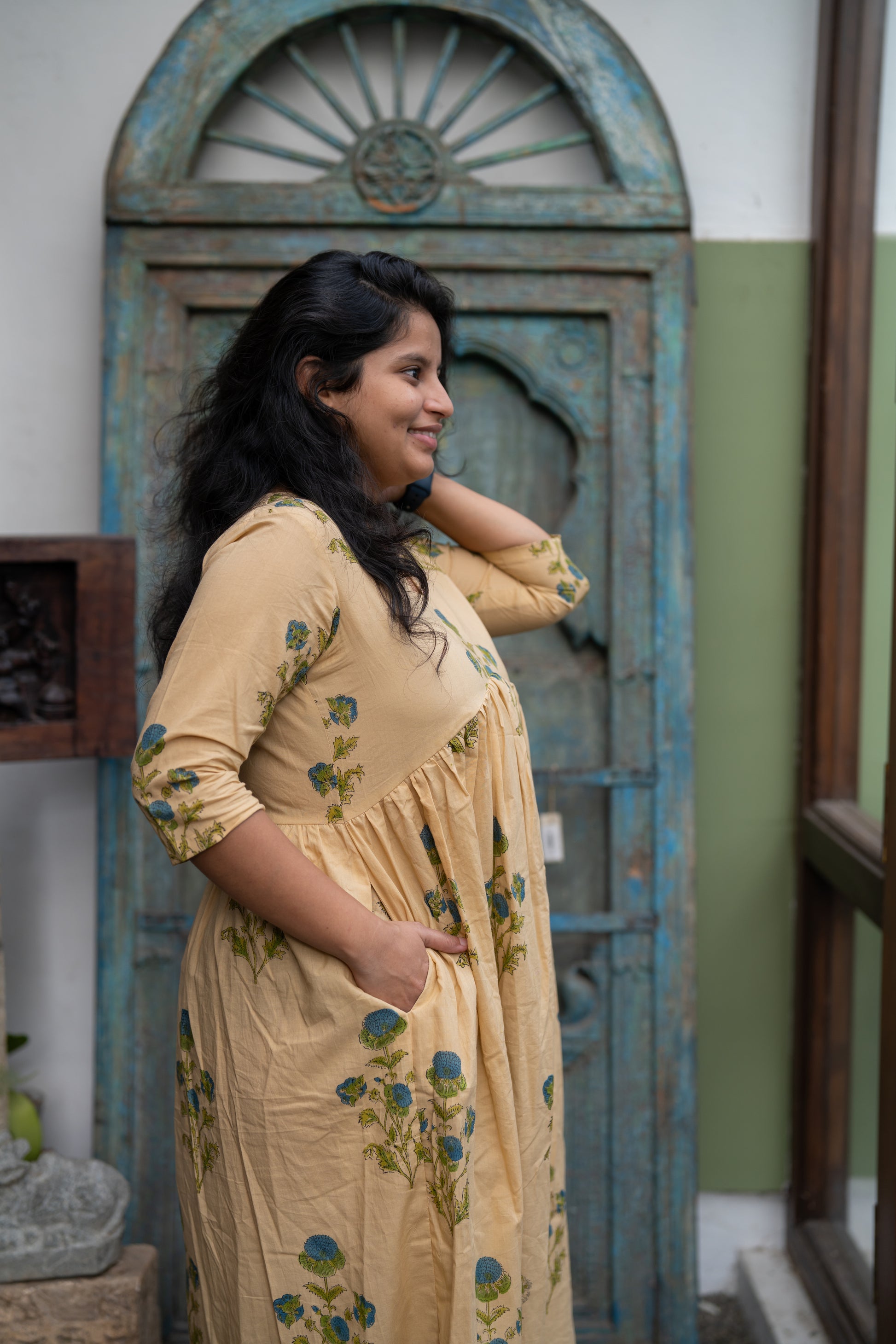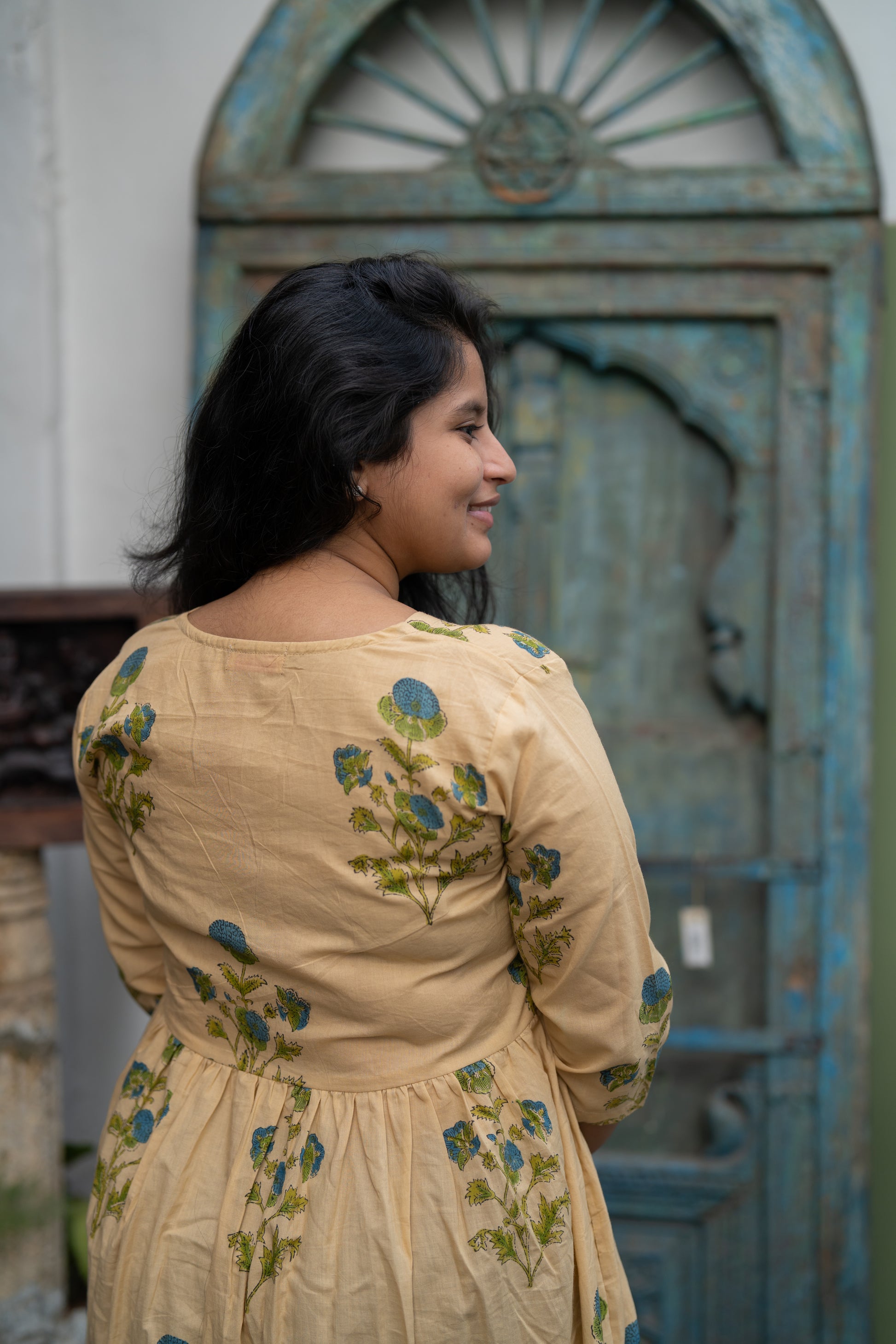 This tan floral handblock printed midi dress with gentle gathers and 3/4th sleeves is a slow summer afternoon stitched into fabric.