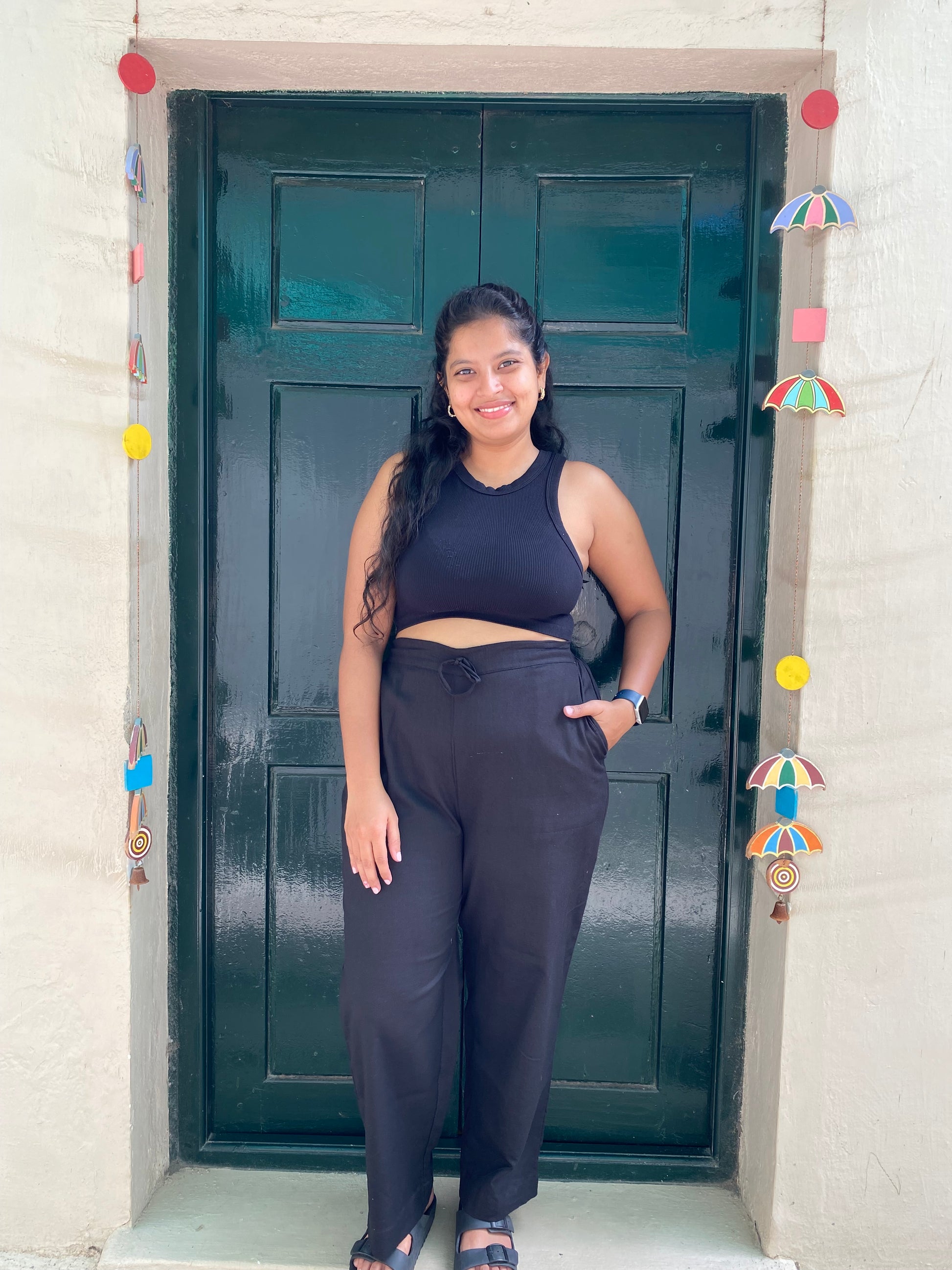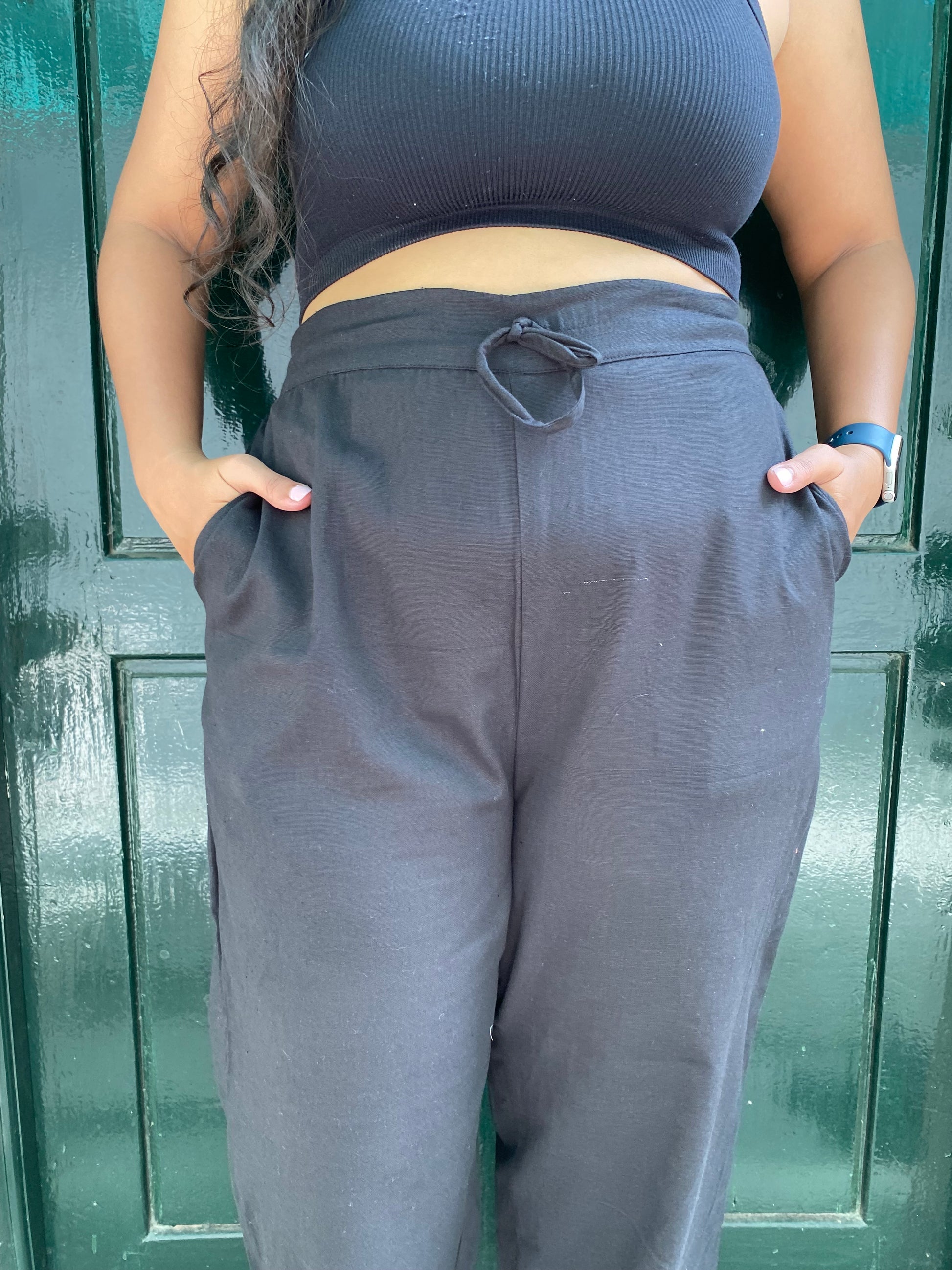 Introducing 'Karuppu' pants – pure cotton black pants with a comfy back elastic and a stylish front tie naada. Perfectly versatile to pair with a kurta or a short top, these pants are where comfort meets effortless fashion.