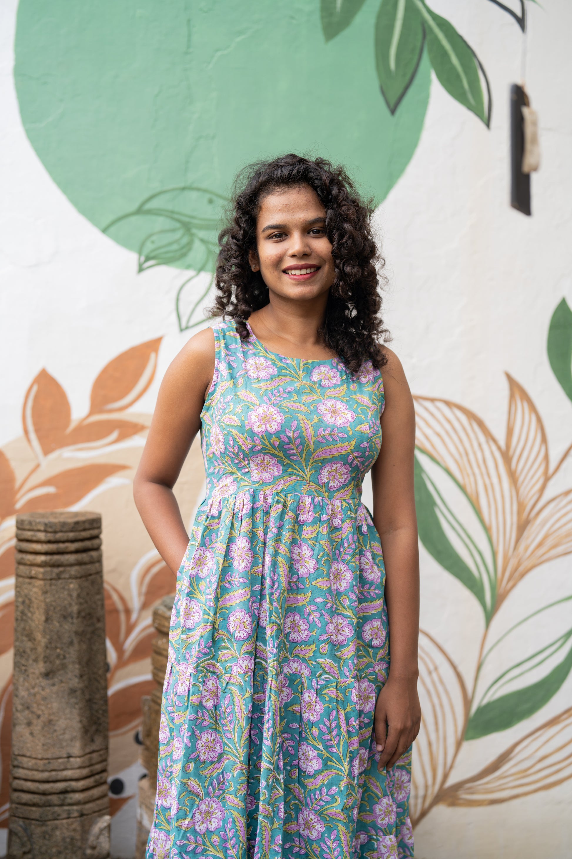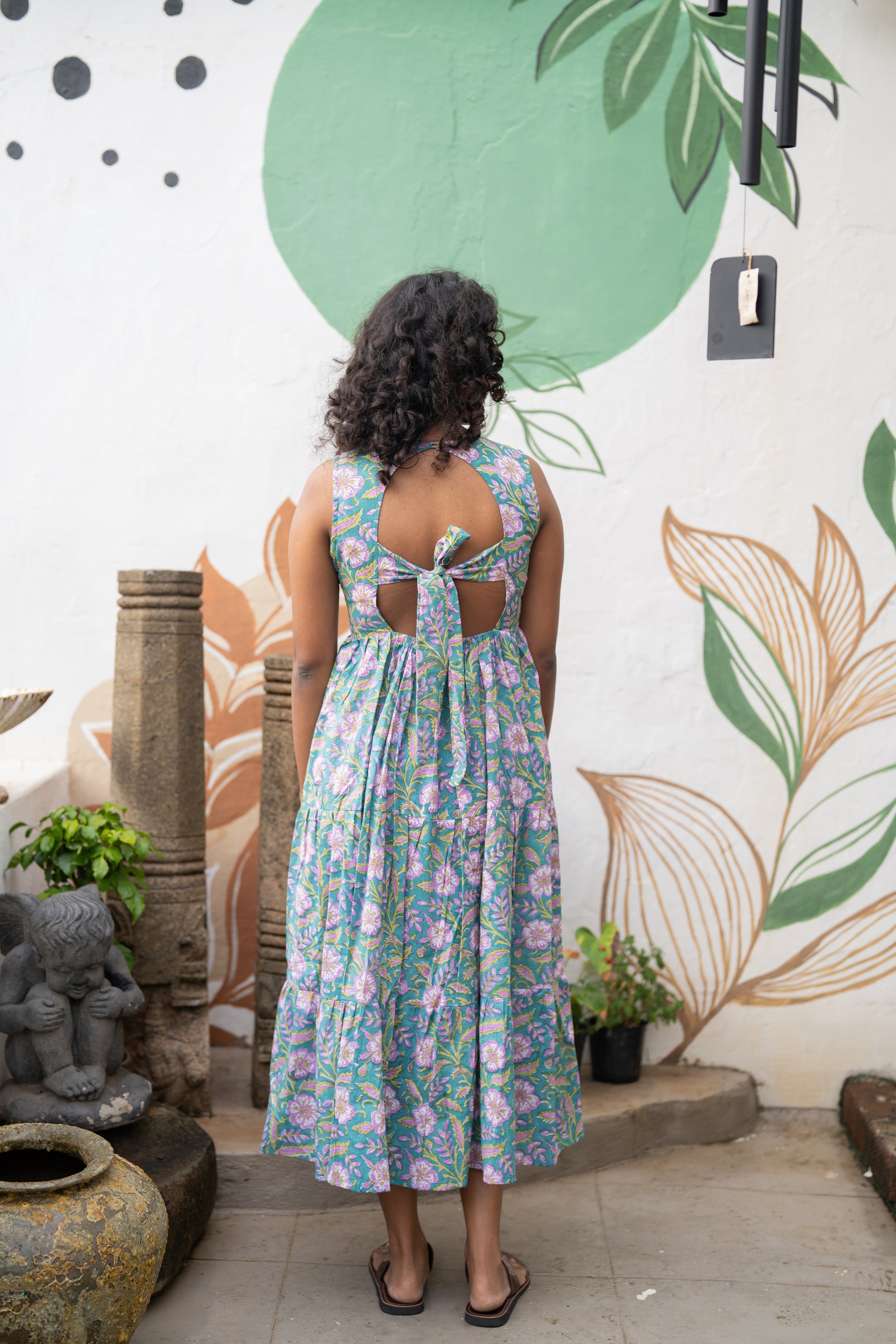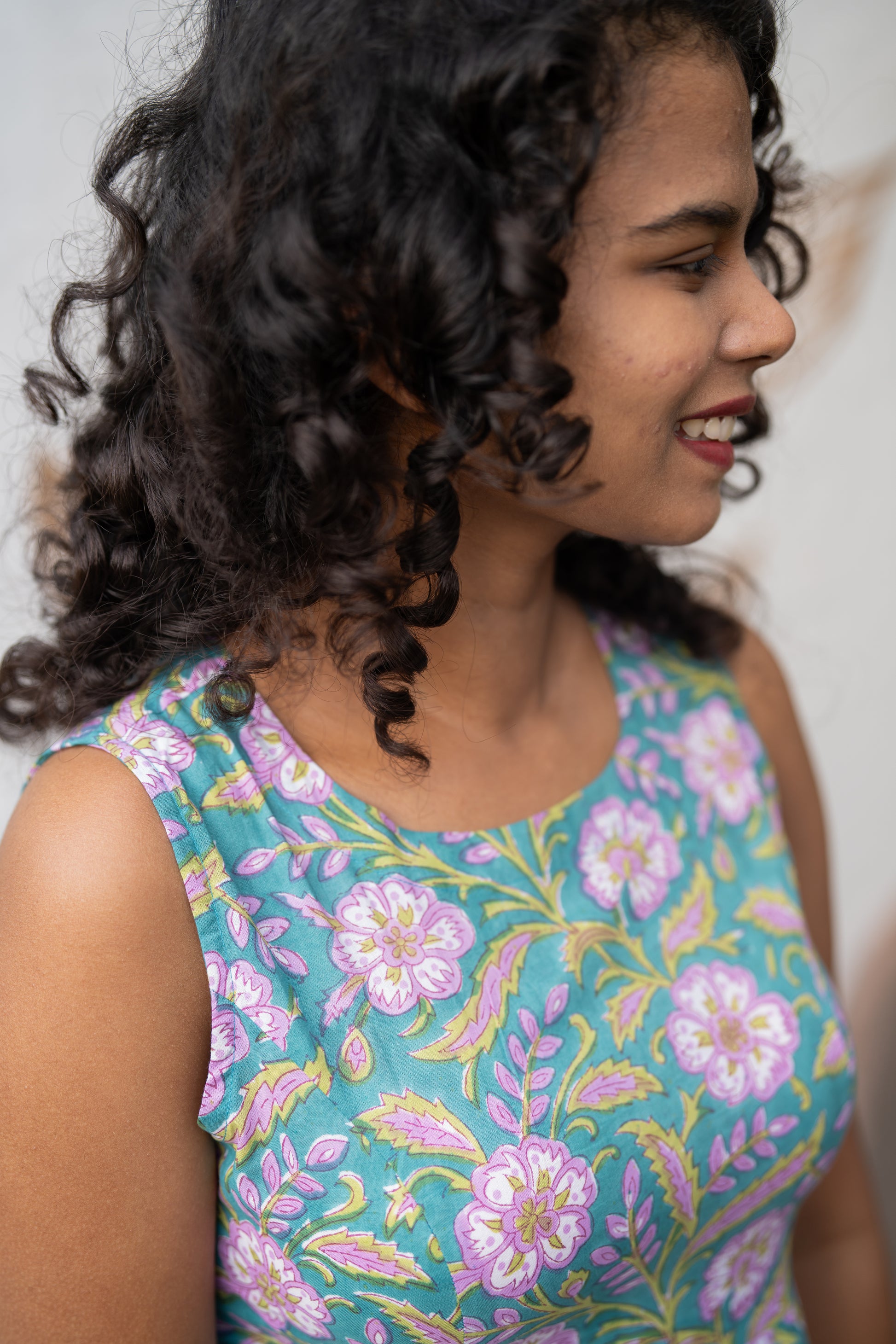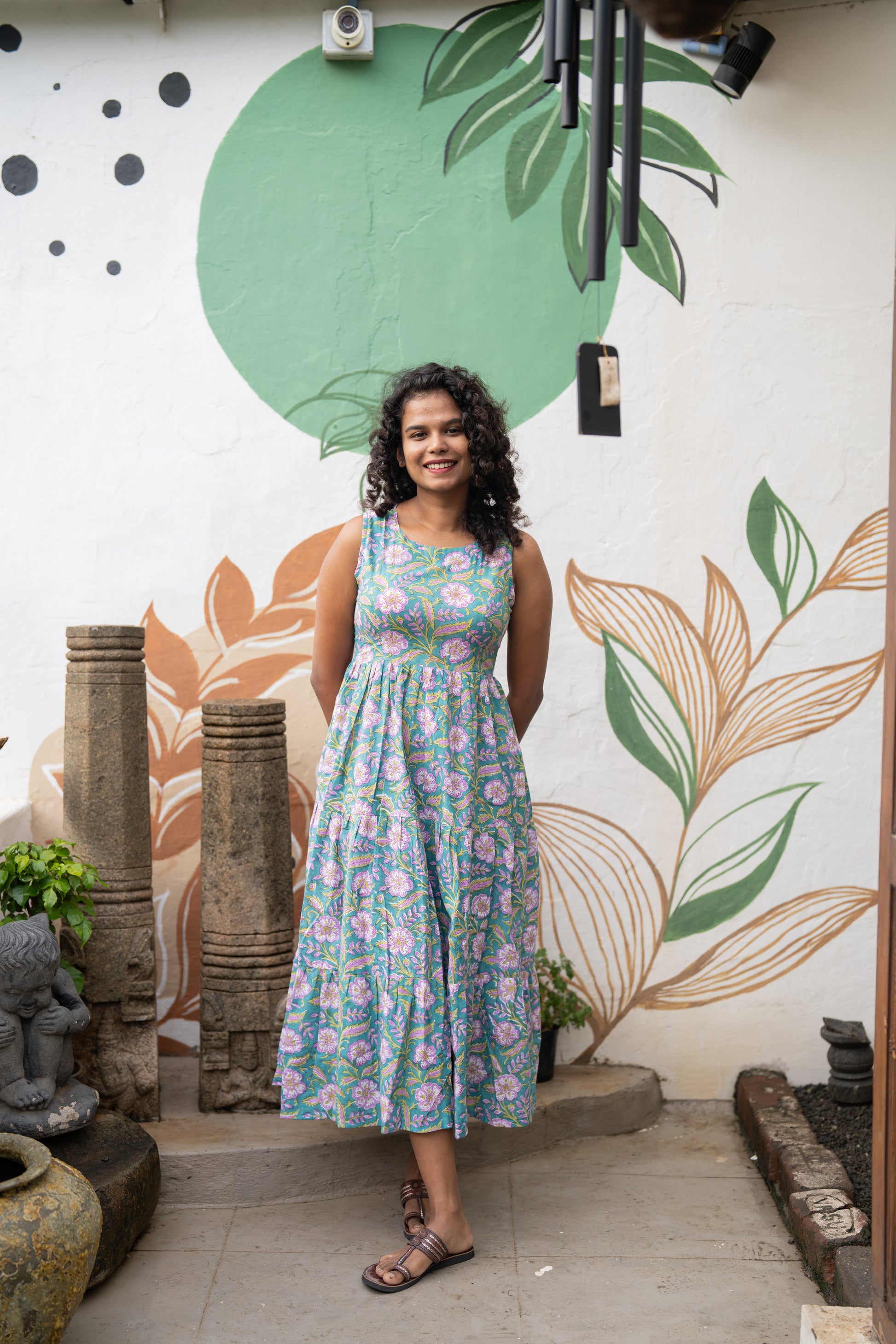 This green floral handblock dress is your monsoon-approved mood lifter. With a twirly silhouette and a back-tie bow that's as cute as your snack cravings, Maska Chaska brings that perfect mix of mellow florals and chatori fun — just like your favourite toast topped with a little extra masala.