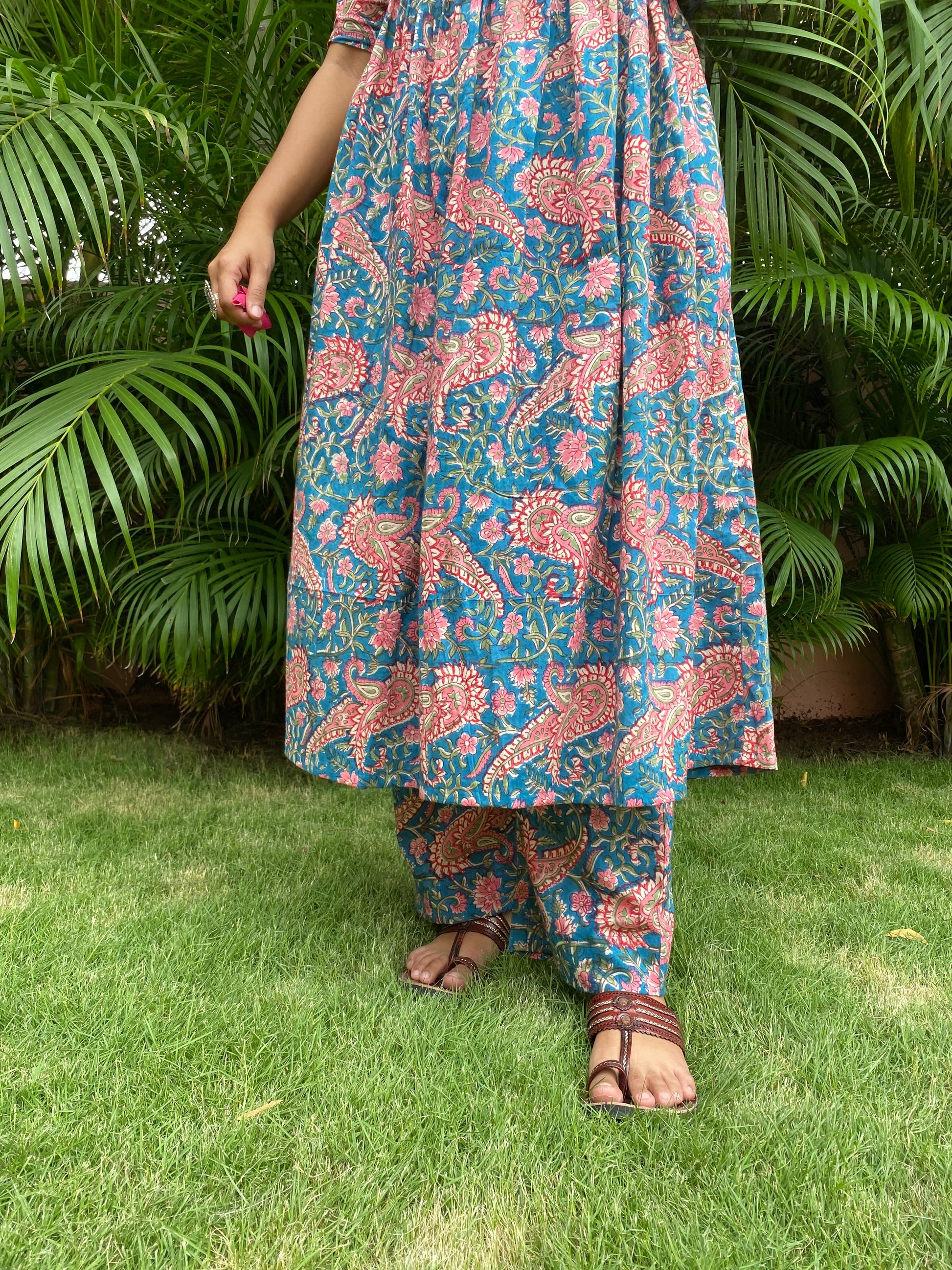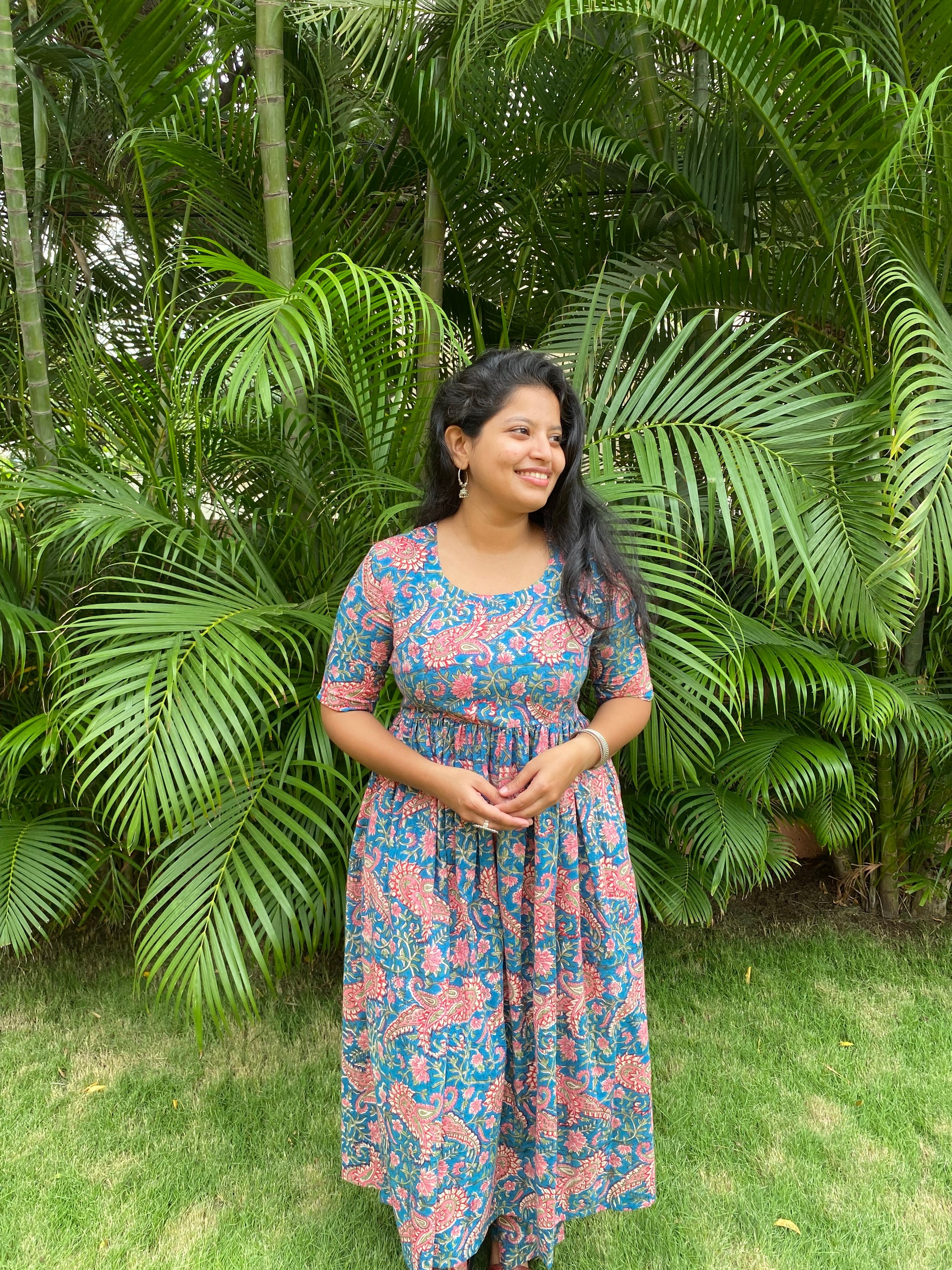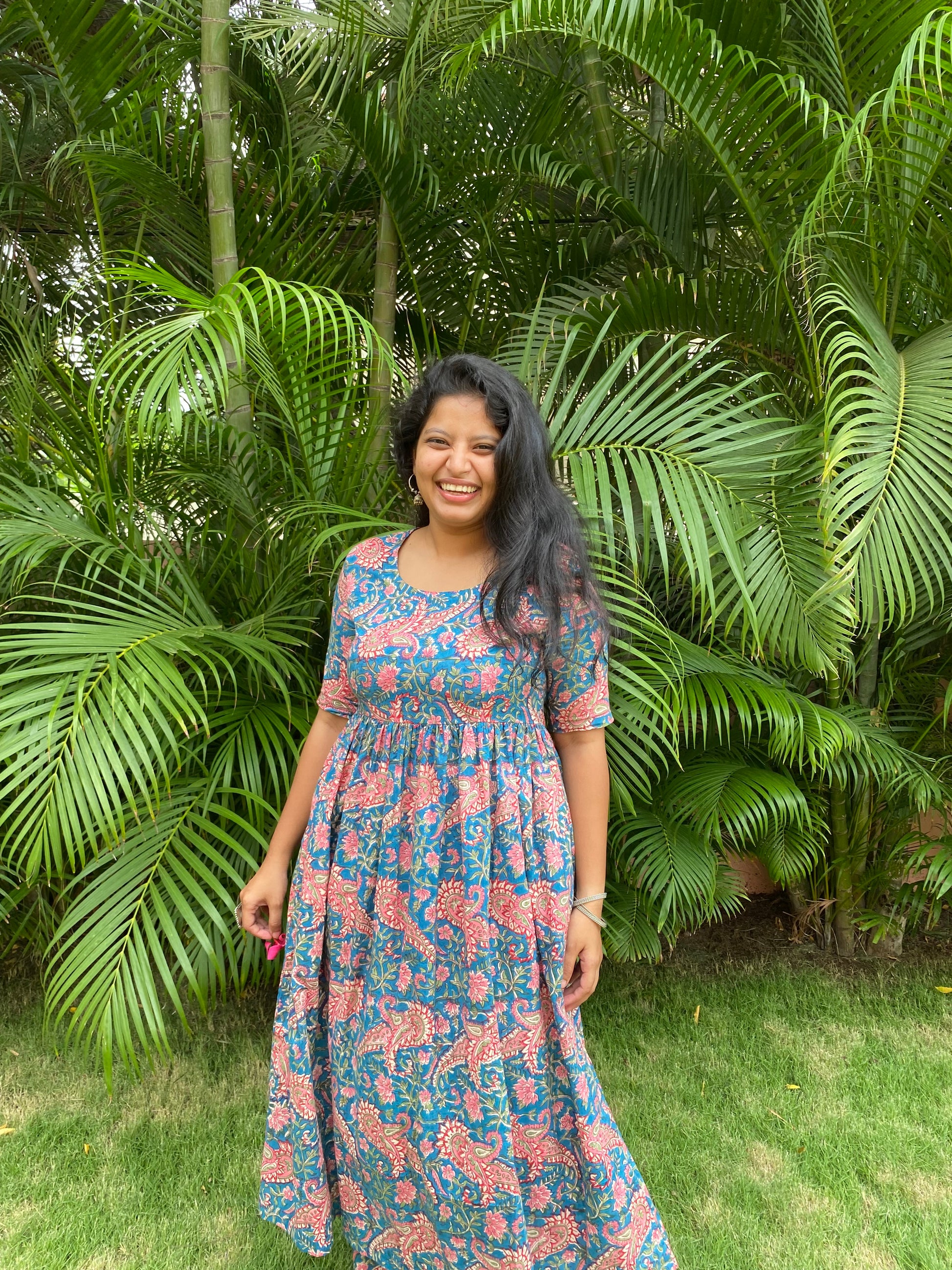 Stay comfy and stylish in our pure cotton ”Mathappu” pleated kurta set! Featuring a playful paisley print, a chic design, and a refreshing green hue, it’s perfect for a relaxed, yet vibrant look.