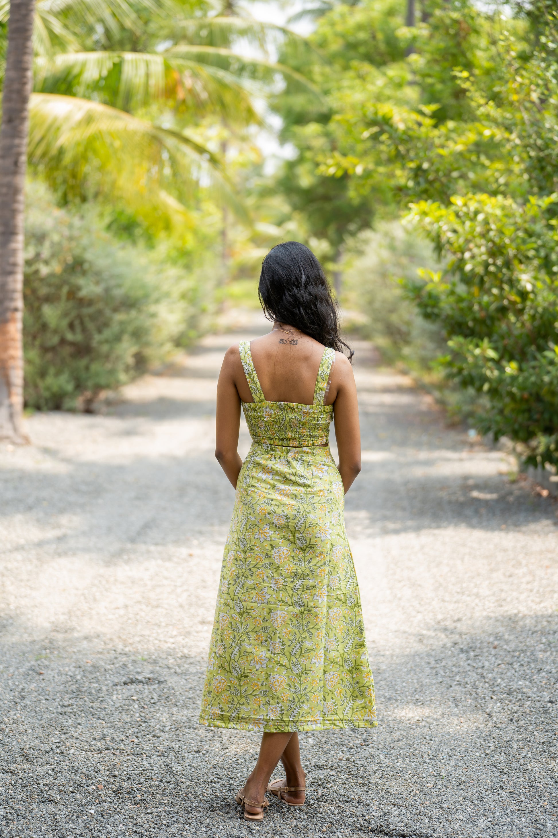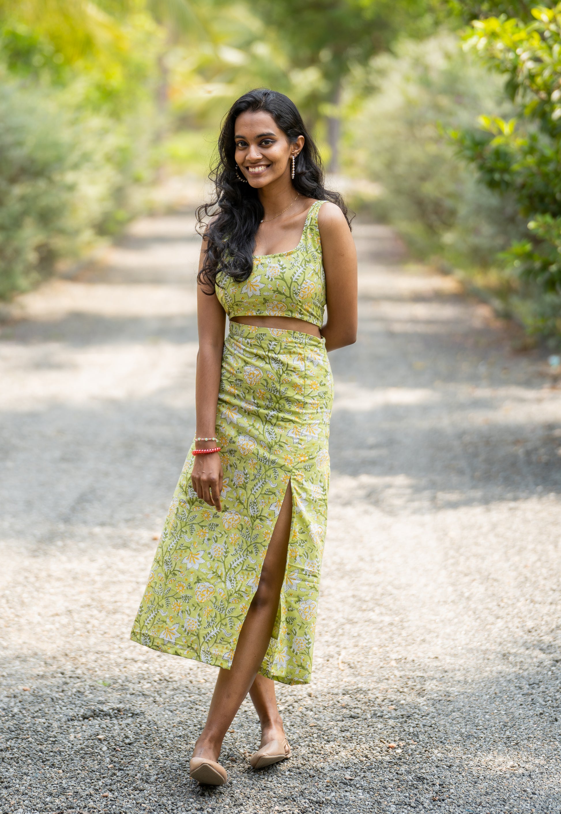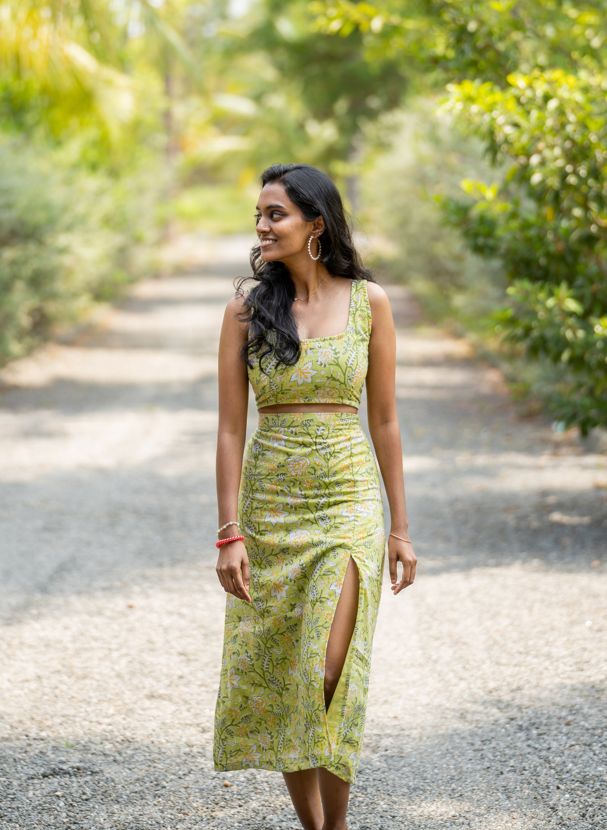 Ishwarya is wearing the size โXSโ in skirt and crop top.