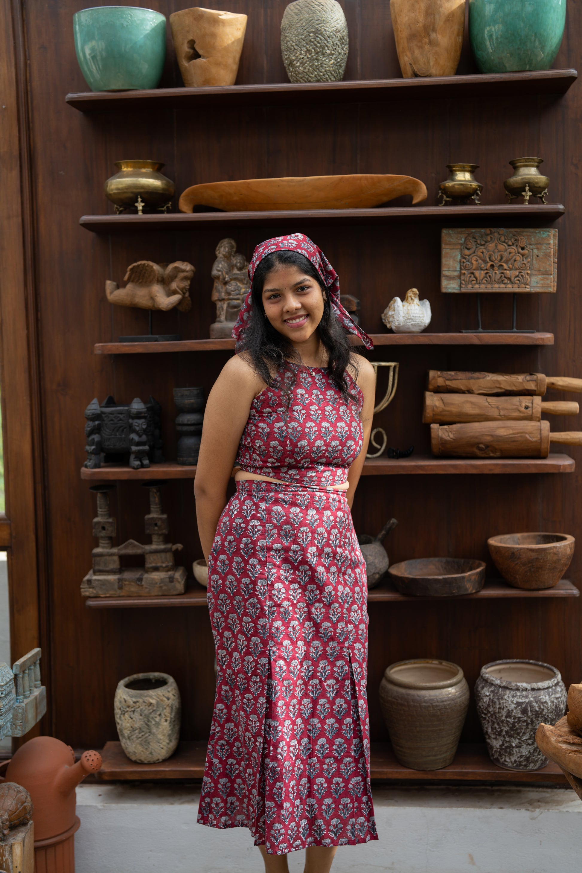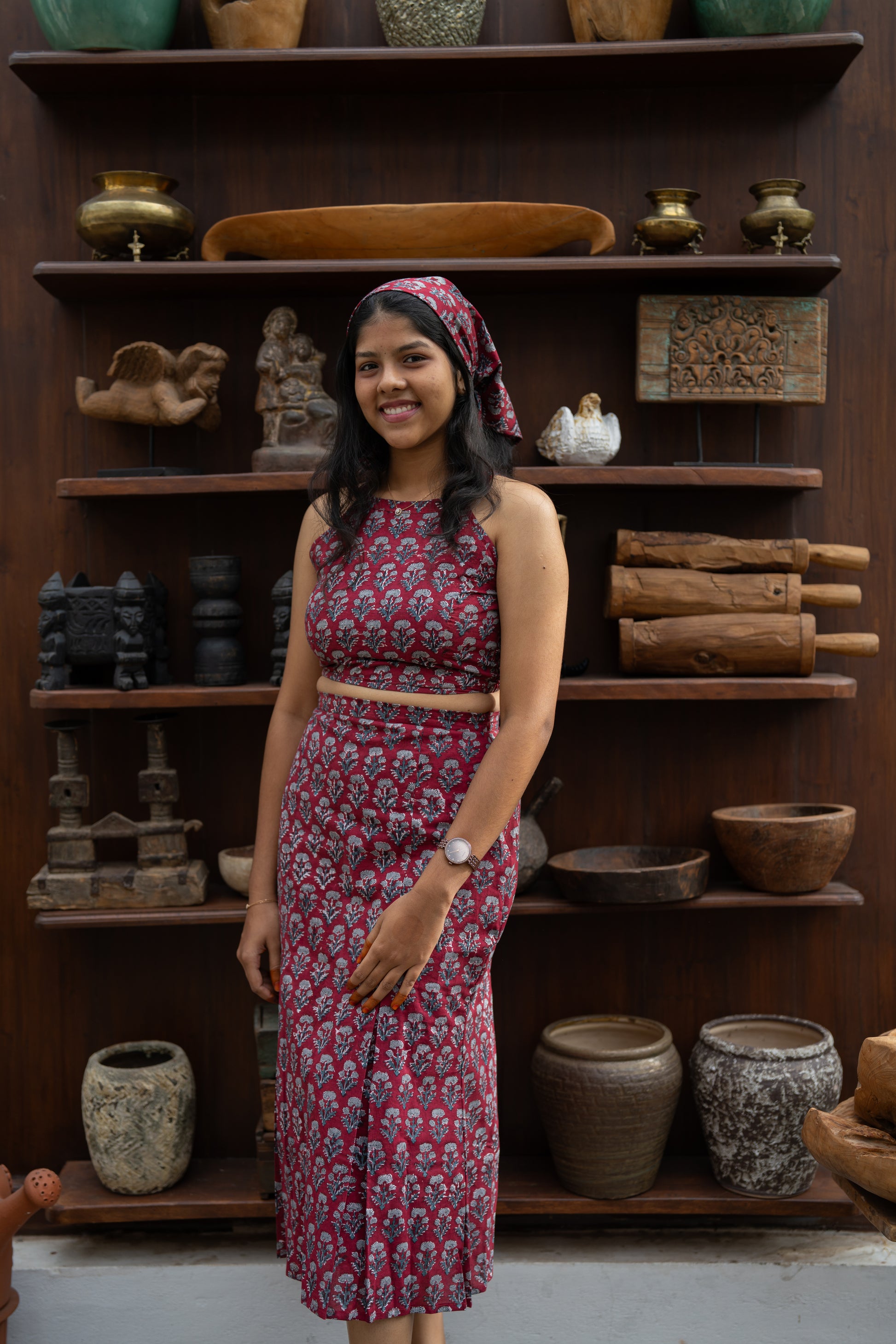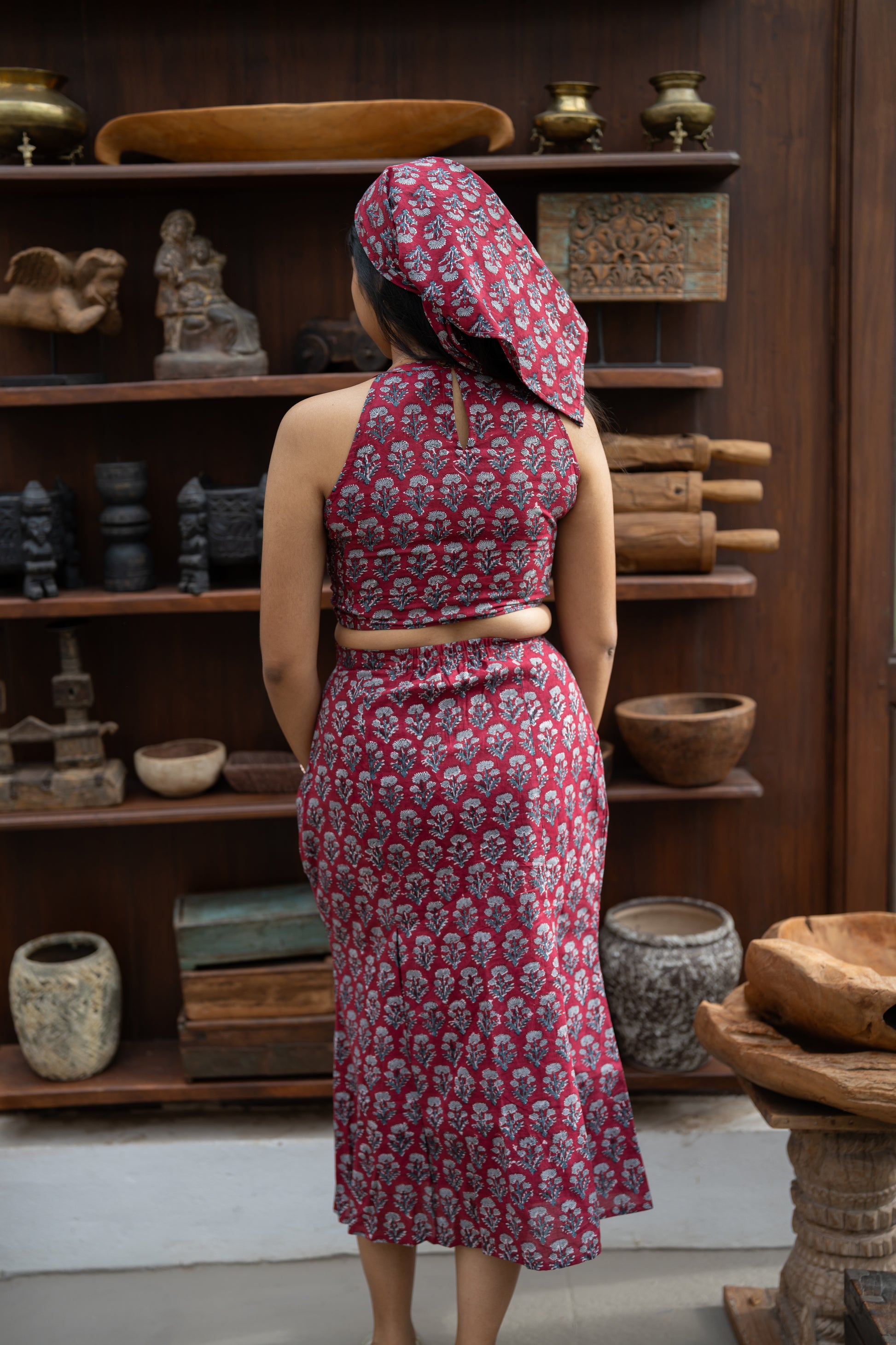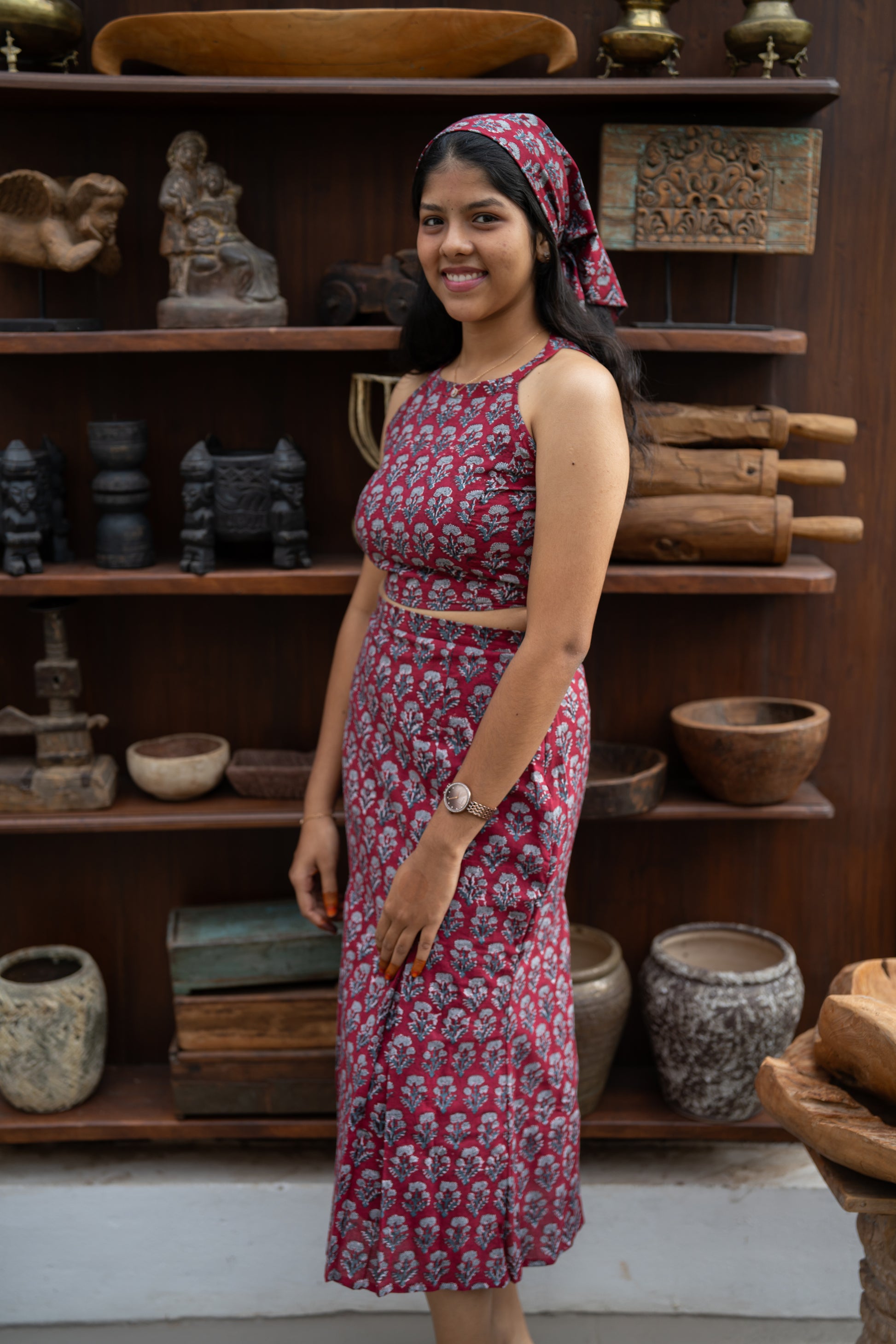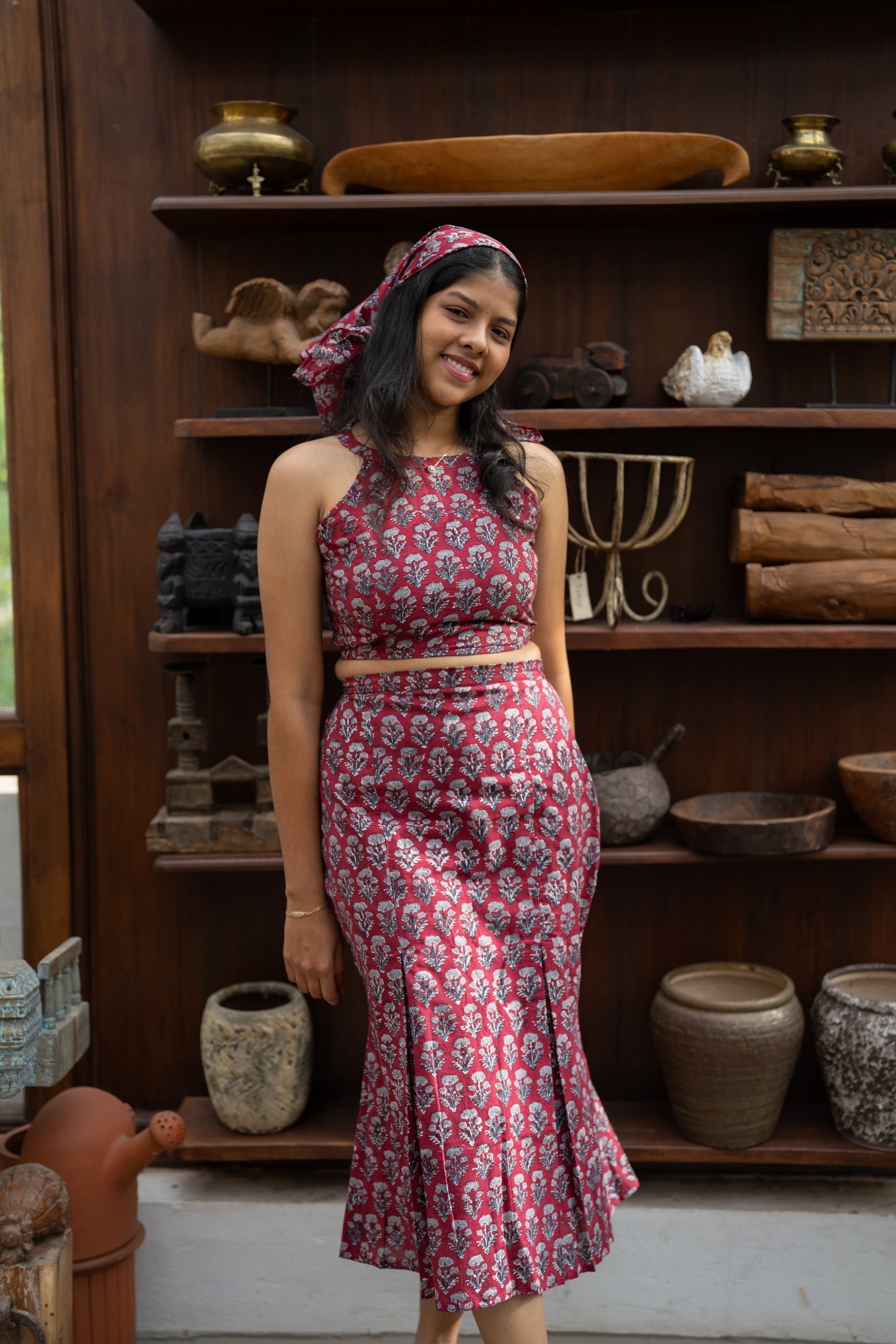 This fiery red co-ord set from our Khatta Meetha collection is here to spice things up! The midi-length mermaid skirt hugs you just right with its flattering flare, while the halter neck crop top — featuring elasticated sides for that perfect snug fit — brings all the drama you need. Together, they’re the ultimate combo of bold flavour and irresistible flair, just like your favourite pickle that adds a punch to every plate.