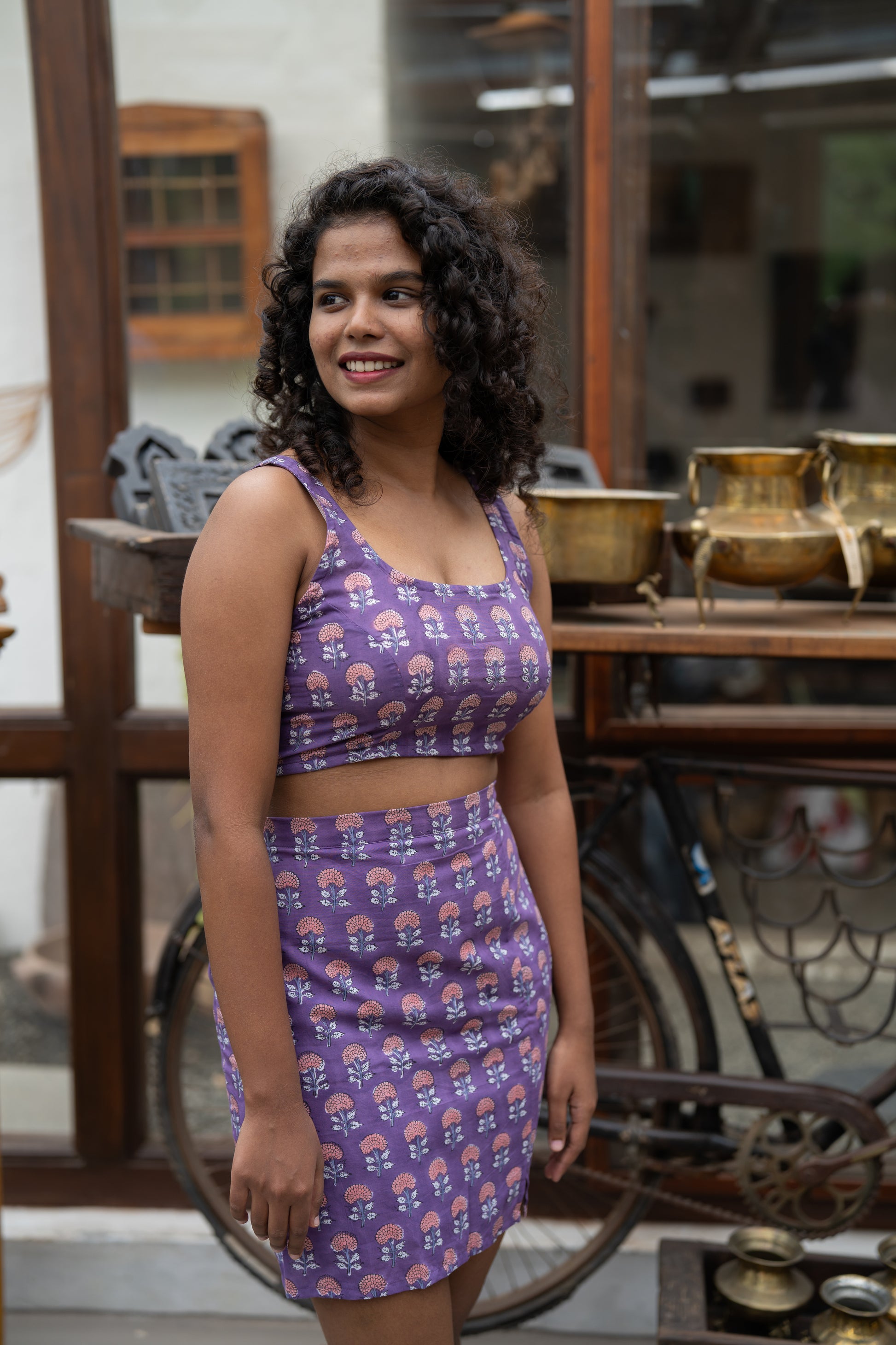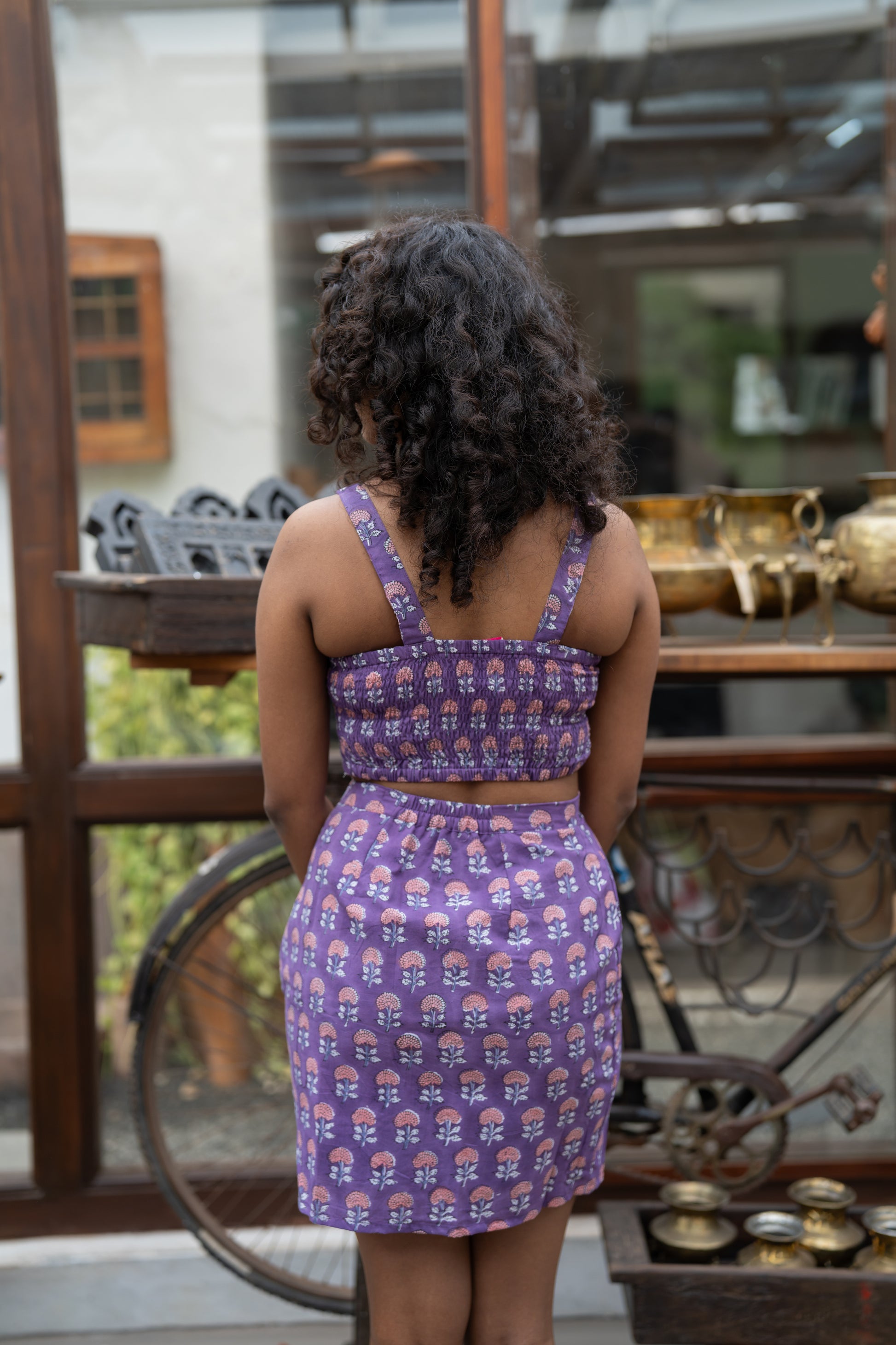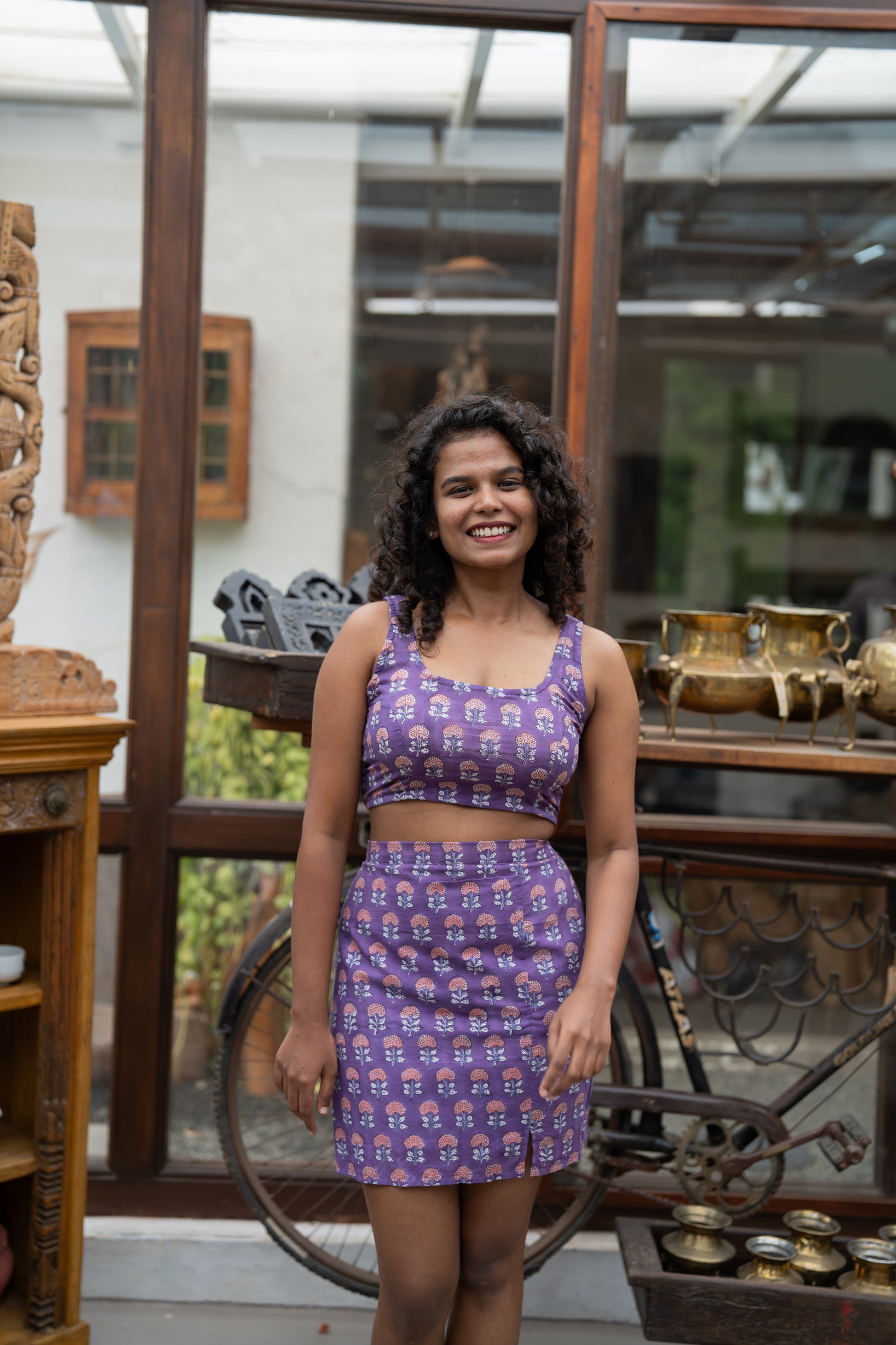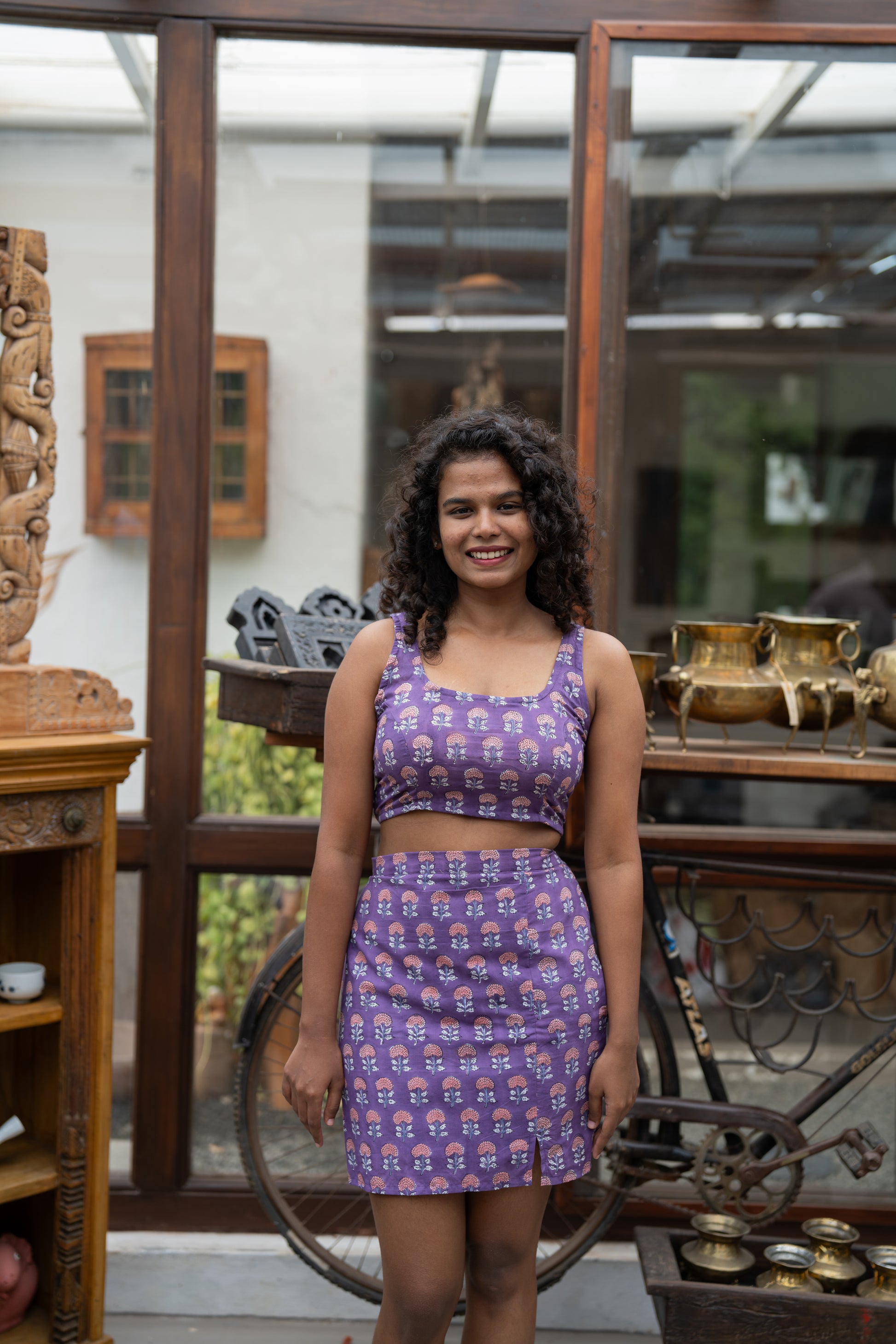 This cute purple co-ord set is your Khatta Meetha wardrobe crush in full form. The mini skirt features a cheeky little slit for that flirty touch, while the matching crop top hugs you in all the right places thanks to its elasticated back. It’s the perfect mix of playful and bold — made for days when you're feeling cute and a little spicy.