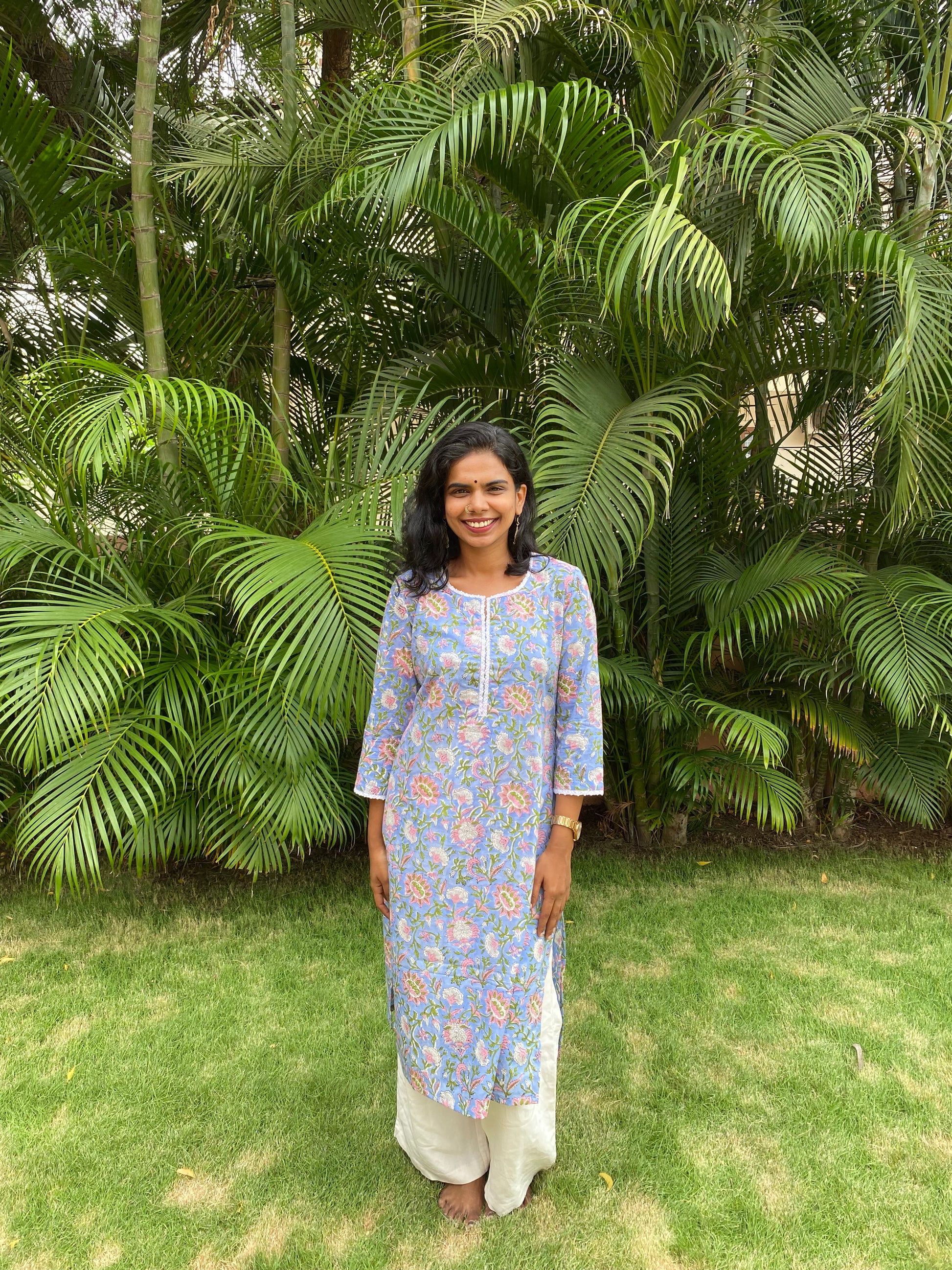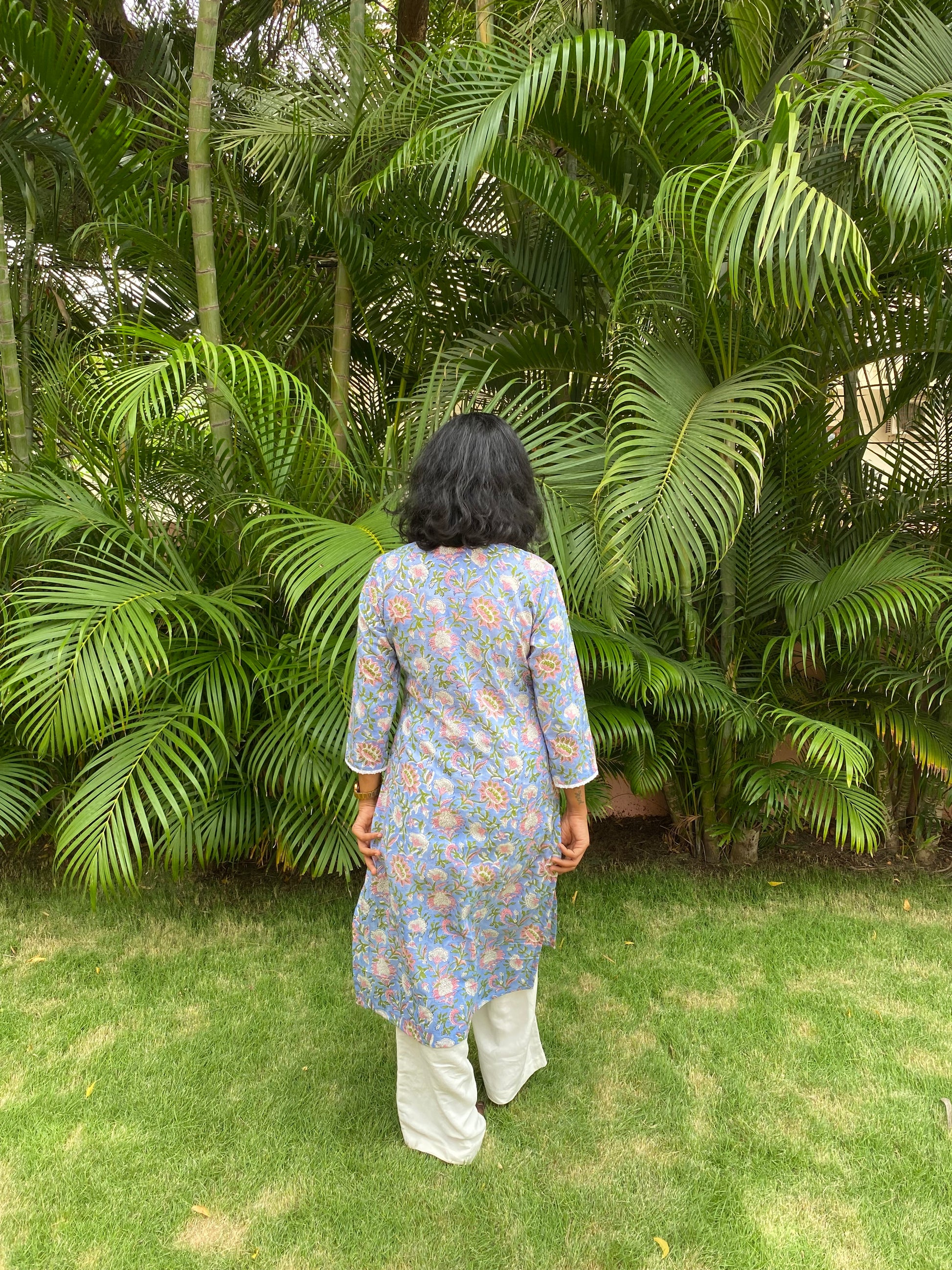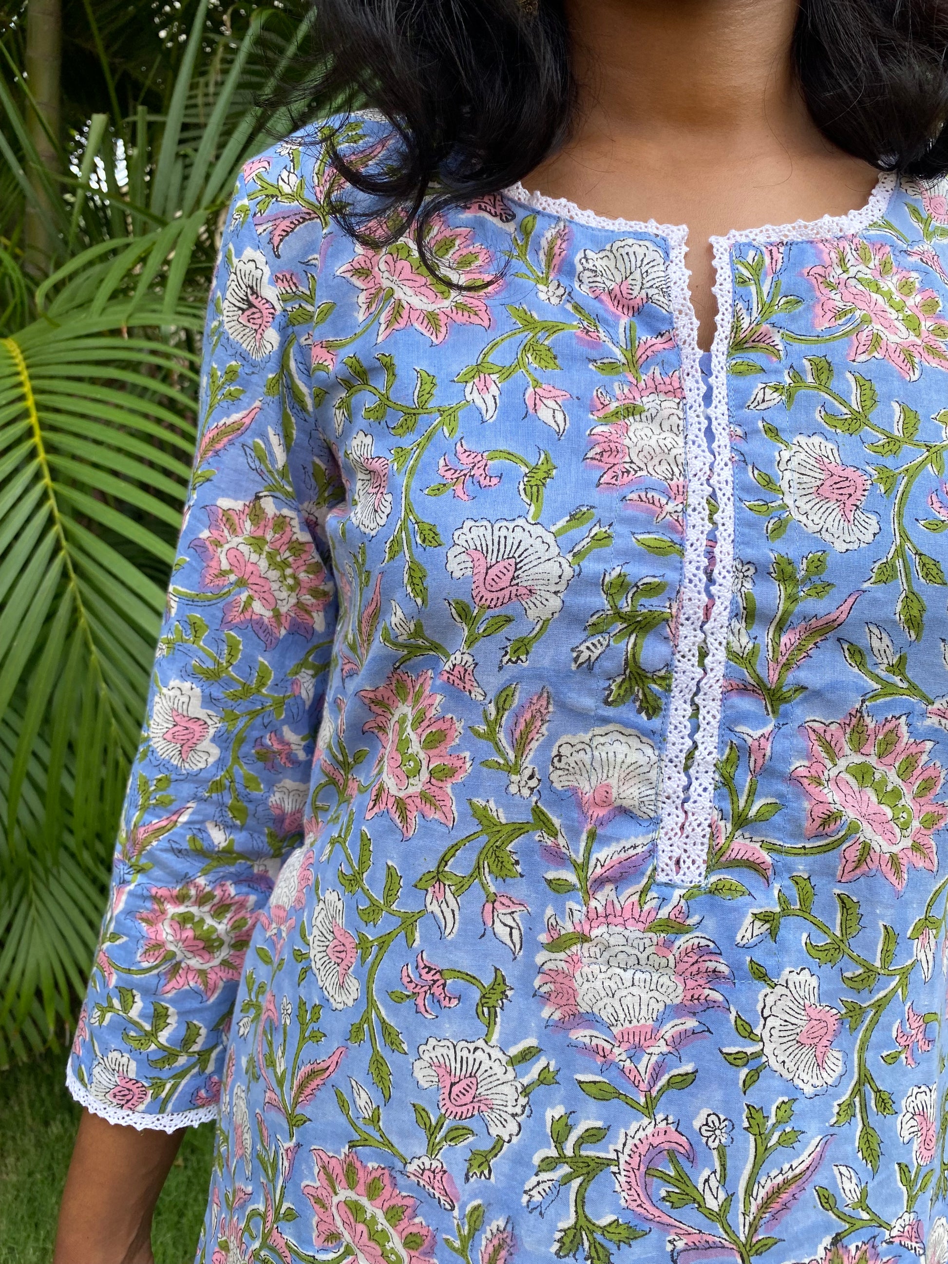 Meet Raat – a dreamy blue cotton kurta with delicate lace details at the neckline and a lovely floral print. Pair it with white pants for an effortless, chic look that’s perfect for any day!