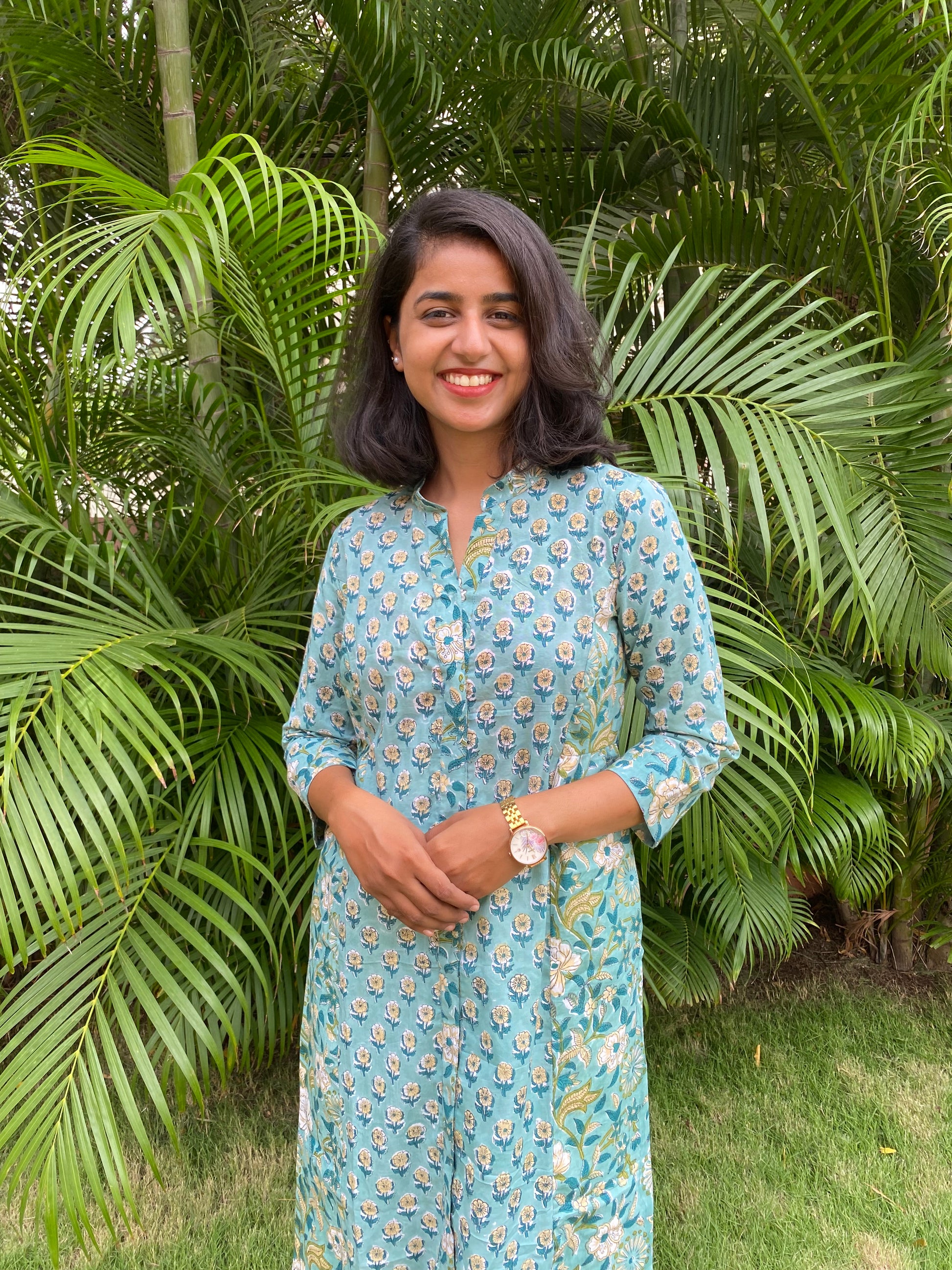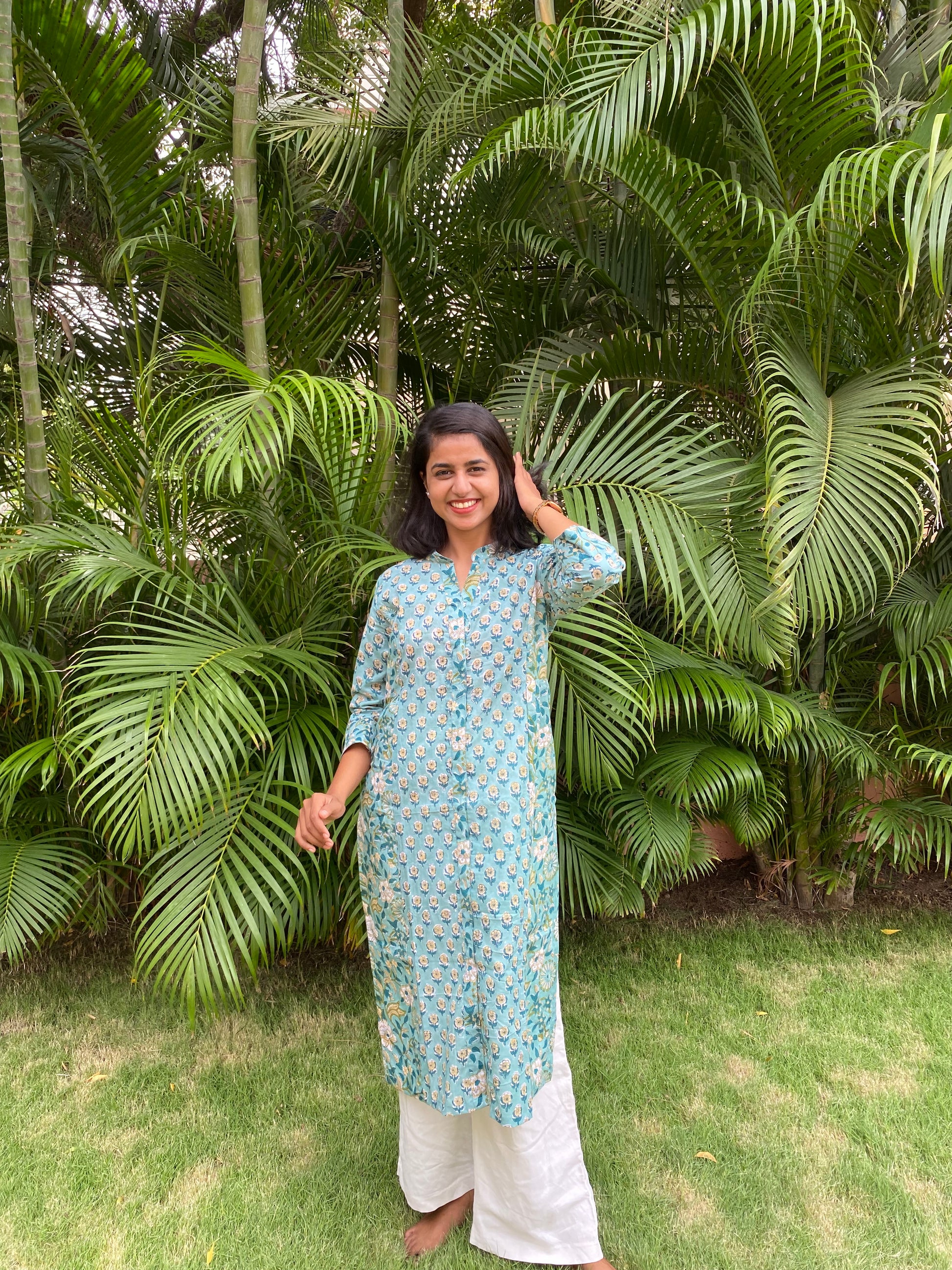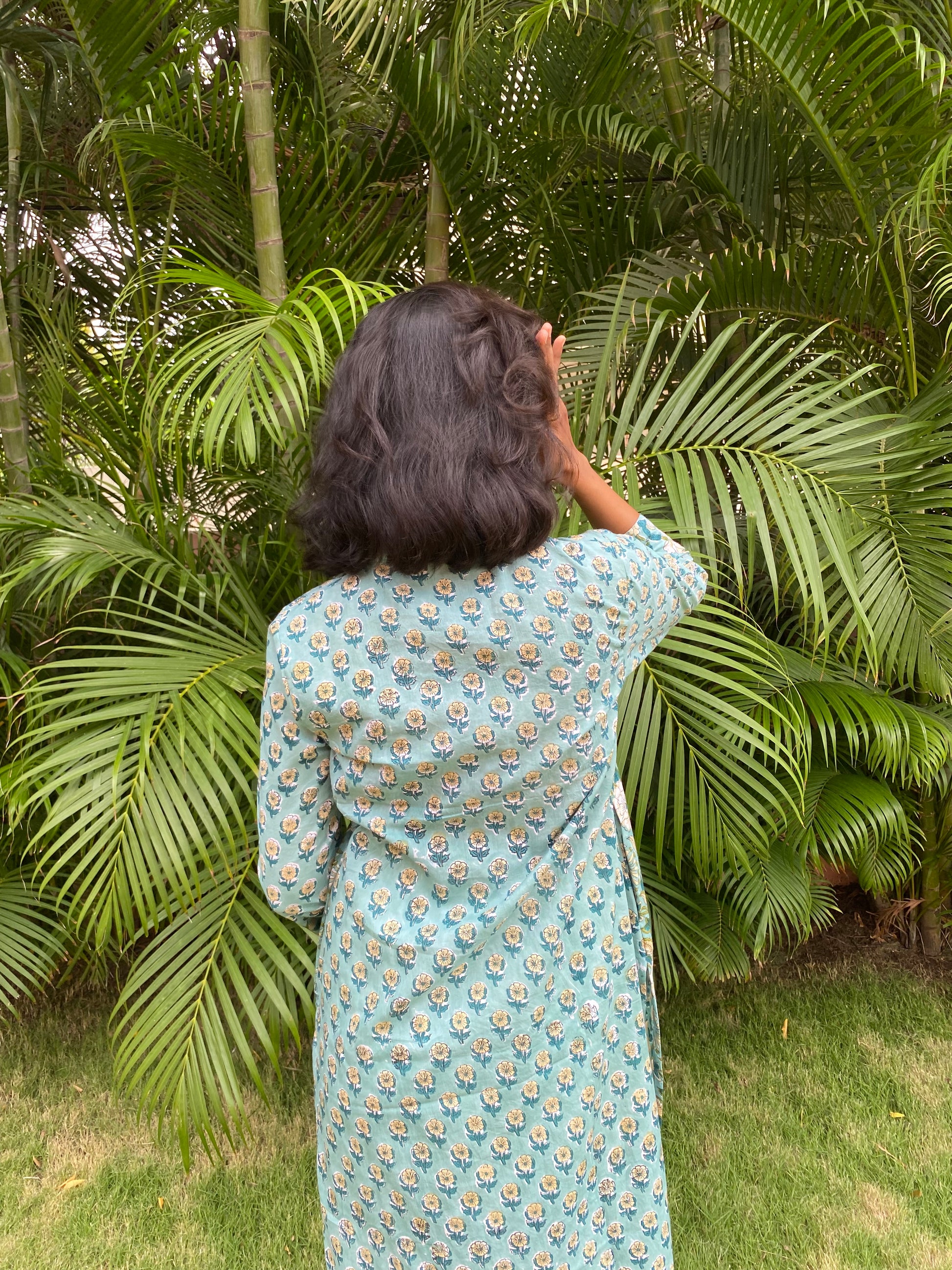 Meet the "Rangoli" kurta and pant set – a fun, festive pick for Diwali! Made from soft, breathable green cambric cotton, it's light and comfy. With playful gathered panels on the sides and a sleek collar, it’s simple yet stylish. Perfect for celebrating in comfort and style!