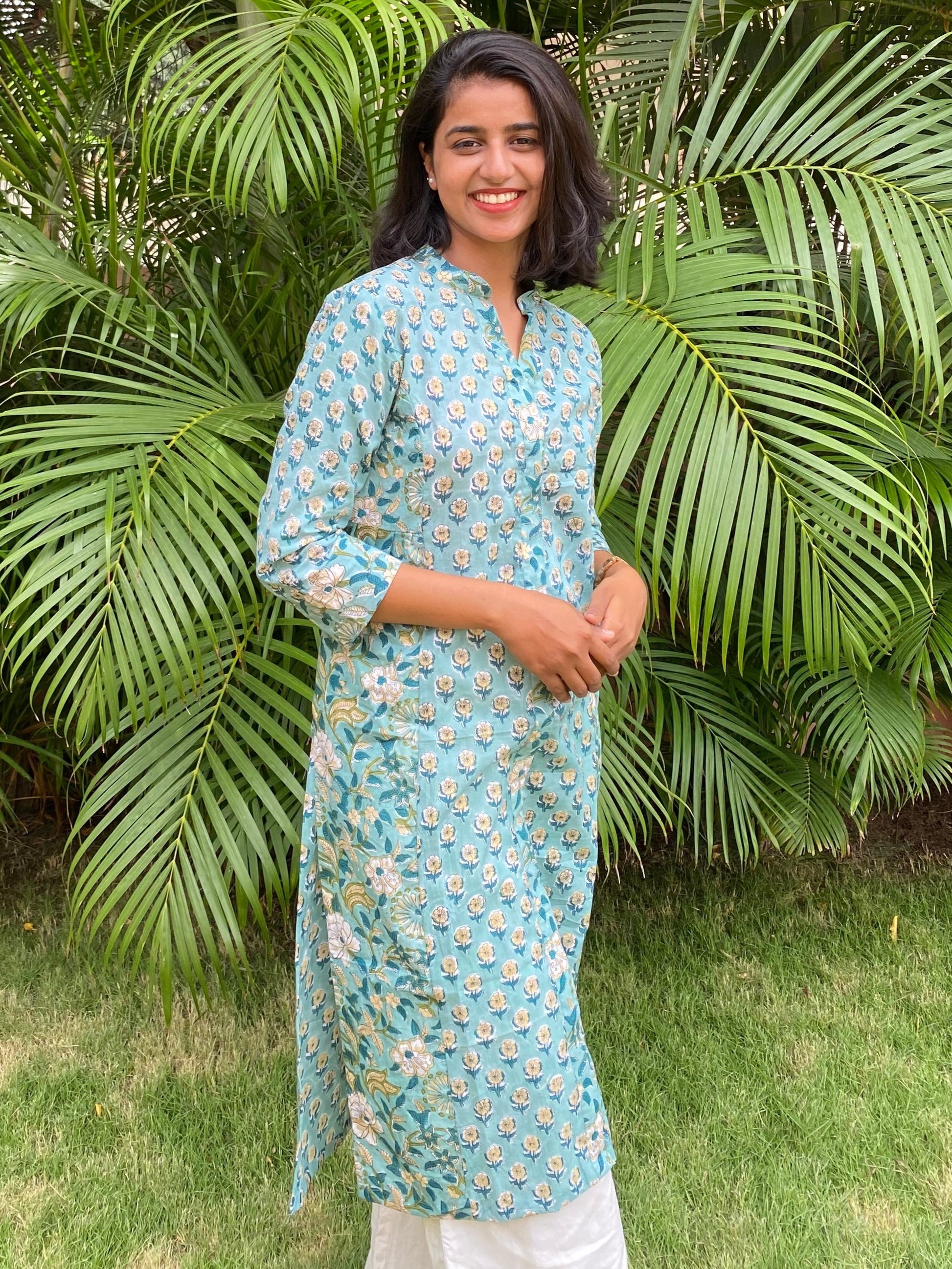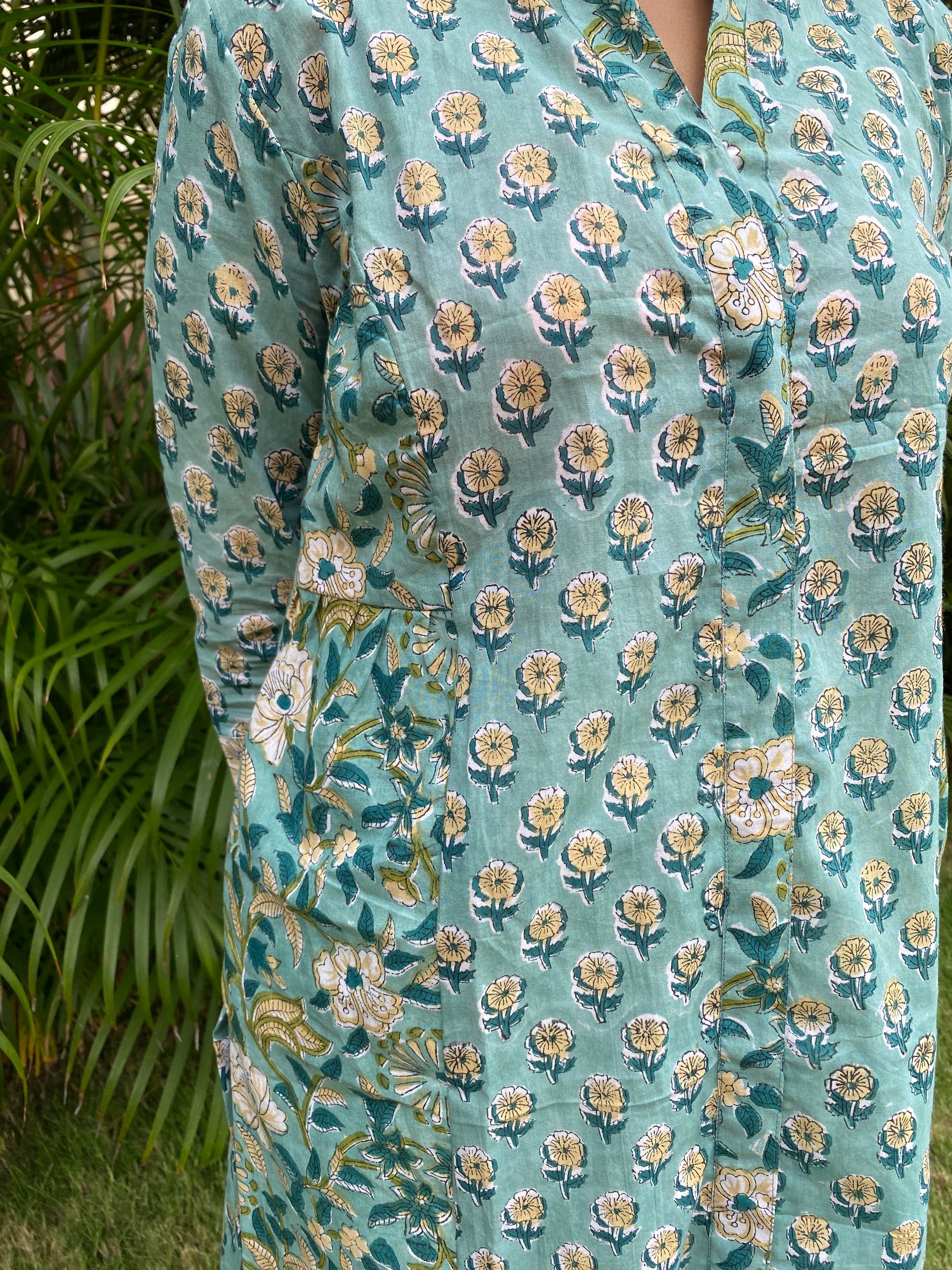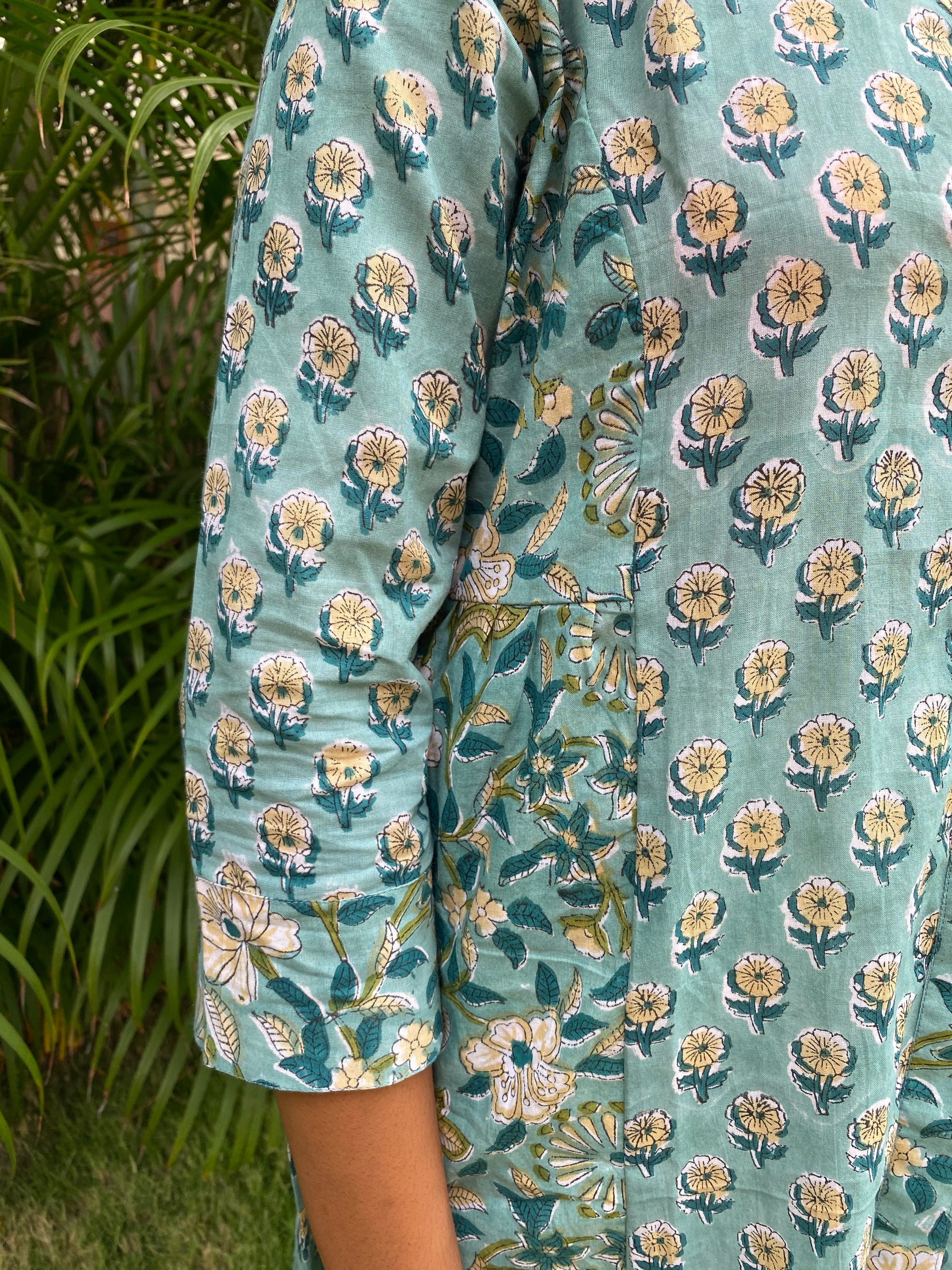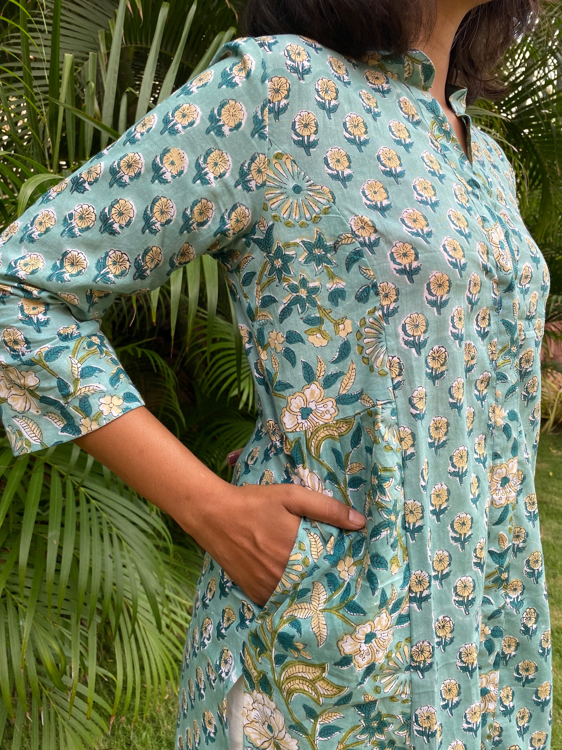 Meet the "Rangoli" kurta and pant set – a fun, festive pick for Diwali! Made from soft, breathable green cambric cotton, it's light and comfy. With playful gathered panels on the sides and a sleek collar, it’s simple yet stylish. Perfect for celebrating in comfort and style!