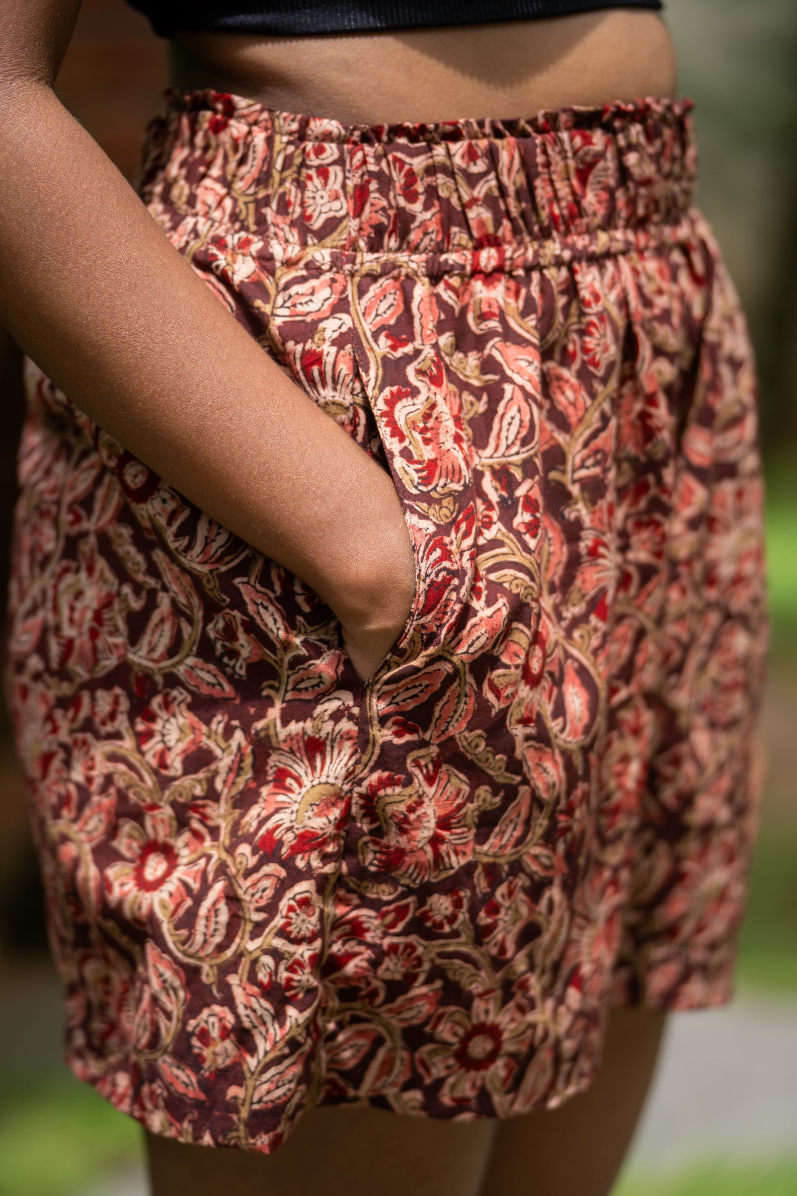 Step out in style with the Thogai Shorts, featuring functional pockets and crafted from beautiful handblock kalamkari fabric. Perfect for any occasion, these shorts blend comfort with a unique, artistic flair. Elevate your everyday look with this versatile piece that effortlessly combines practicality and fashion.